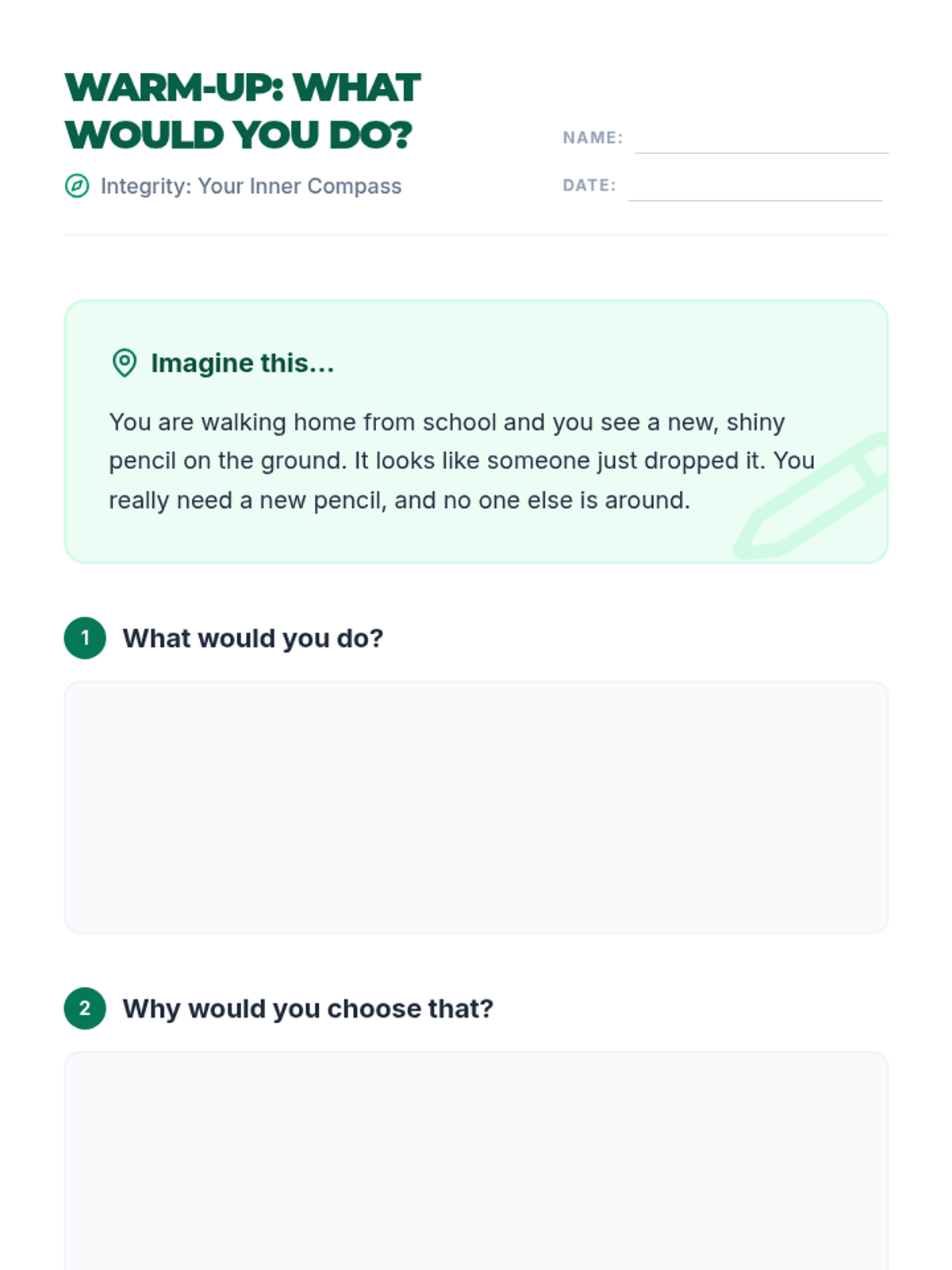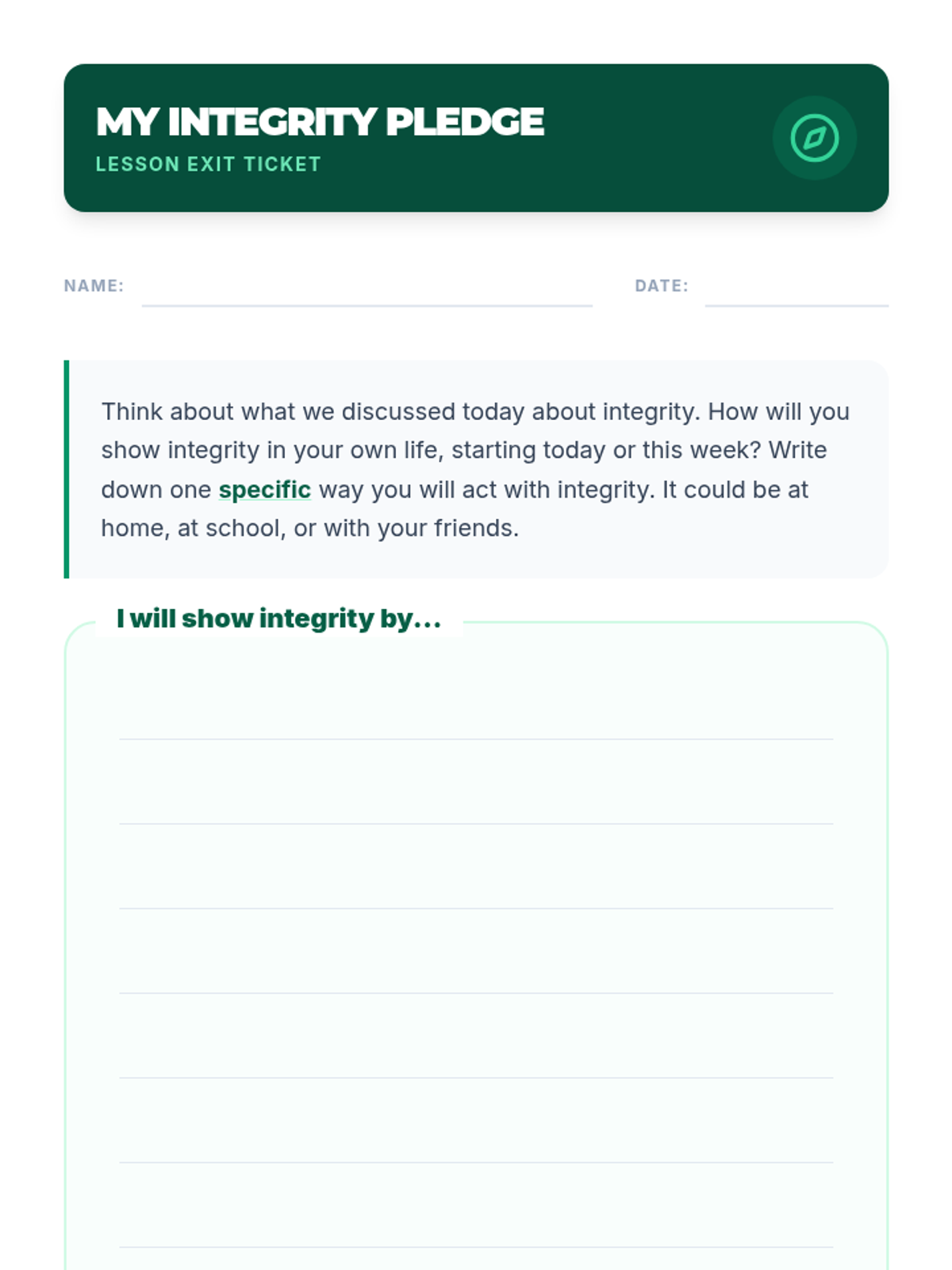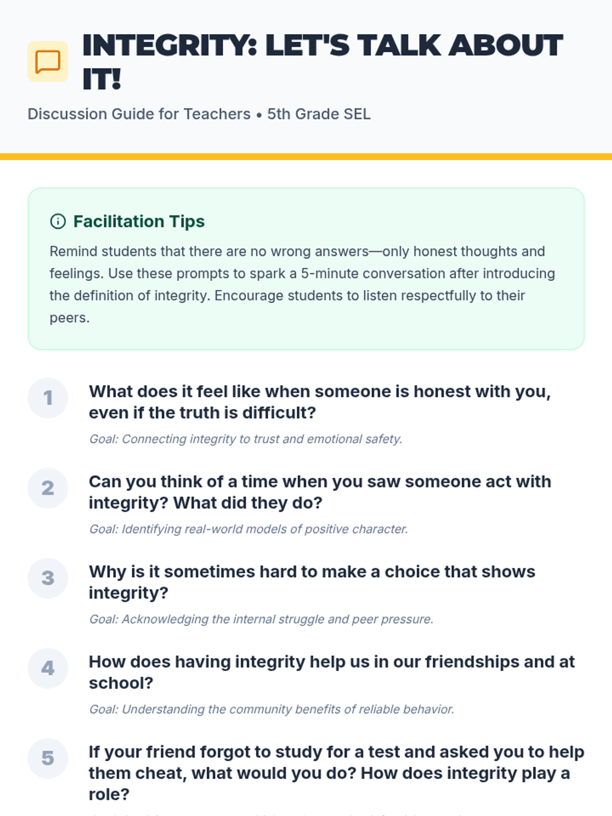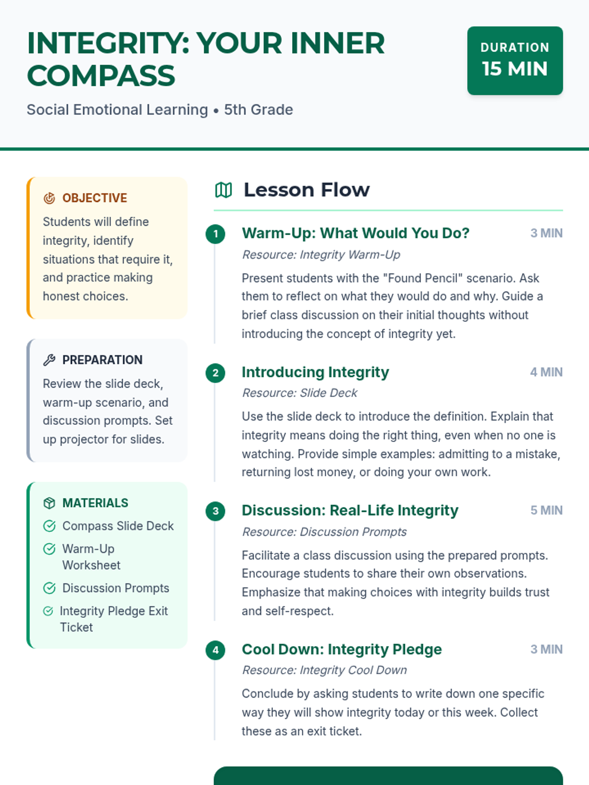 A 15-minute SEL lesson for 5th graders focused on defining integrity, recognizing its importance through real-life scenarios, and making a personal commitment to honest choices.