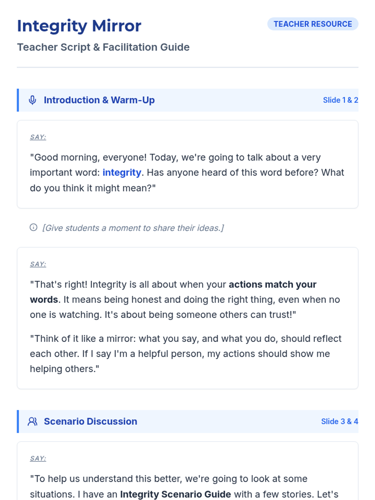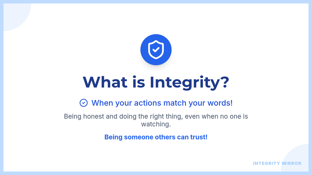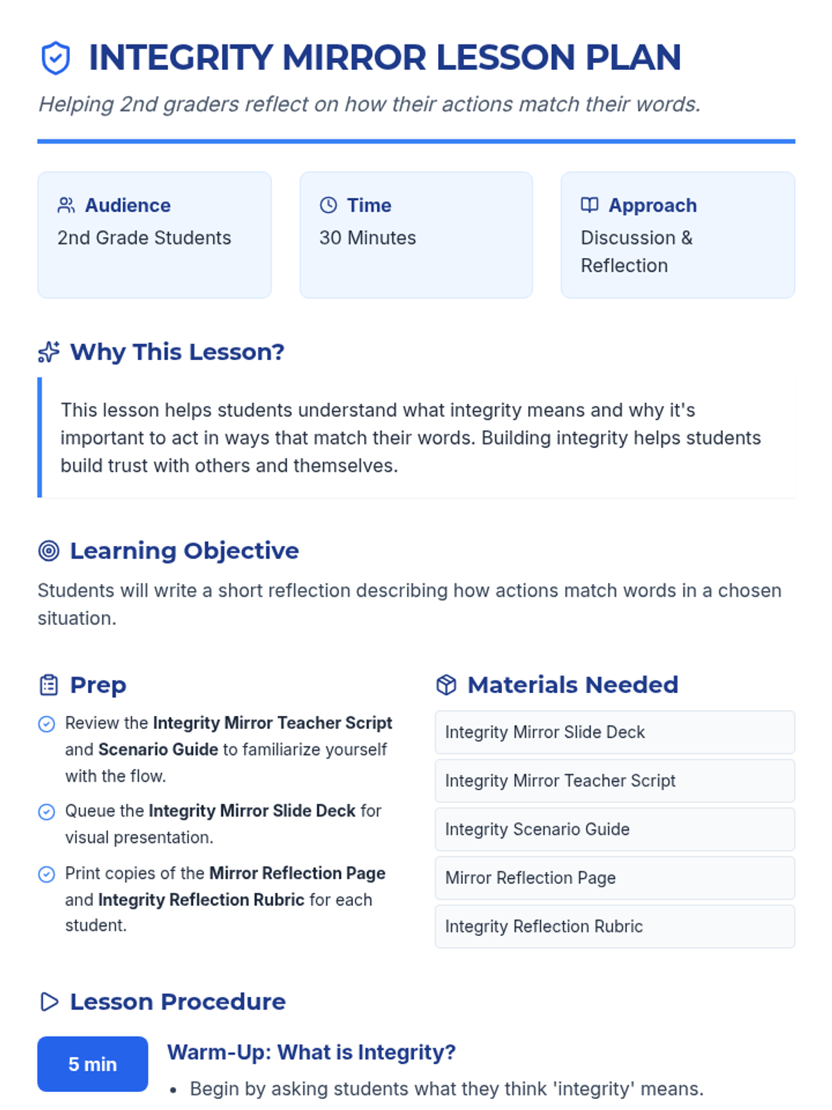 A 30-minute 2nd-grade lesson on integrity, focusing on the alignment between actions and words through scenario discussions and personal reflection.