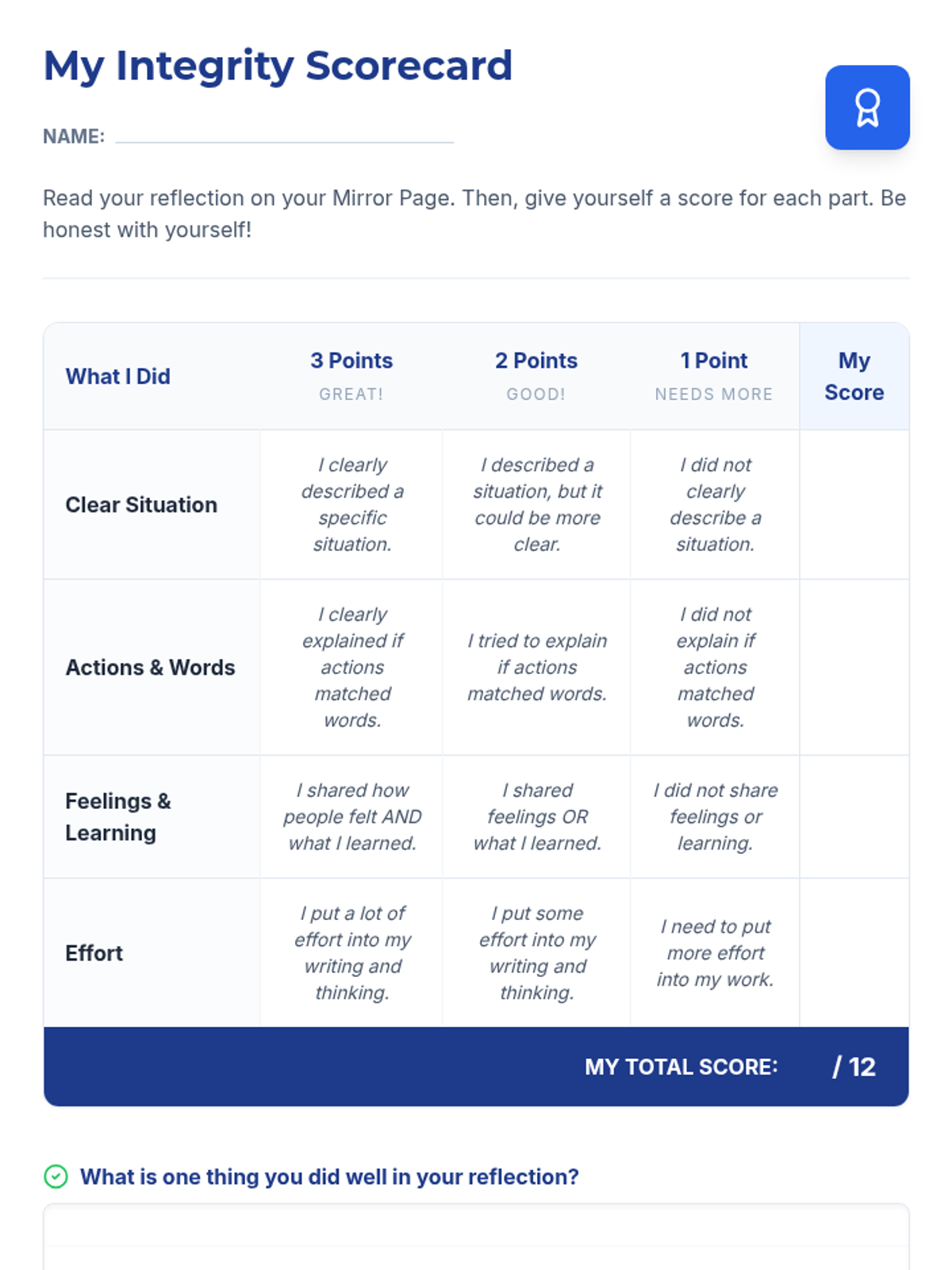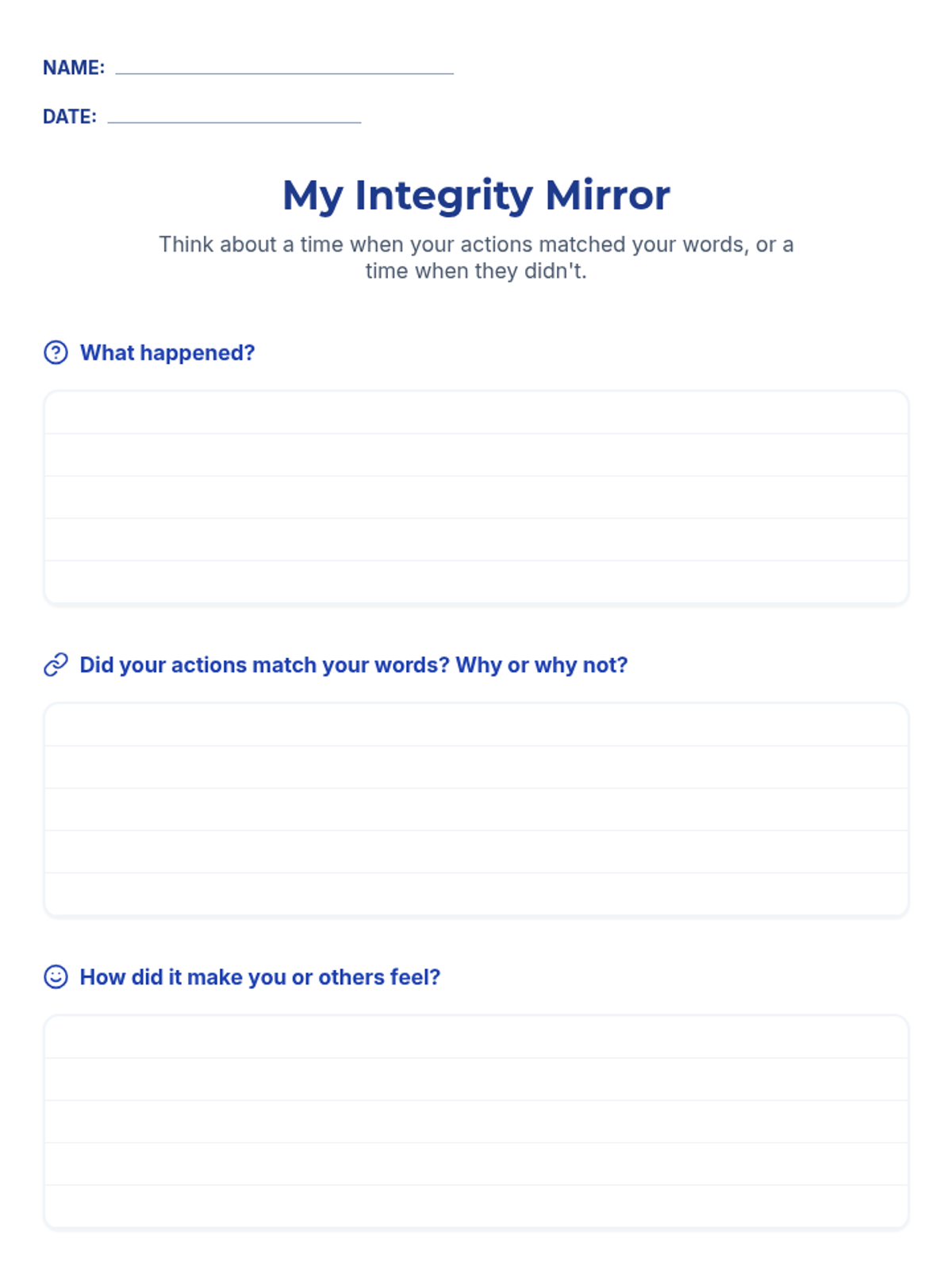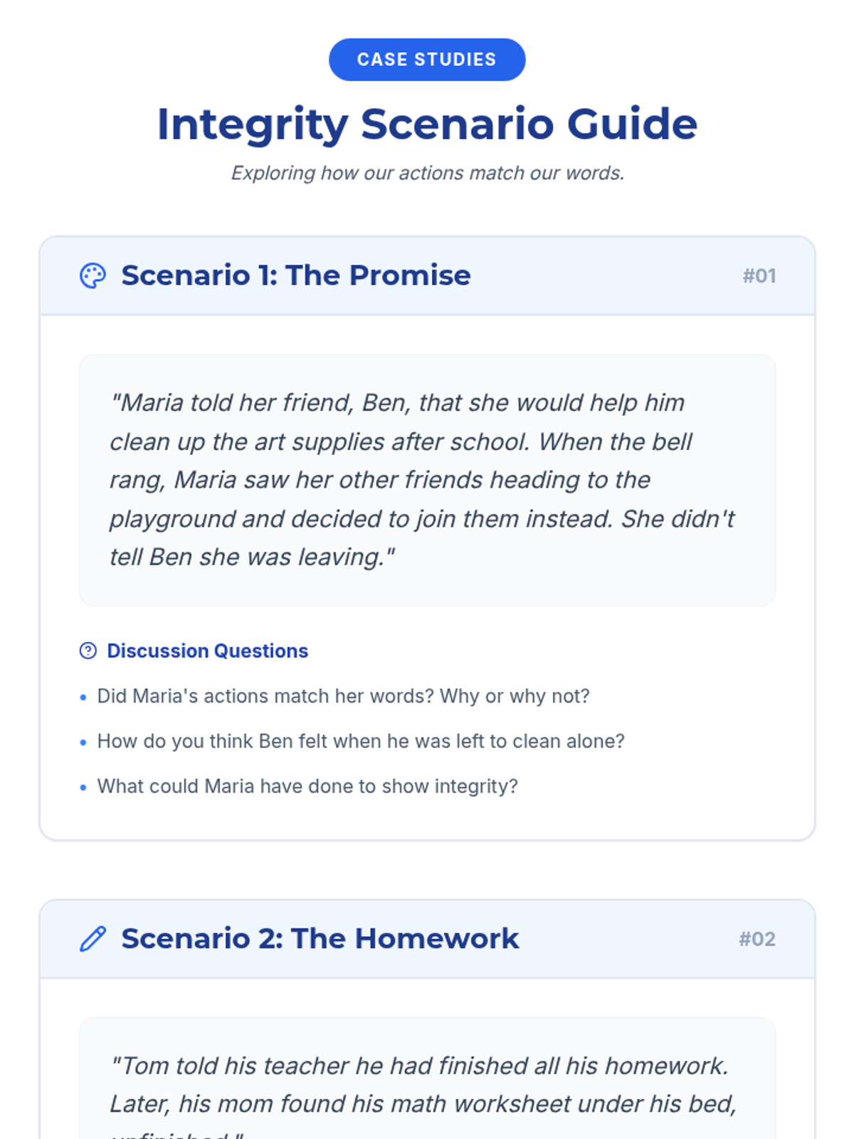 A 30-minute 2nd-grade lesson on integrity, focusing on the alignment between actions and words through scenario discussions and personal reflection.