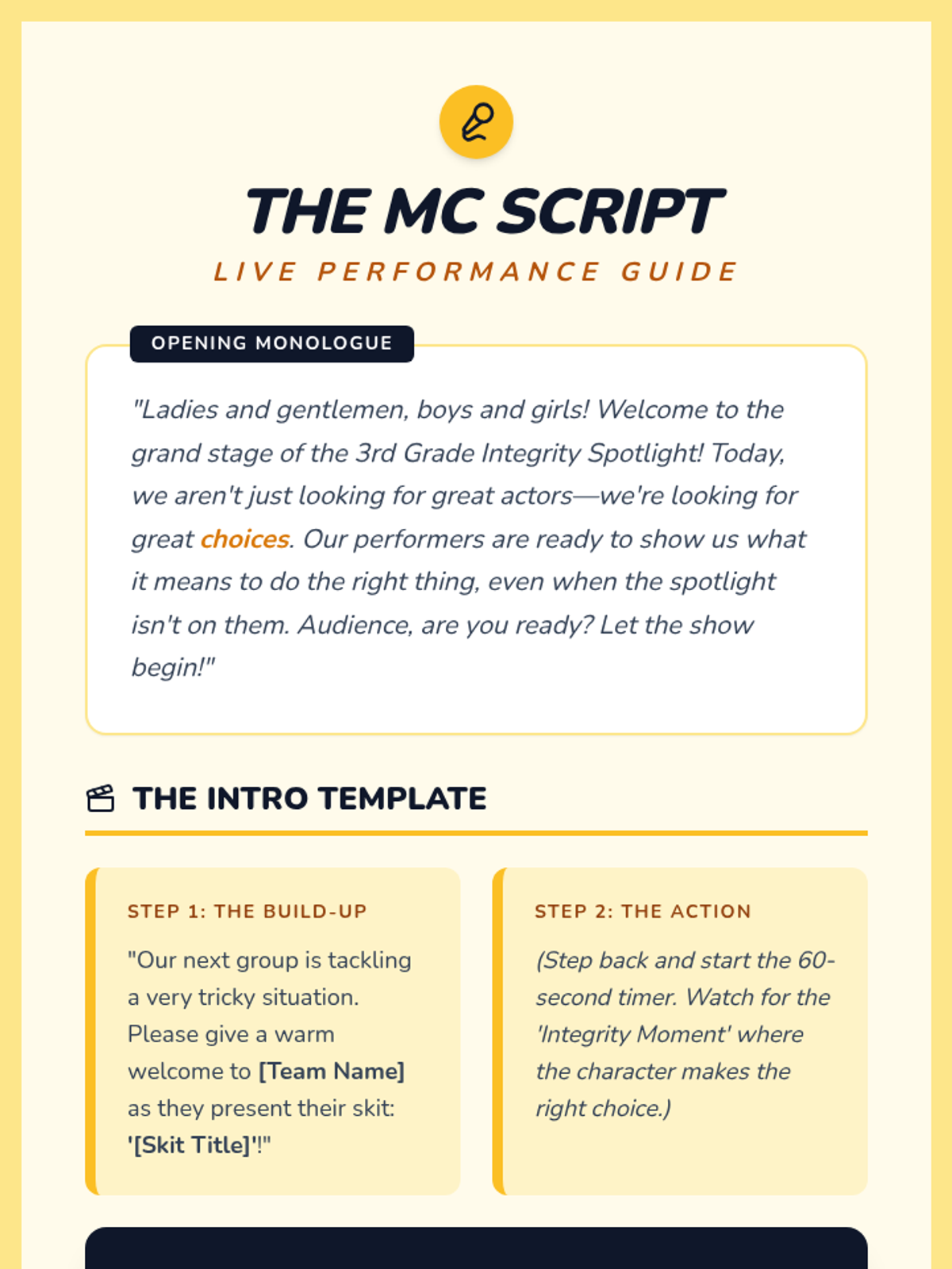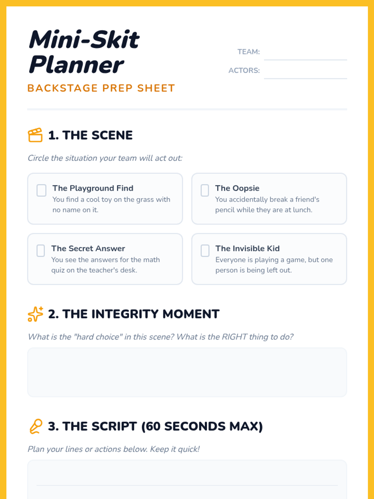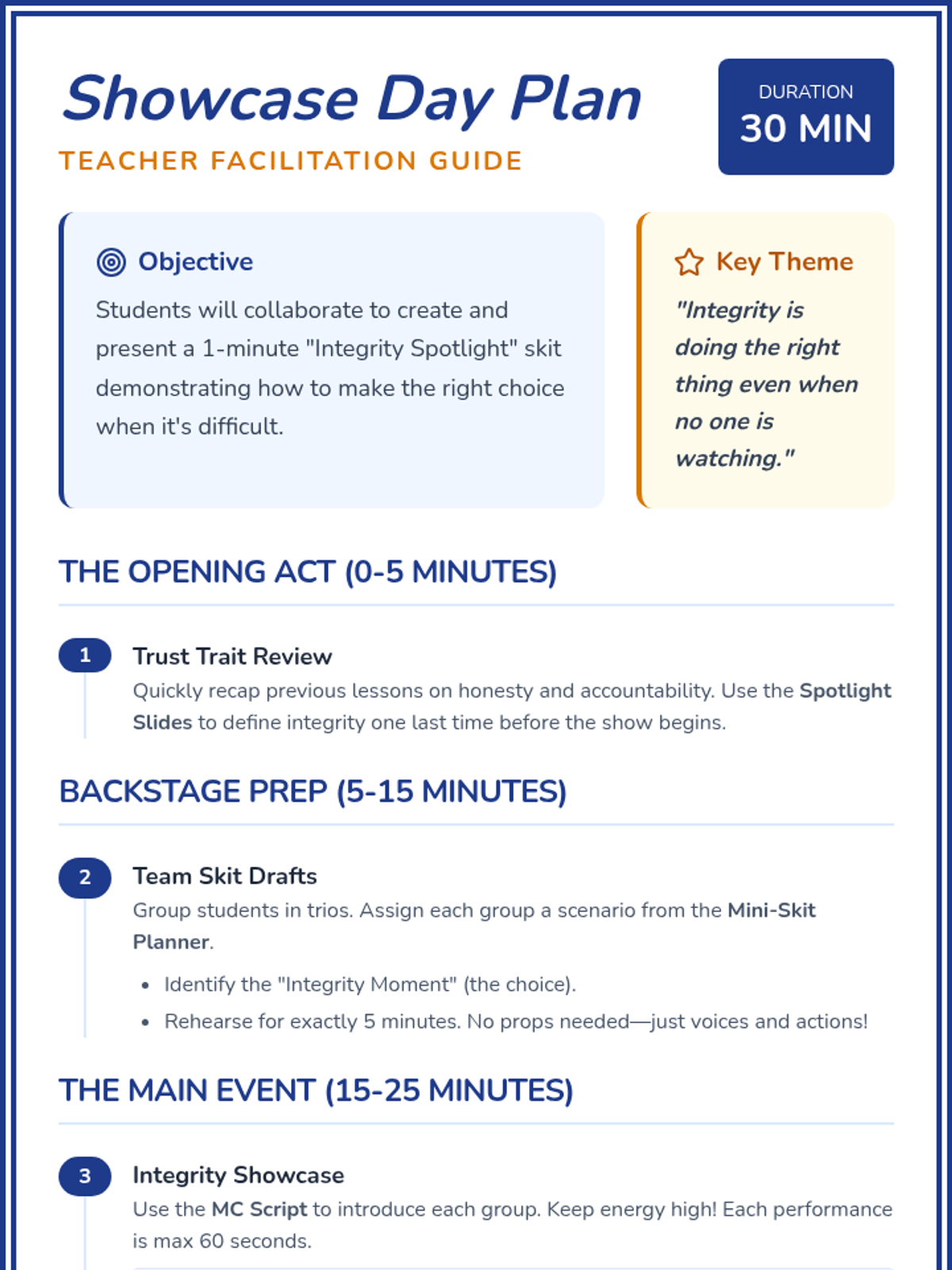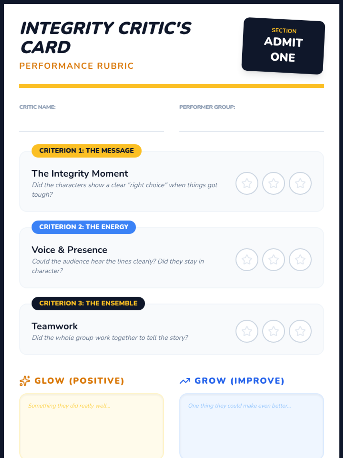 A high-energy, performance-based lesson where 3rd-grade students demonstrate their understanding of integrity through role-play, peer feedback, and a showcase.