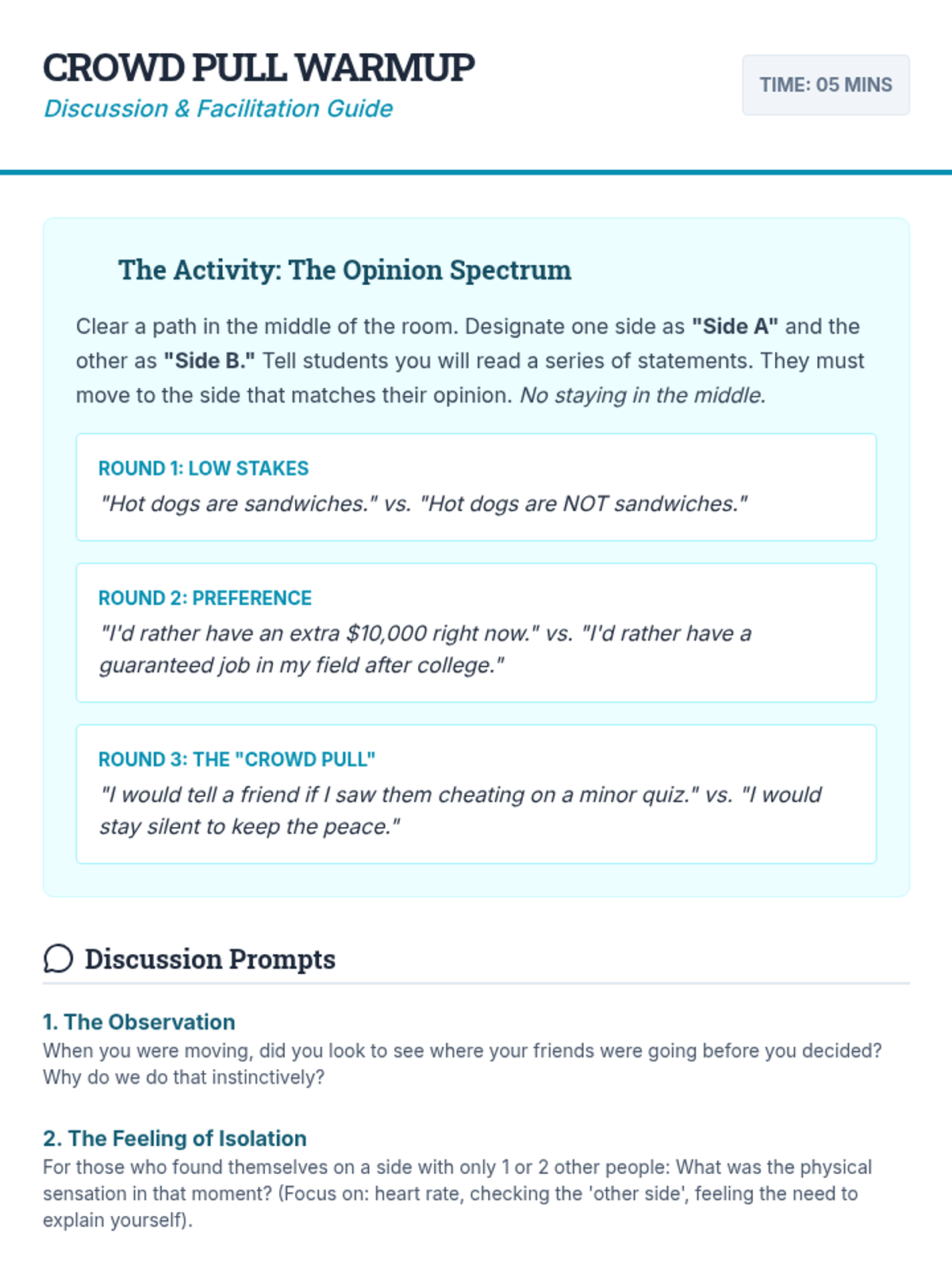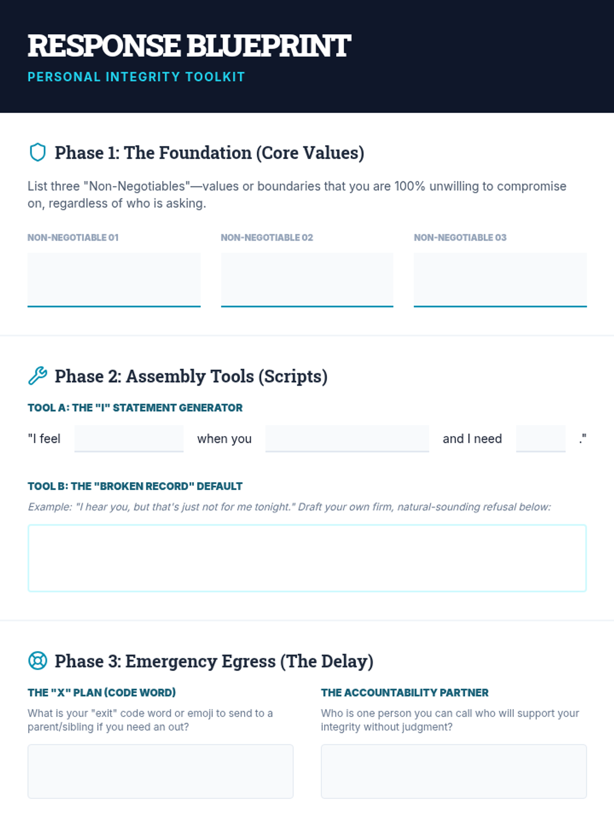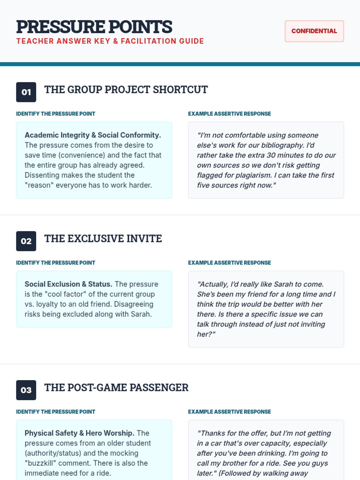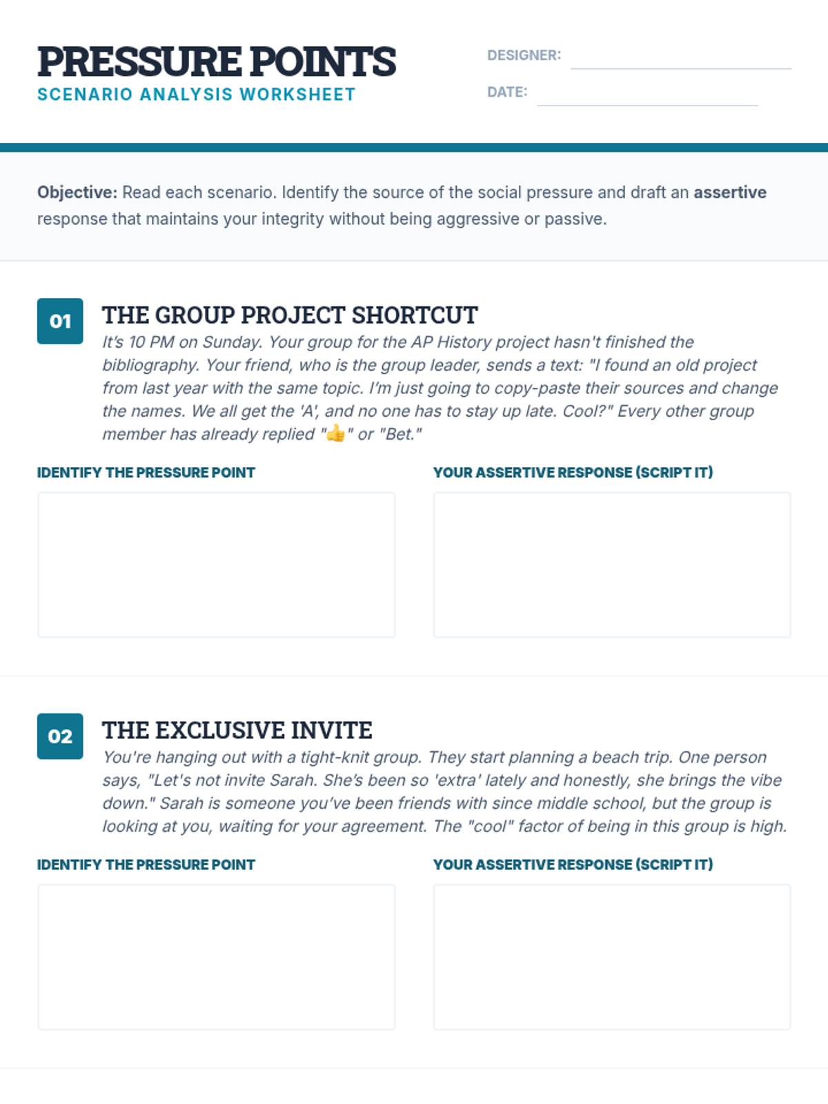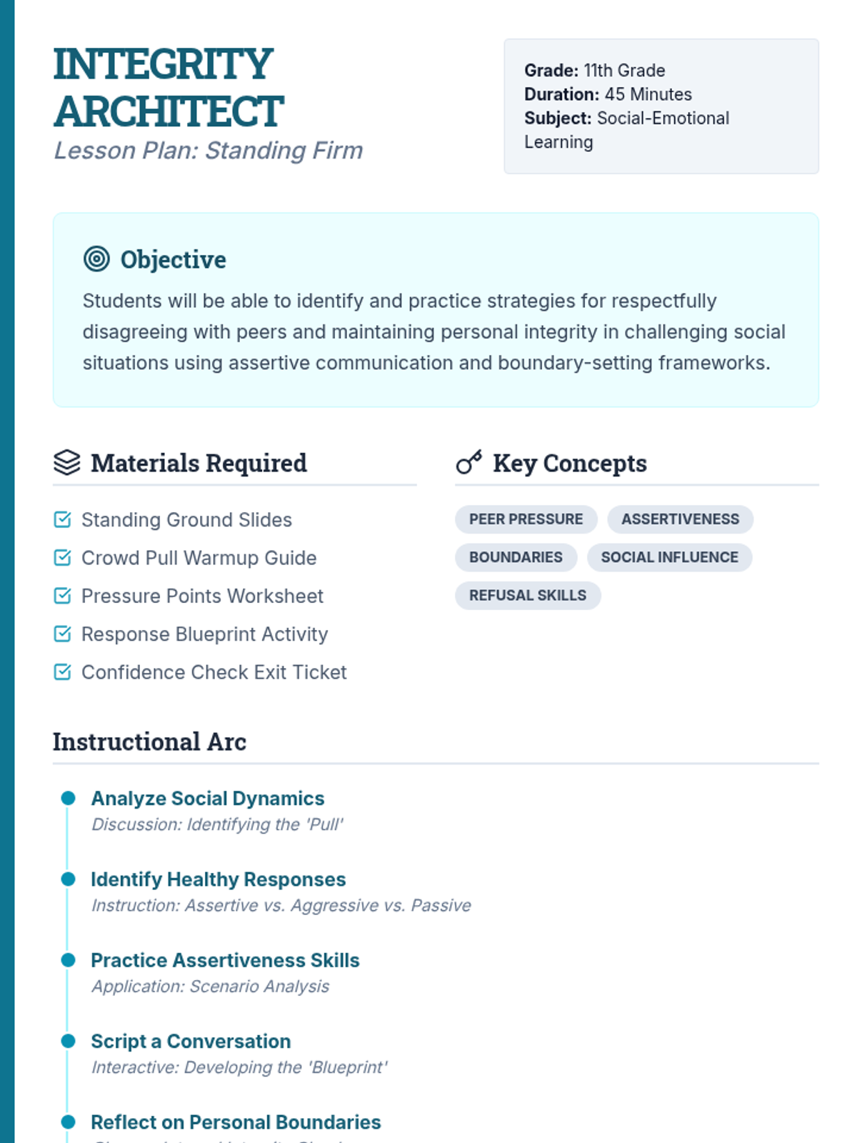 This lesson empowers 11th-grade students to navigate the complex social dynamics of peer pressure and disagreement while maintaining their personal integrity through assertive communication and boundary-setting.