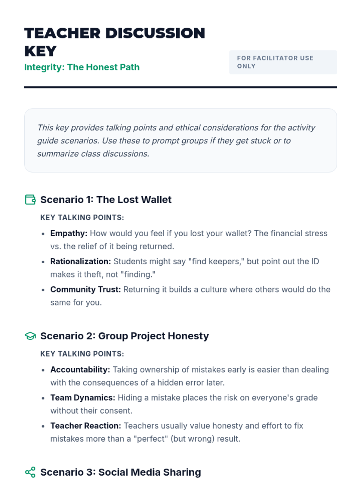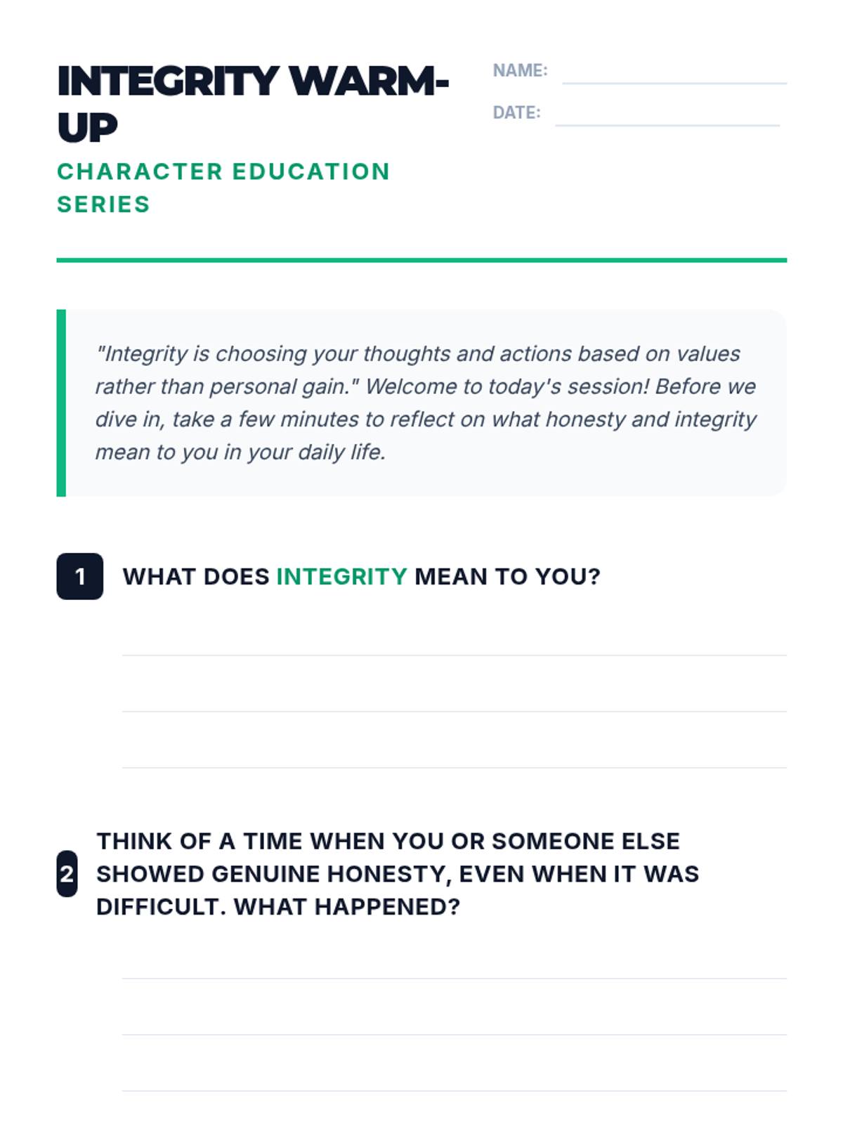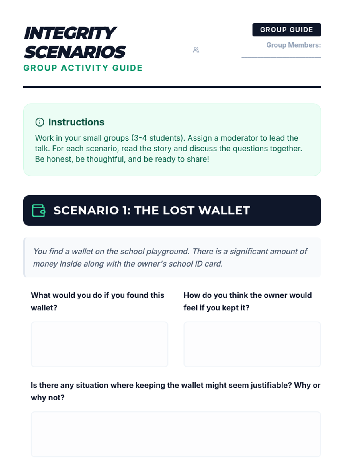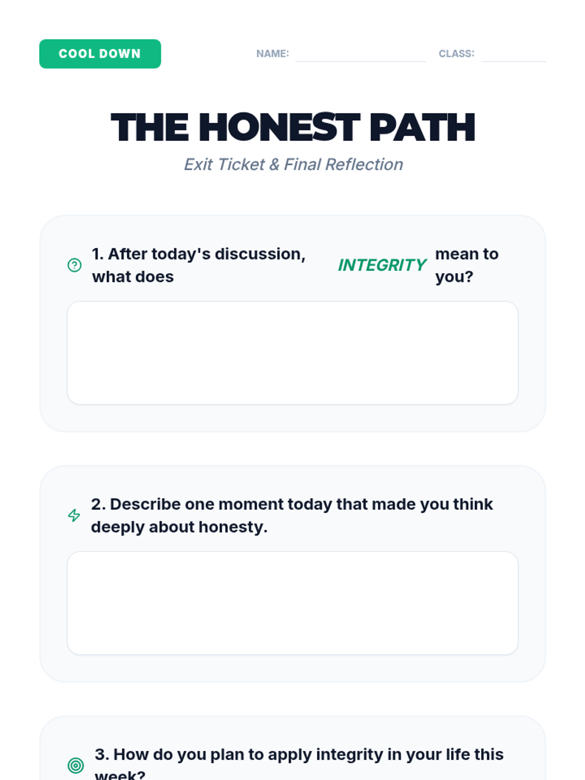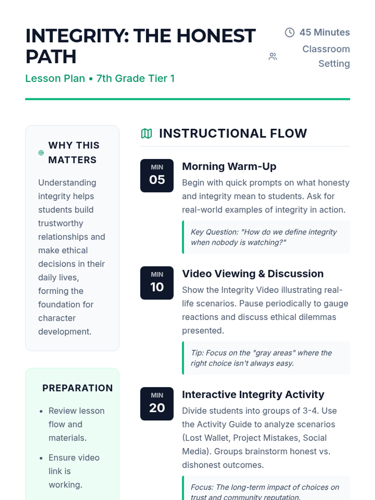 A 45-minute lesson for 7th graders exploring the importance of integrity and honesty through real-life scenarios, video analysis, and reflective discussion.