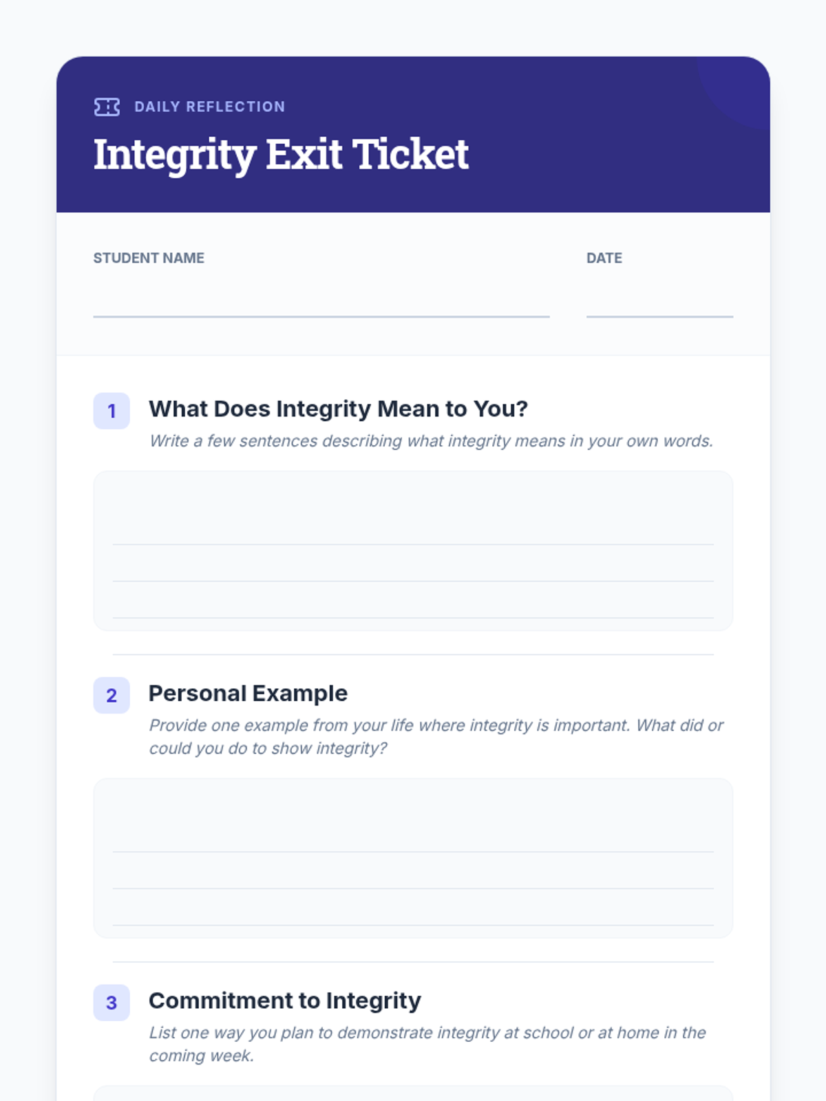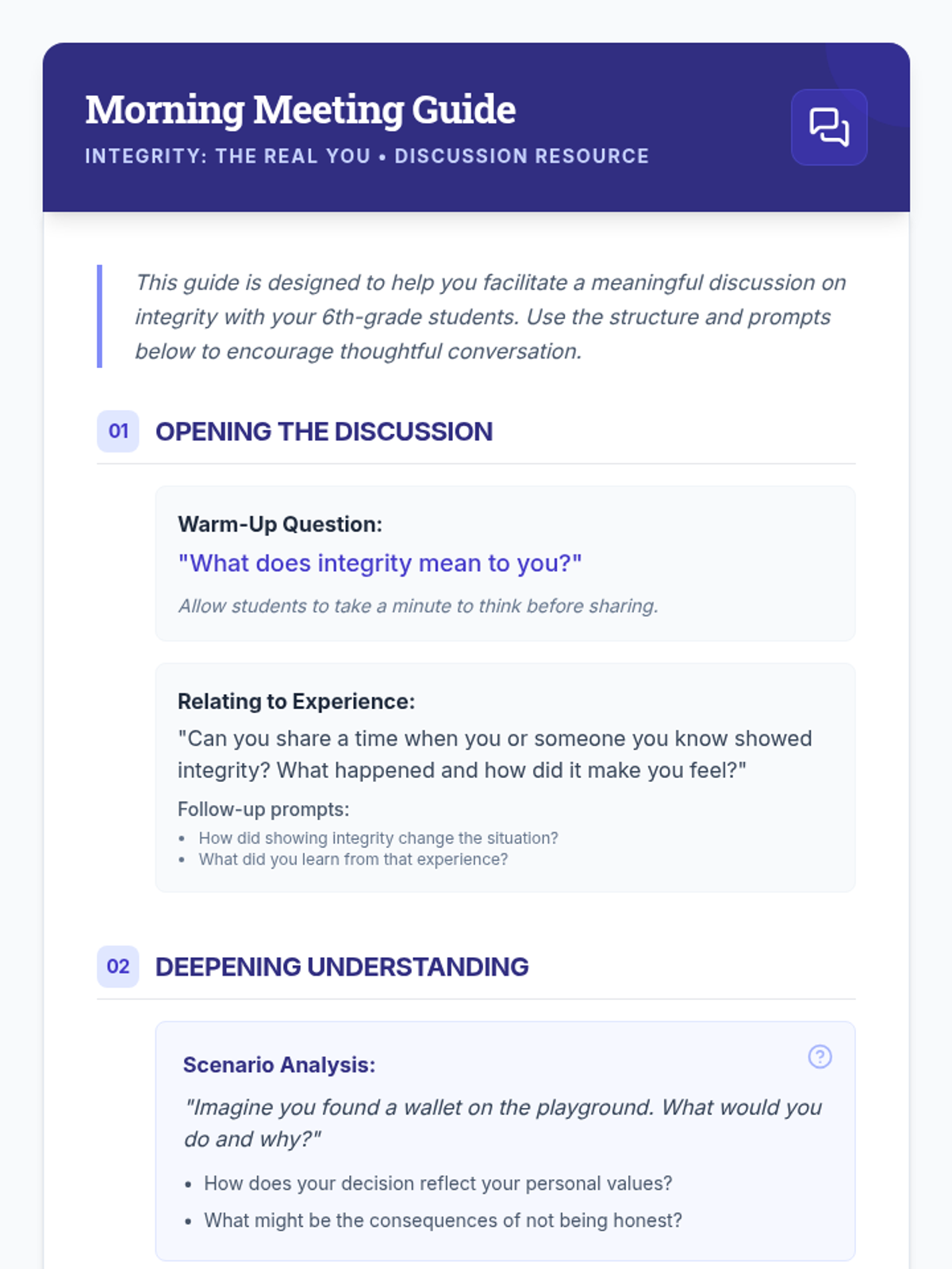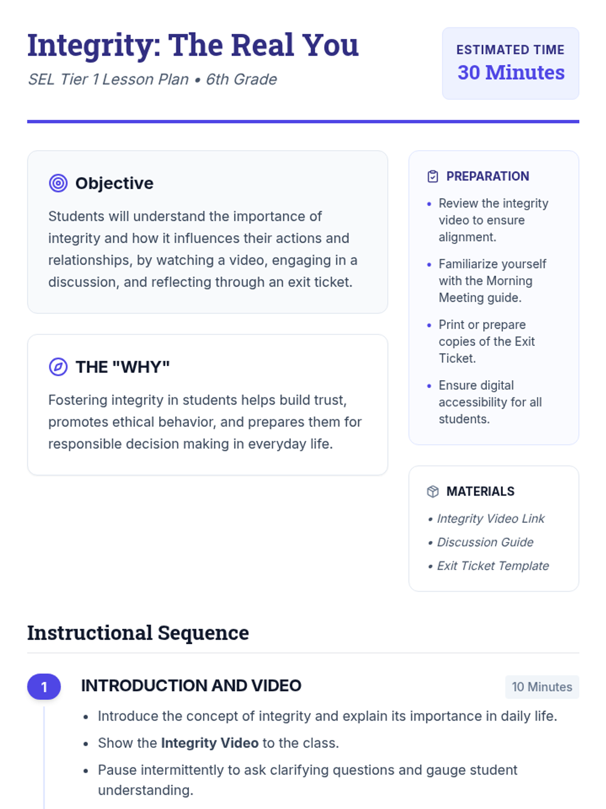 A Tier 1 SEL lesson for 6th graders exploring the concept of integrity through video, discussion, and reflective writing to foster honesty and trustworthiness.