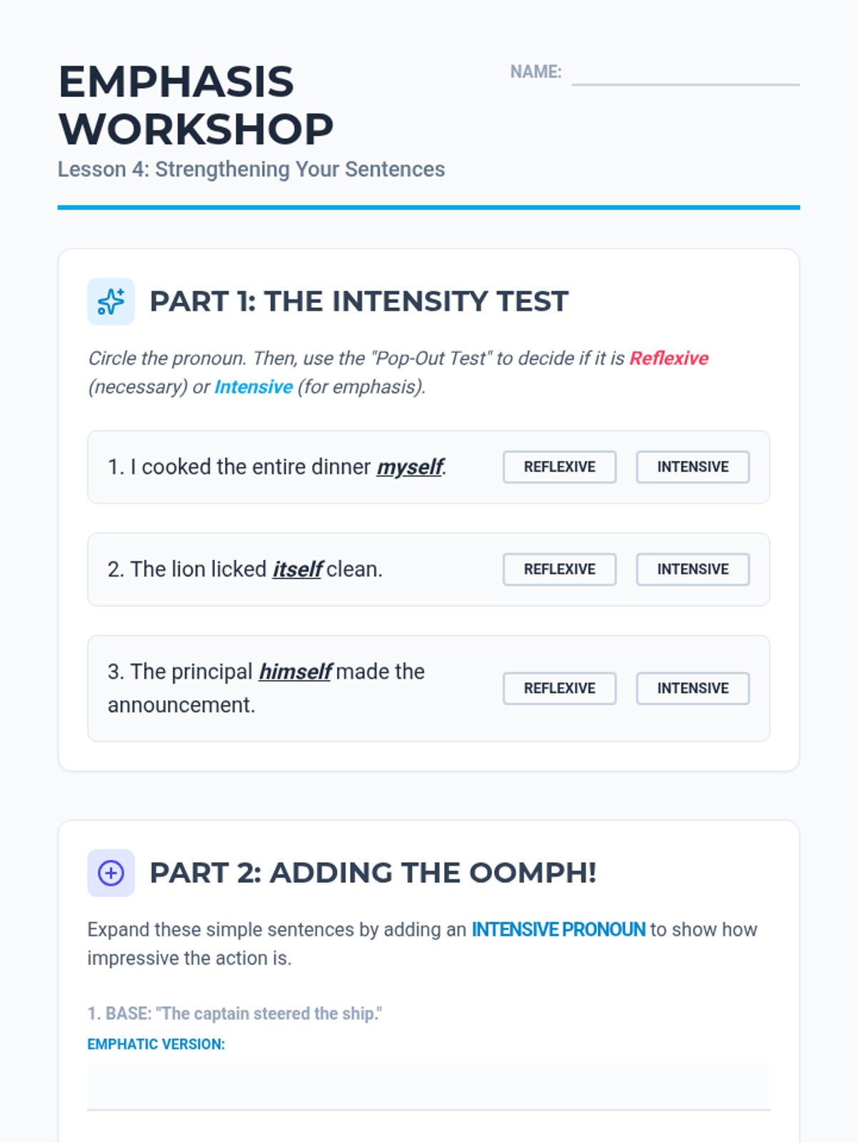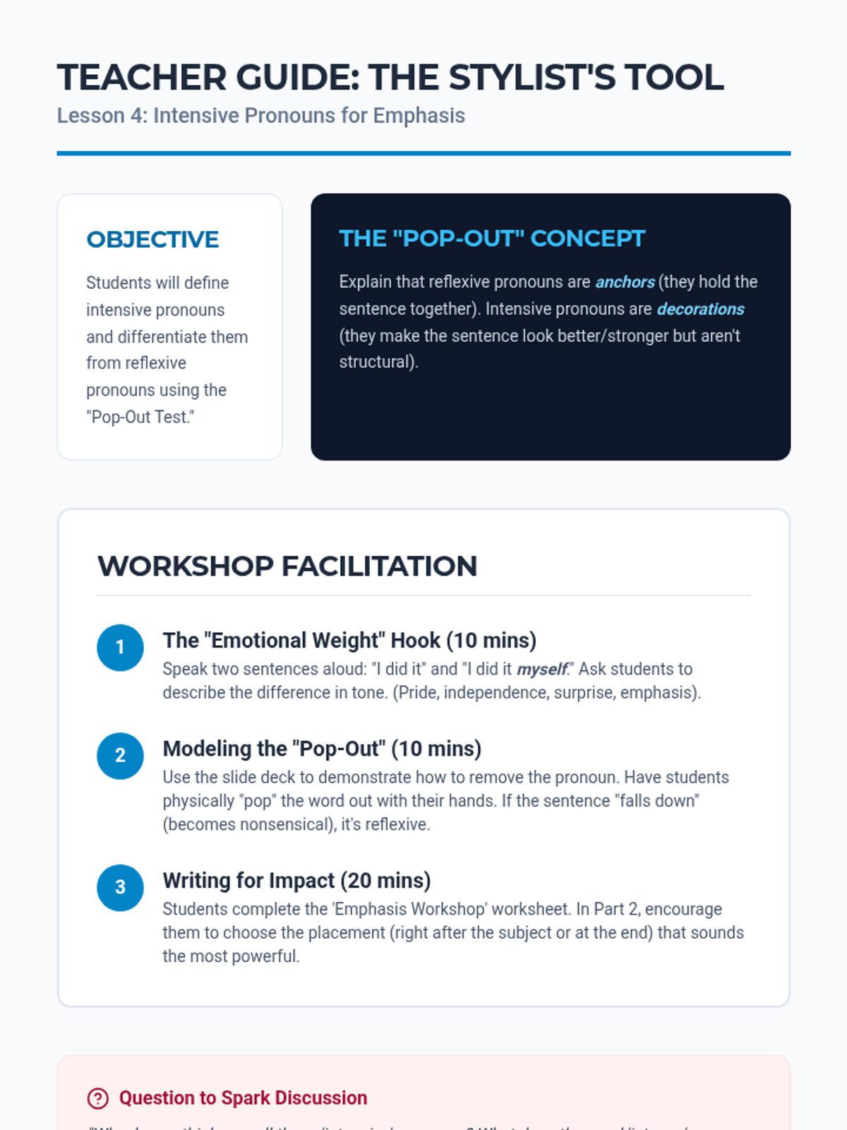 Students explore the stylistic use of intensive pronouns for emphasis, learning to distinguish them from reflexive pronouns by checking if the sentence remains complete without them.