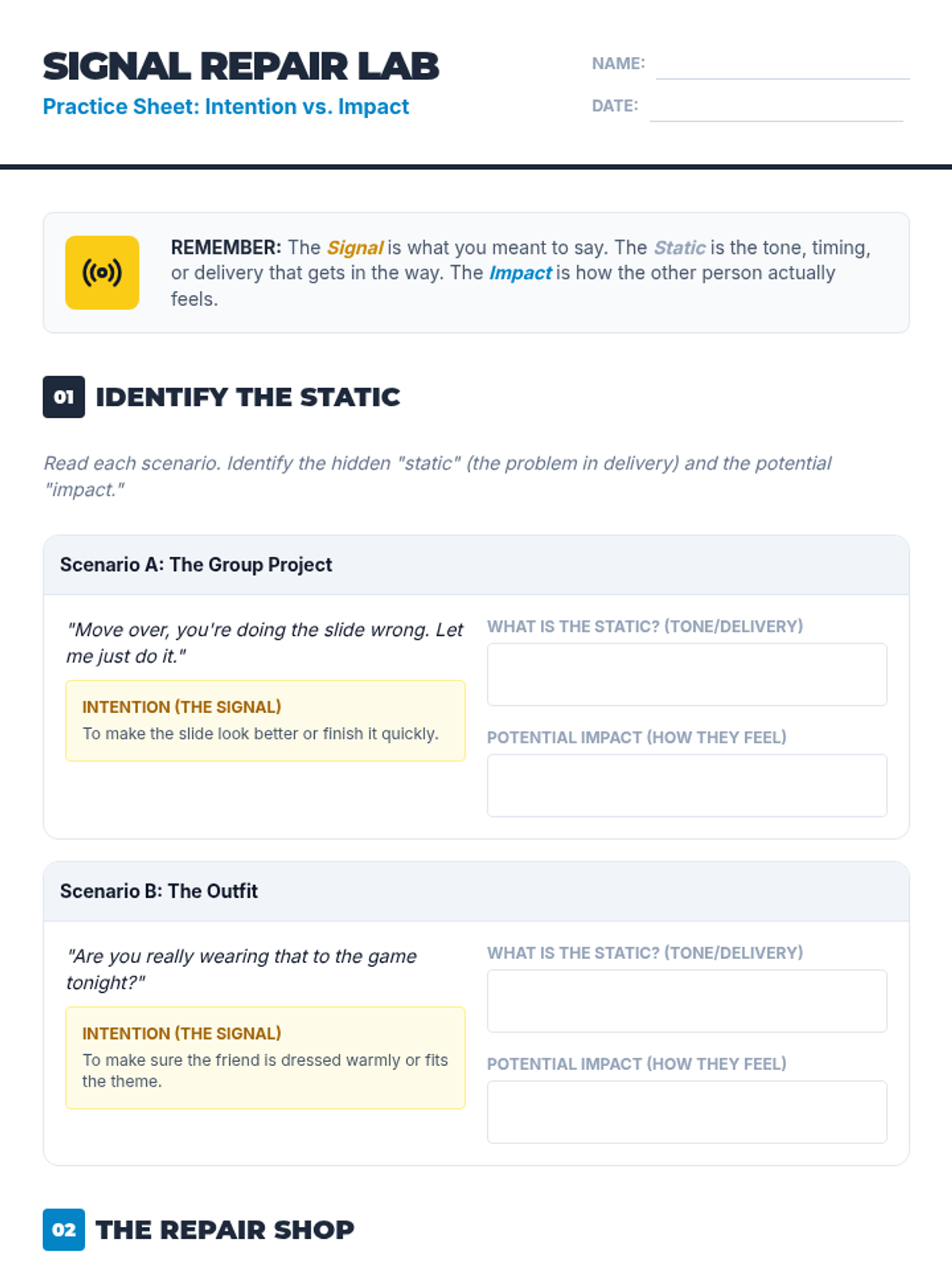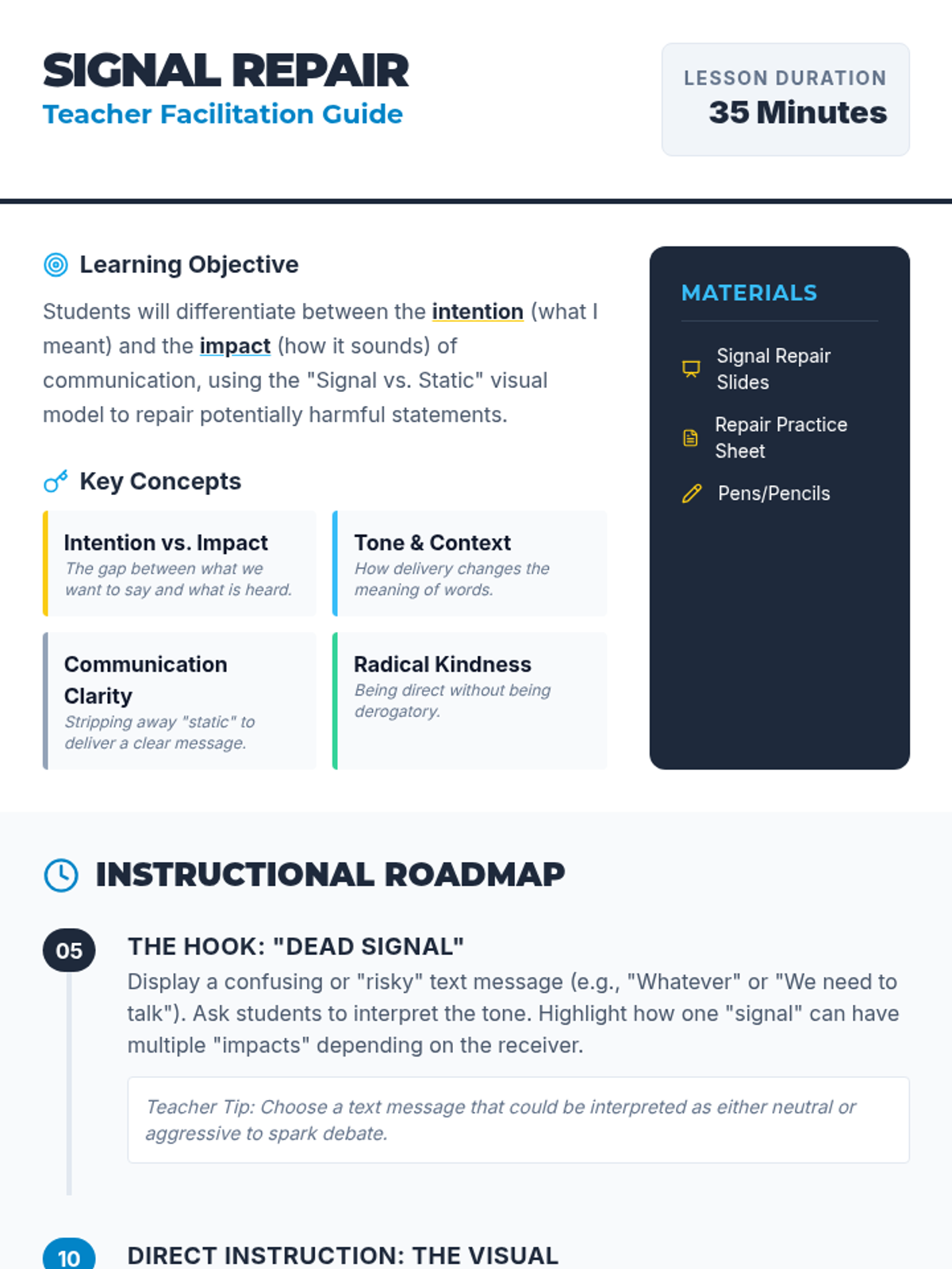 A lesson focused on helping 9th-grade students bridge the gap between their intentions and the actual impact of their words, using a 'Signal vs. Static' communication model.