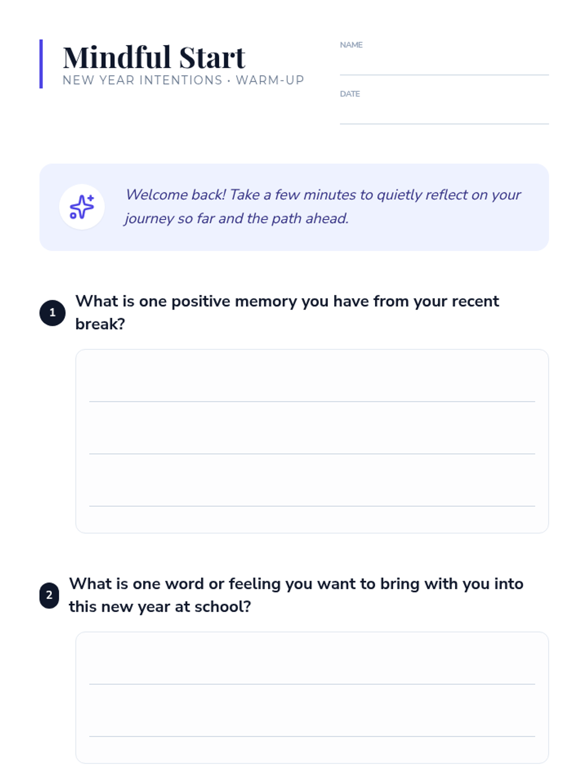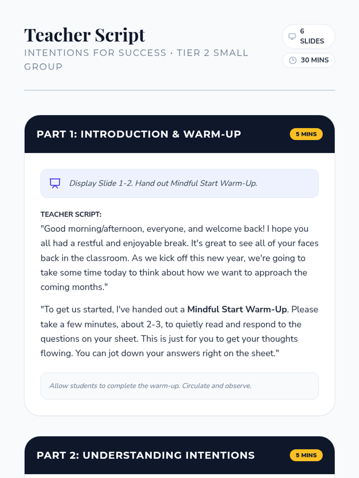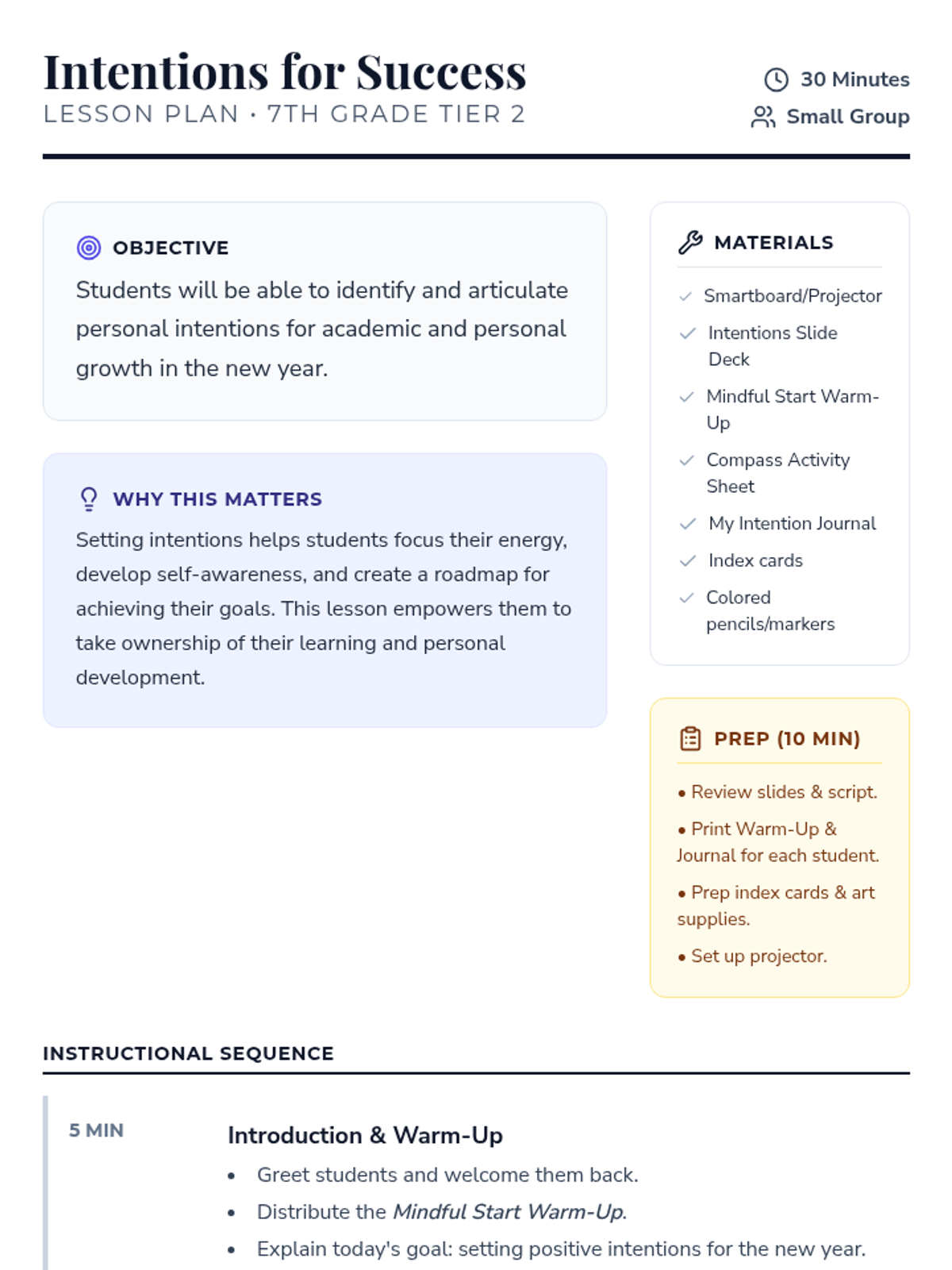 A 30-minute Tier 2 small group lesson for 7th-grade students focused on setting mindful intentions for the new year to foster a positive mindset and personal growth.