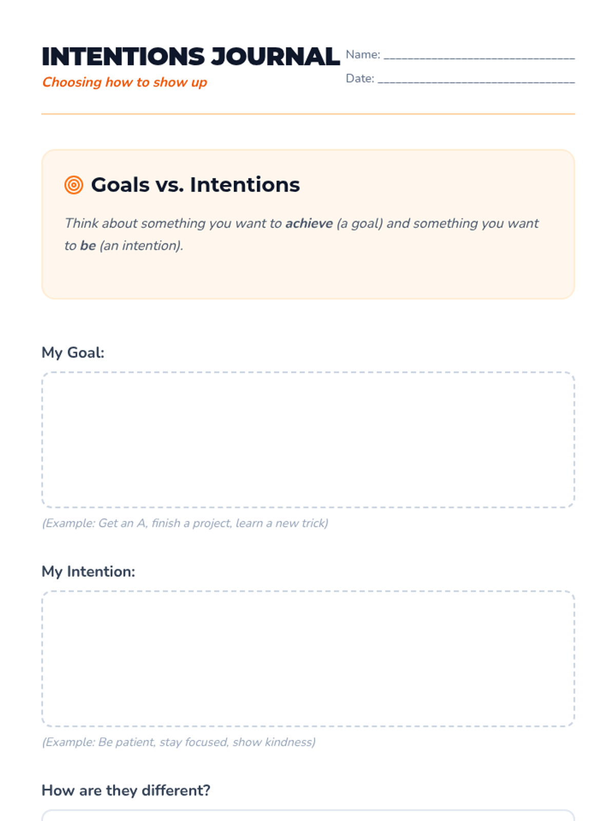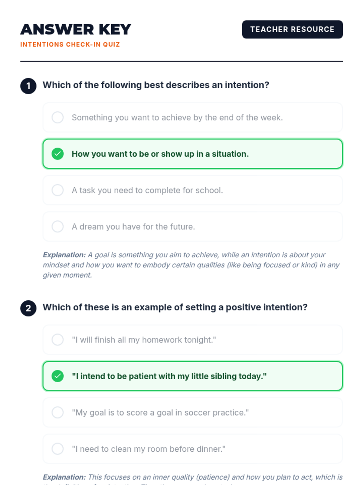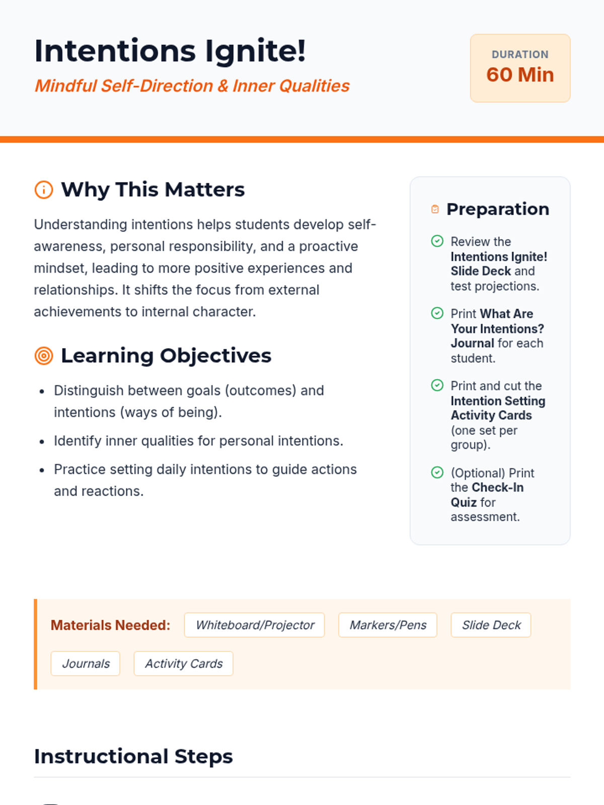 A 60-minute lesson for 4th-6th graders on setting positive intentions to guide actions and behaviors. Students learn to distinguish intentions from goals and practice 'showing up' with mindful purpose.