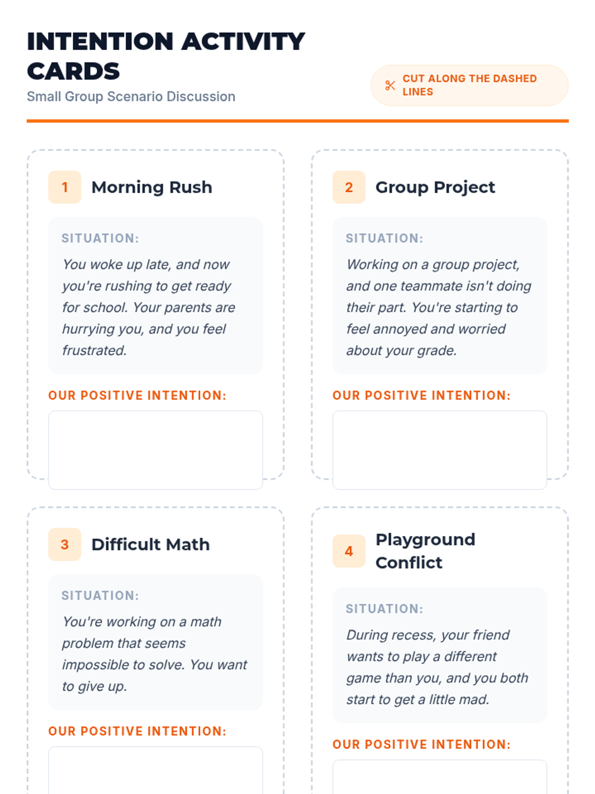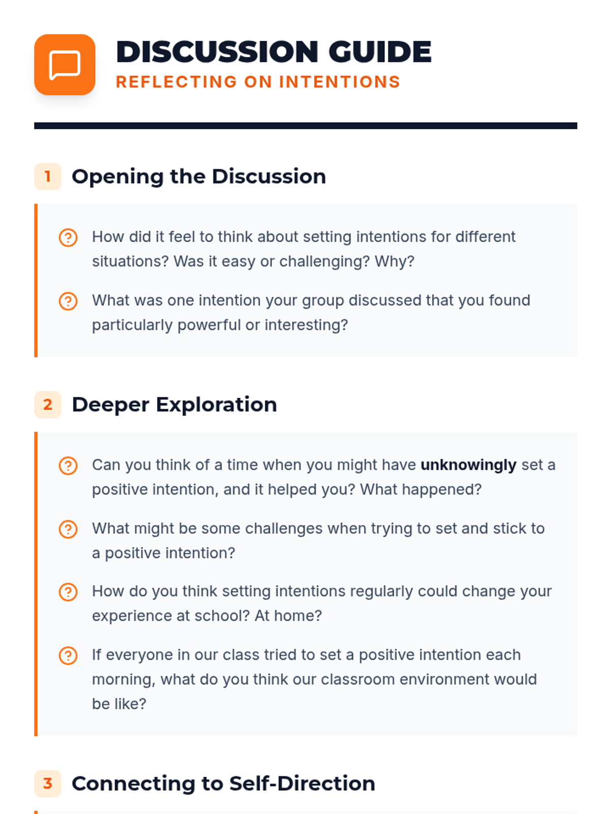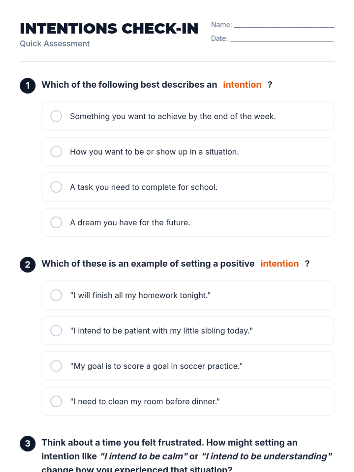 A 60-minute lesson for 4th-6th graders on setting positive intentions to guide actions and behaviors. Students learn to distinguish intentions from goals and practice 'showing up' with mindful purpose.