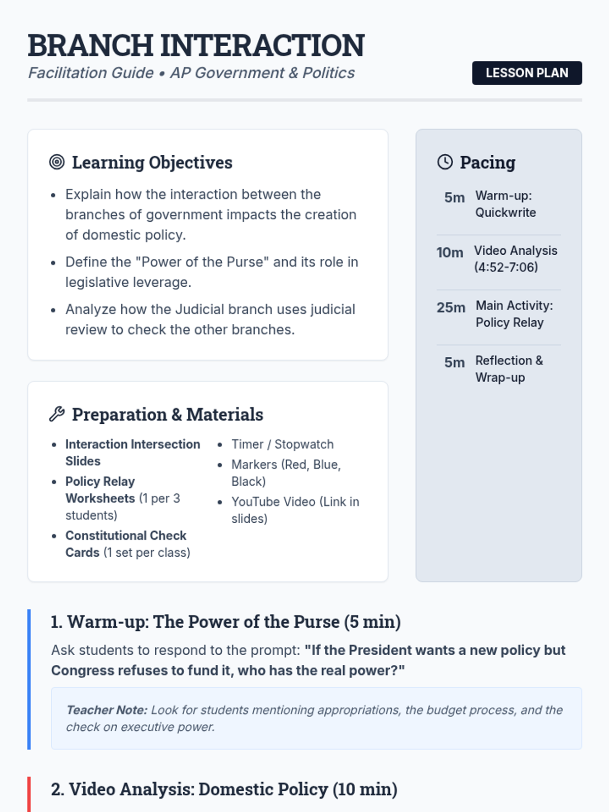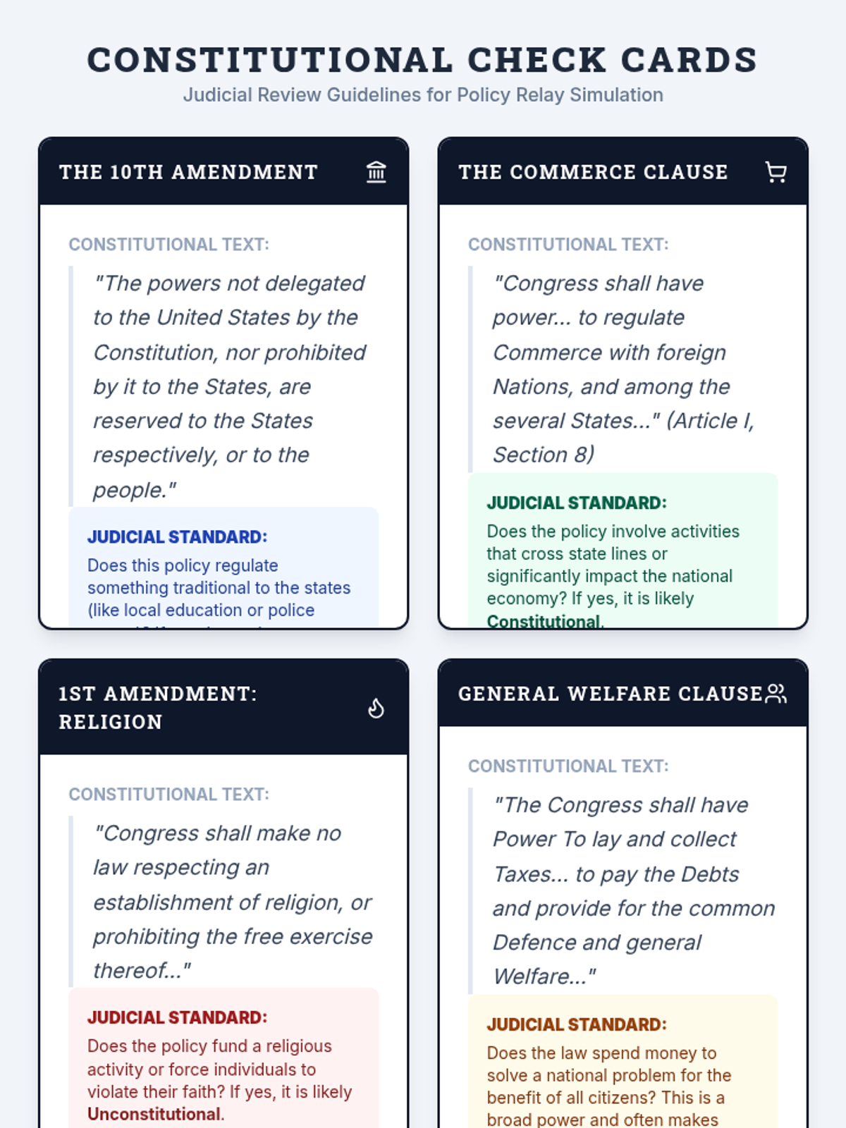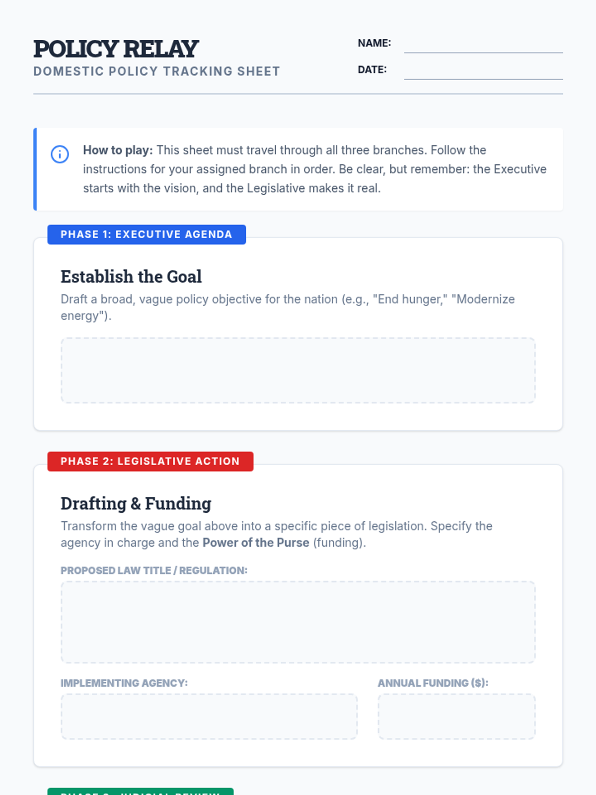 A high-energy simulation where students take on roles in the Executive, Legislative, and Judicial branches to navigate the complexities of domestic policy-making. Students will track a policy from a vague goal to a funded law, finally facing the test of judicial review.