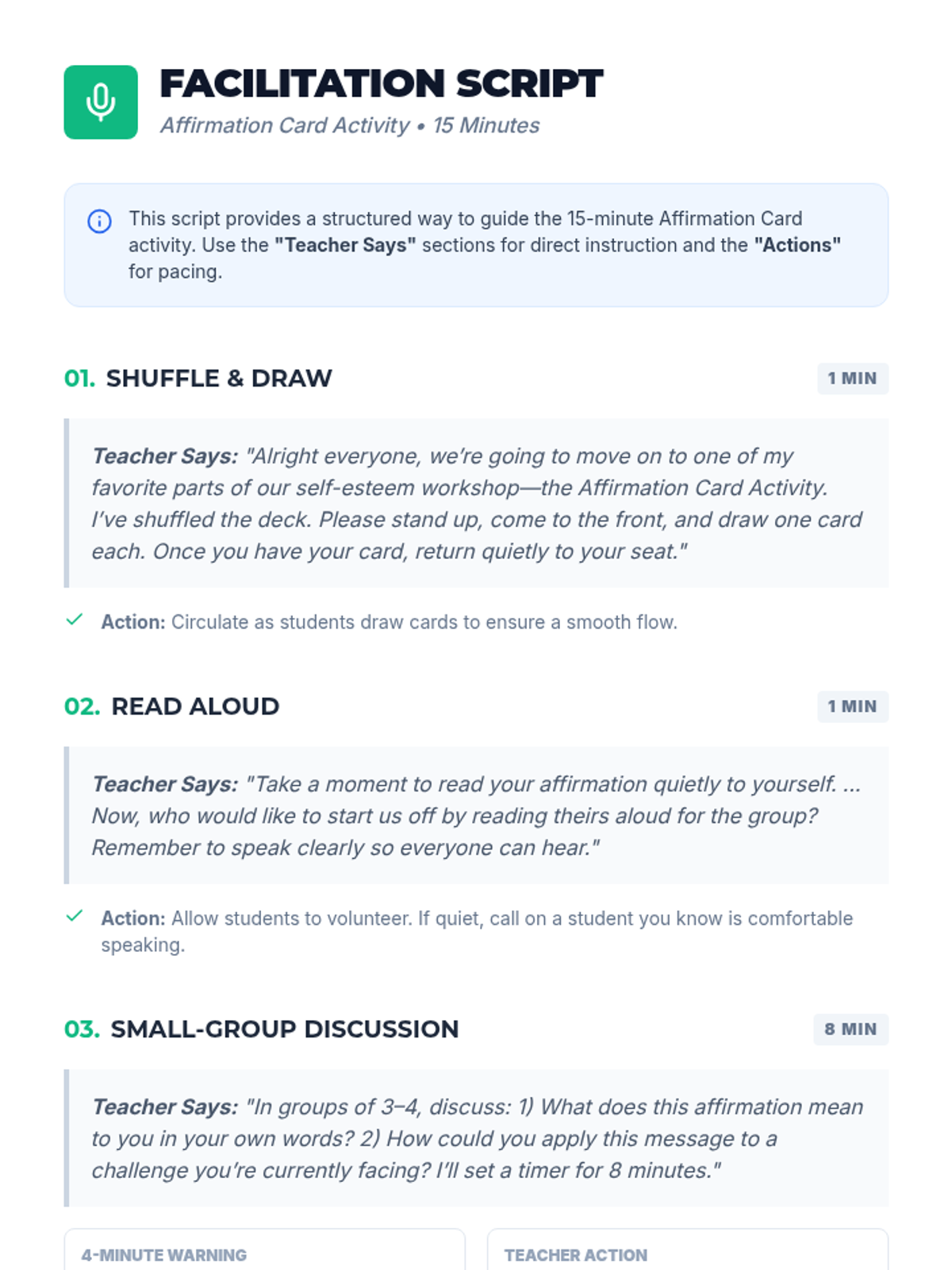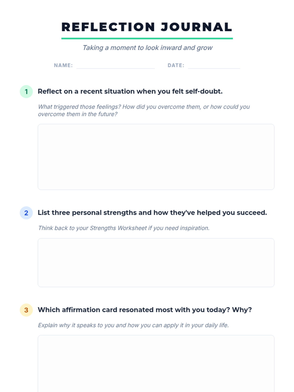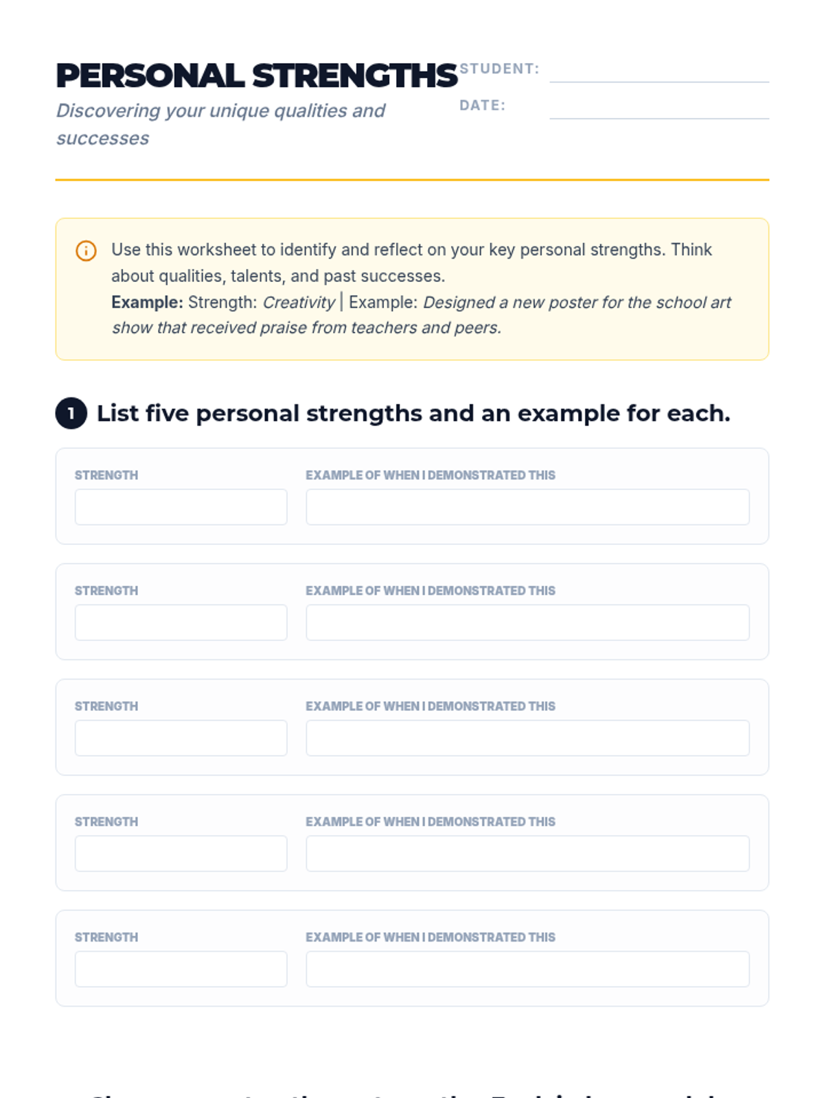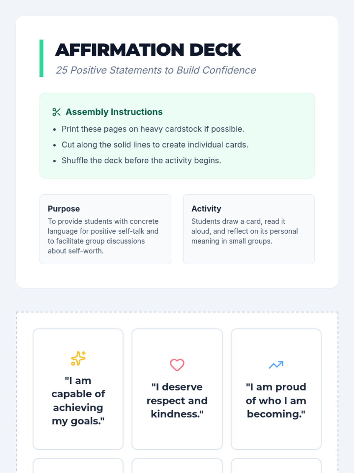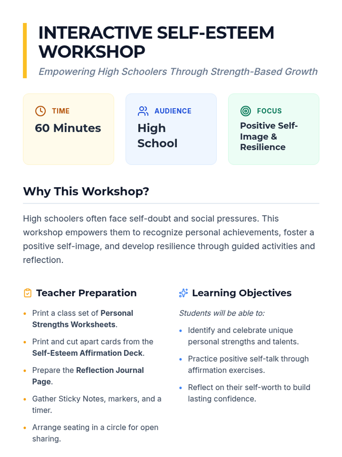 A 60-minute interactive workshop for high school students to identify personal strengths, practice positive affirmations, and build self-esteem through reflective activities.