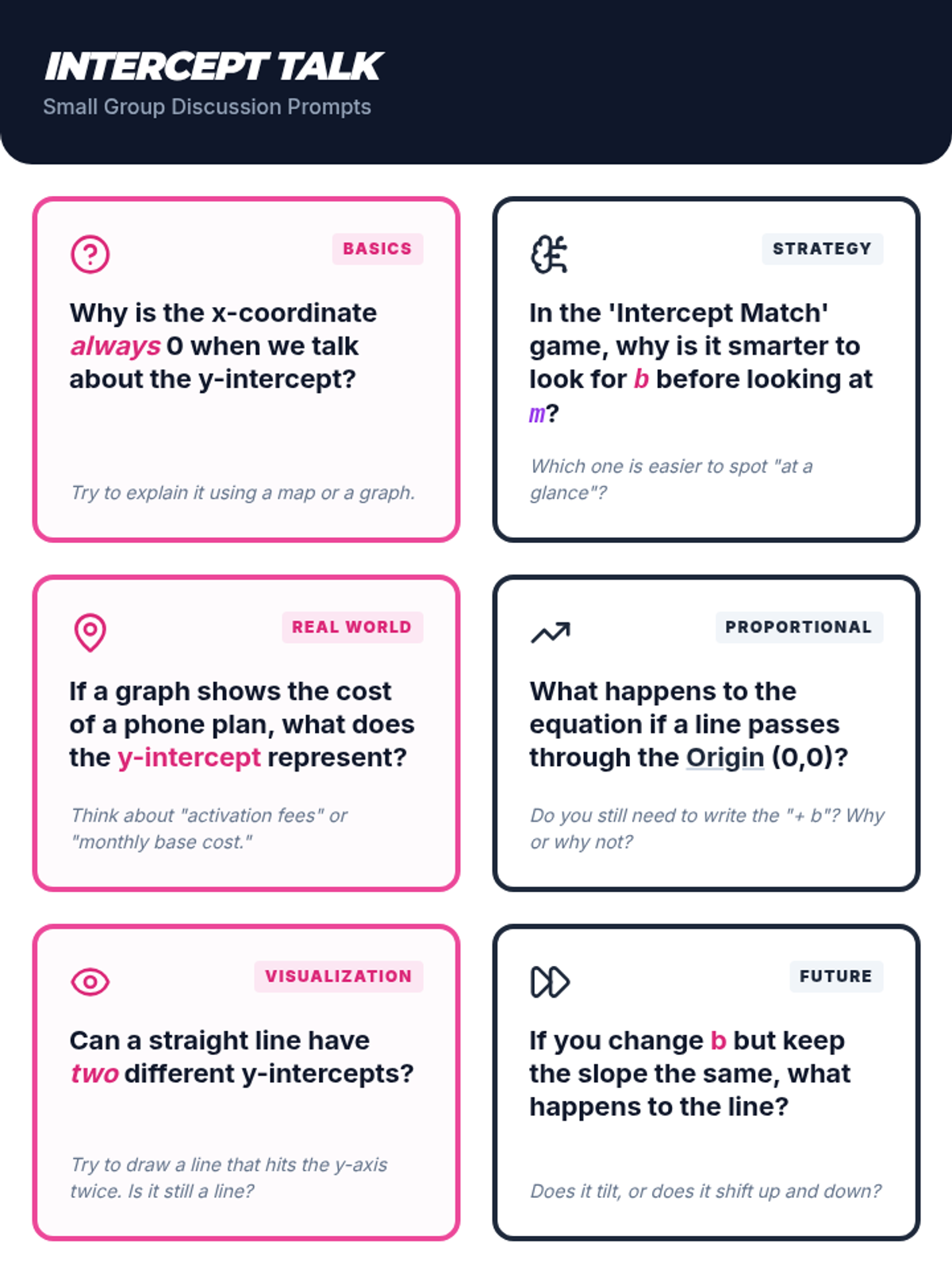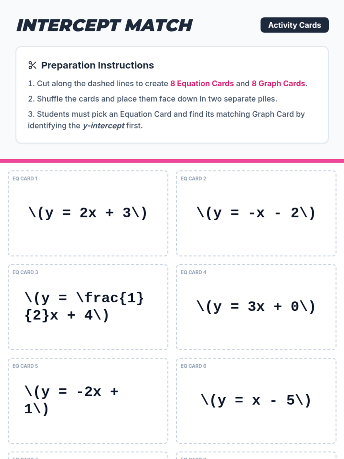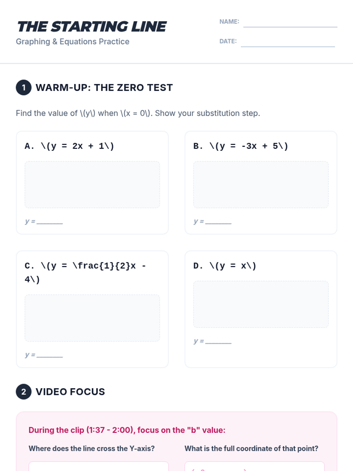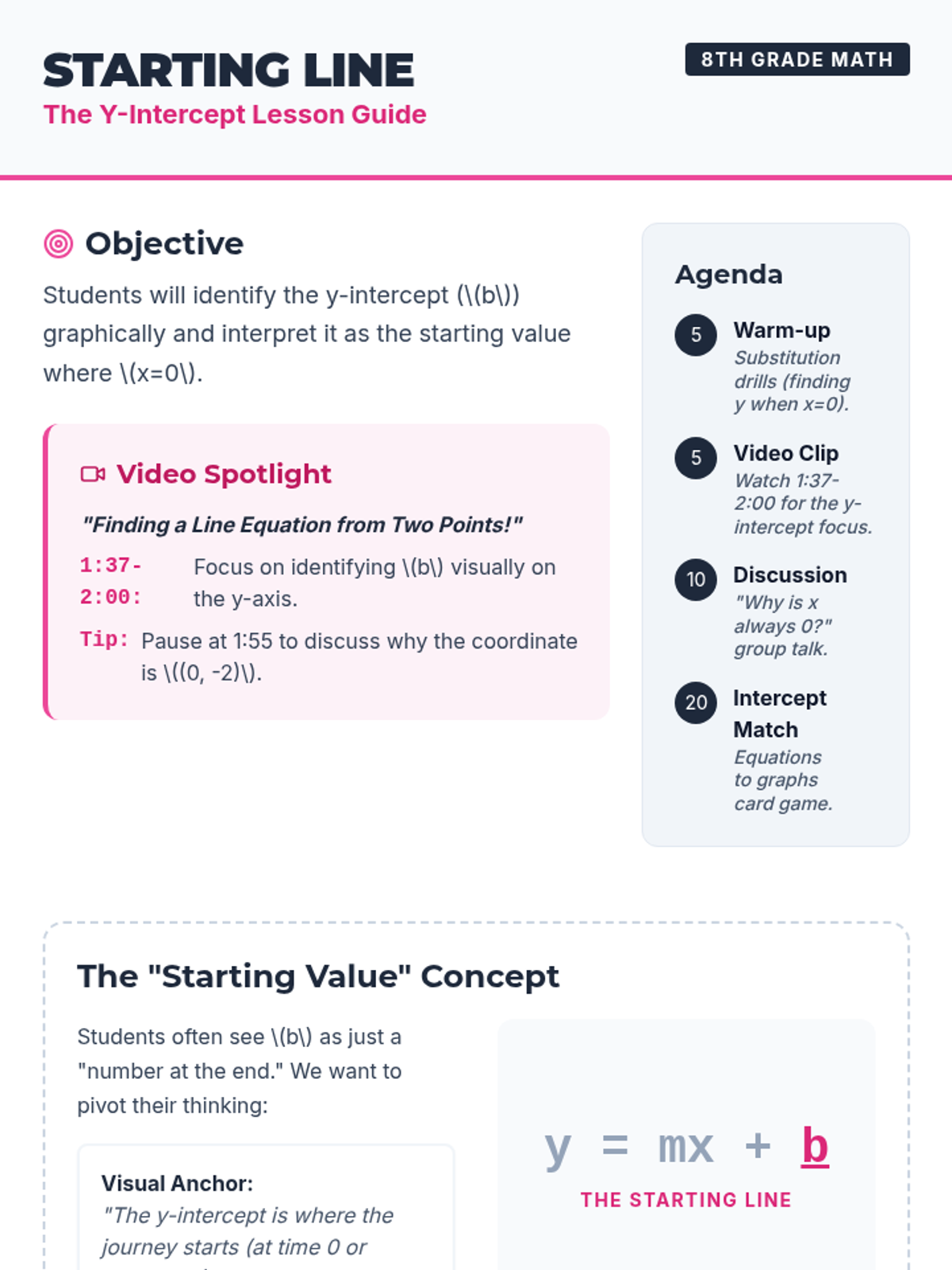 Students will learn to identify the y-intercept graphically and interpret it as the 'starting value' where the x-coordinate is always zero. This lesson includes a warm-up, video analysis, interactive matching game, and a collaborative discussion.