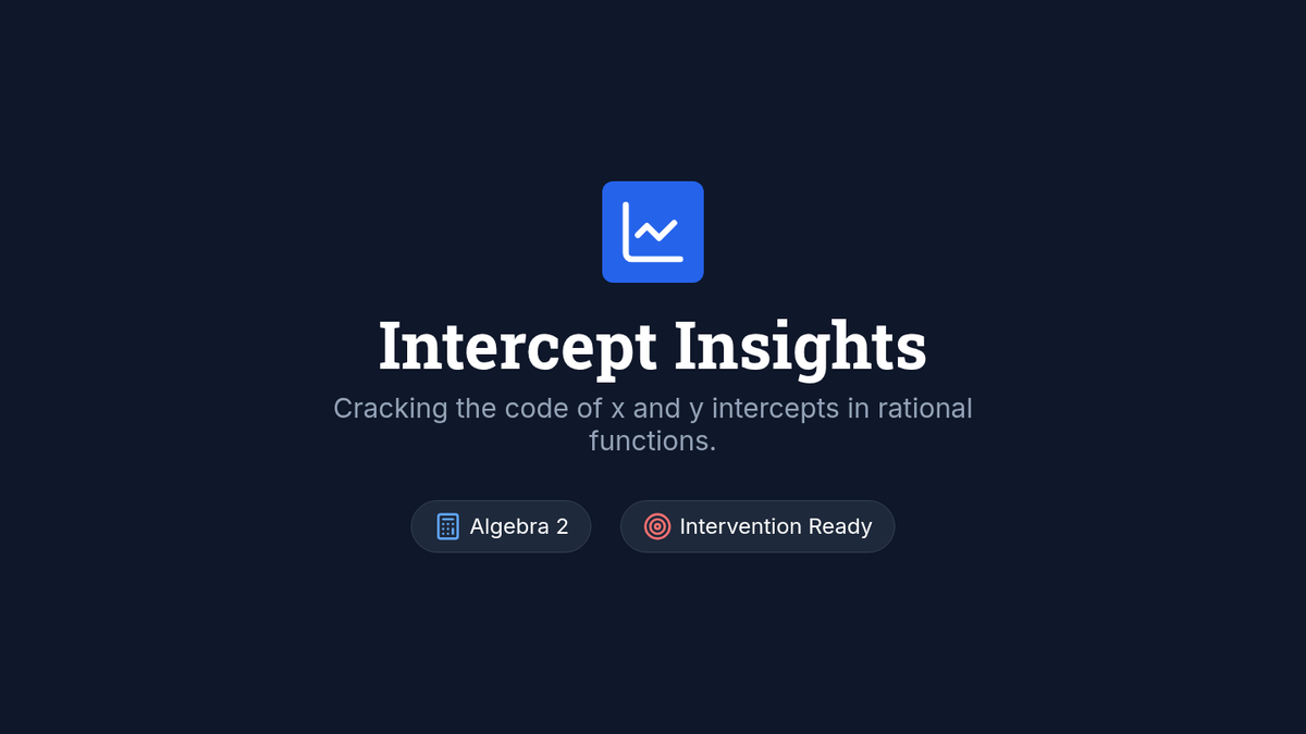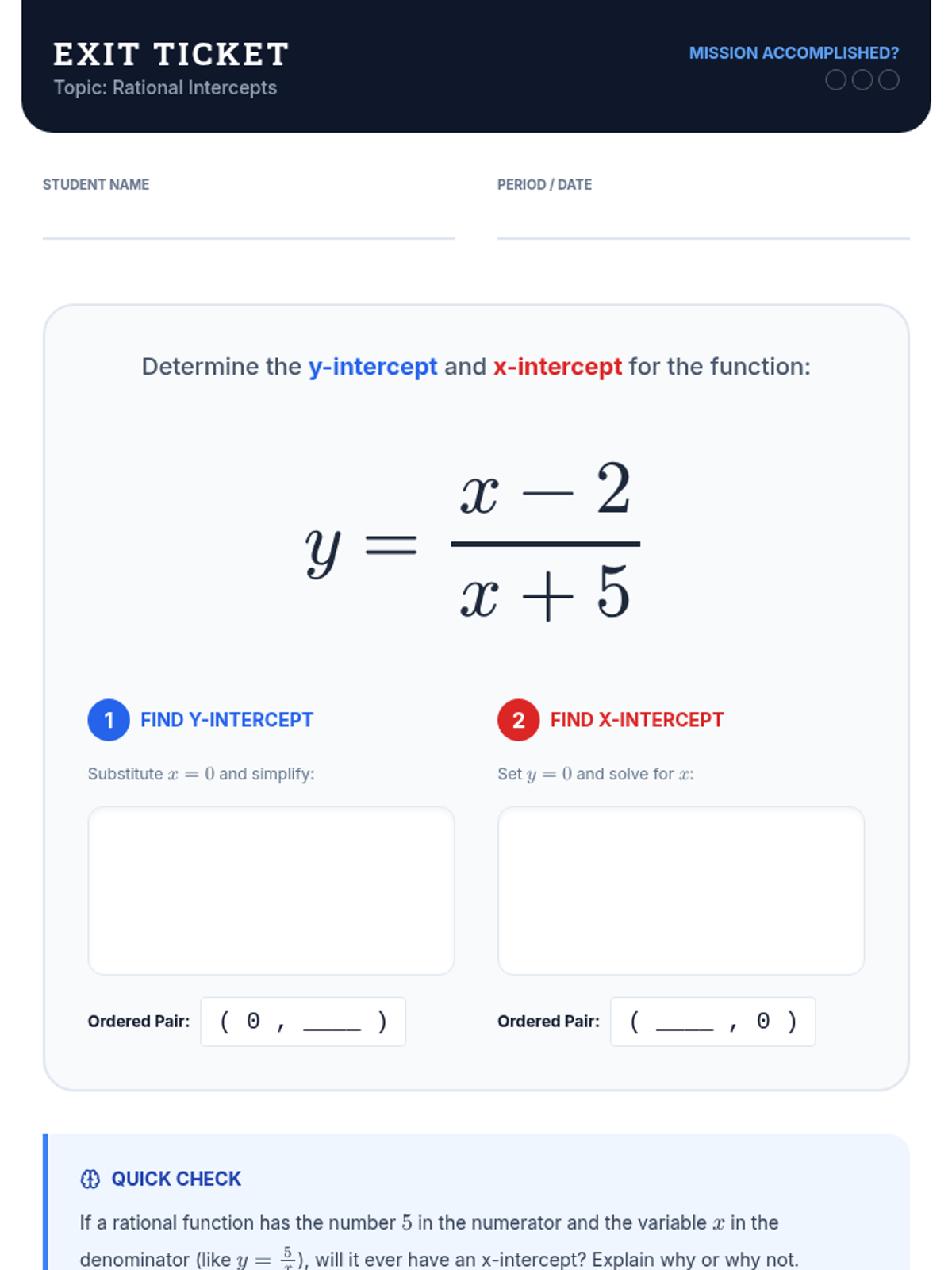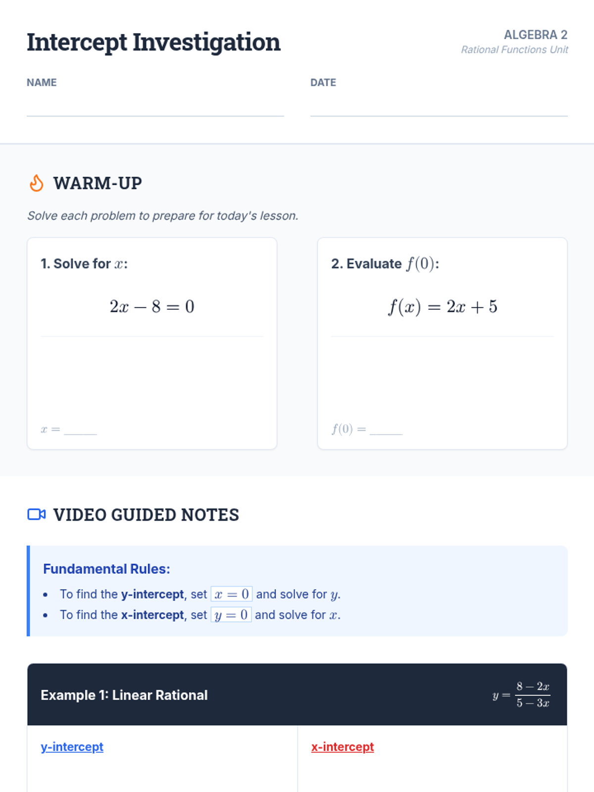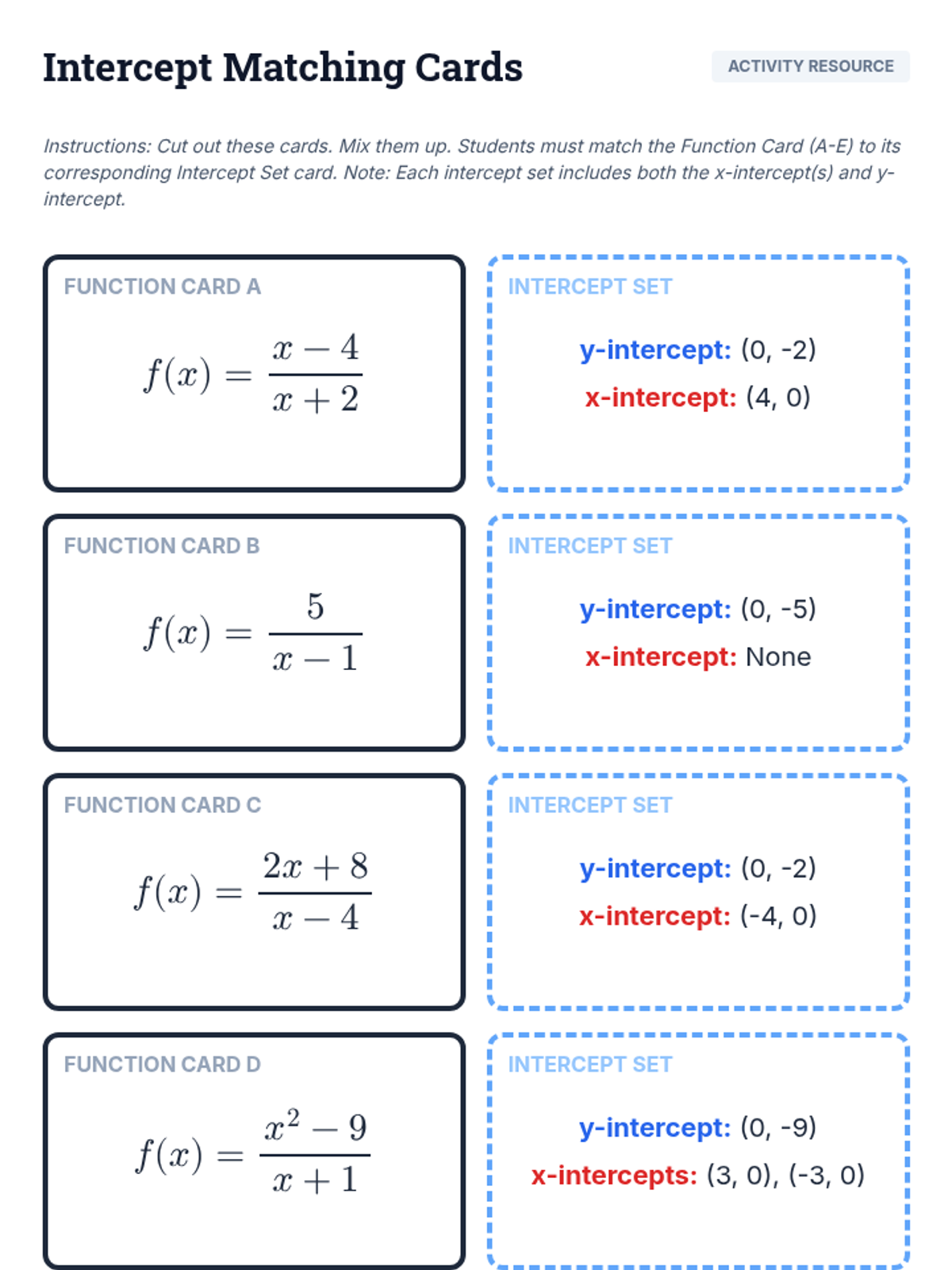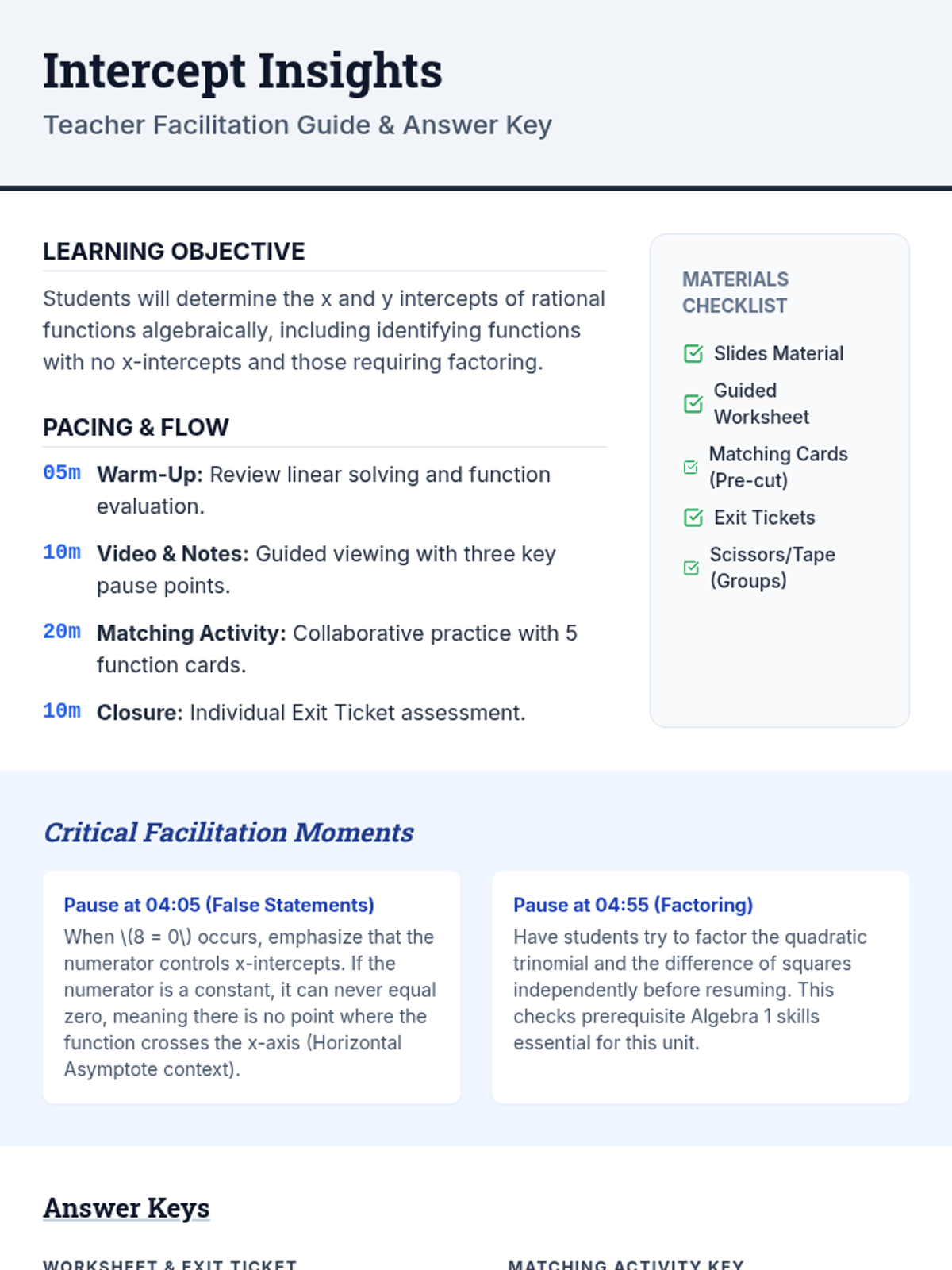 Students learn to algebraically determine the x and y intercepts of rational functions, including cases with no x-intercepts and functions requiring factoring. The lesson utilizes a guided video exploration followed by a hands-on matching activity.