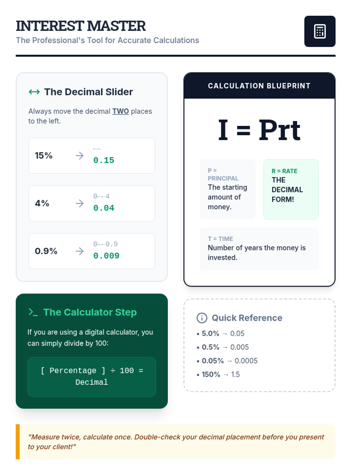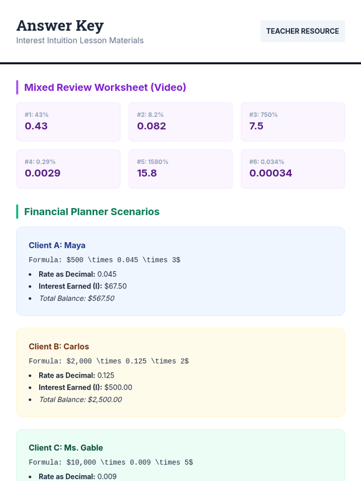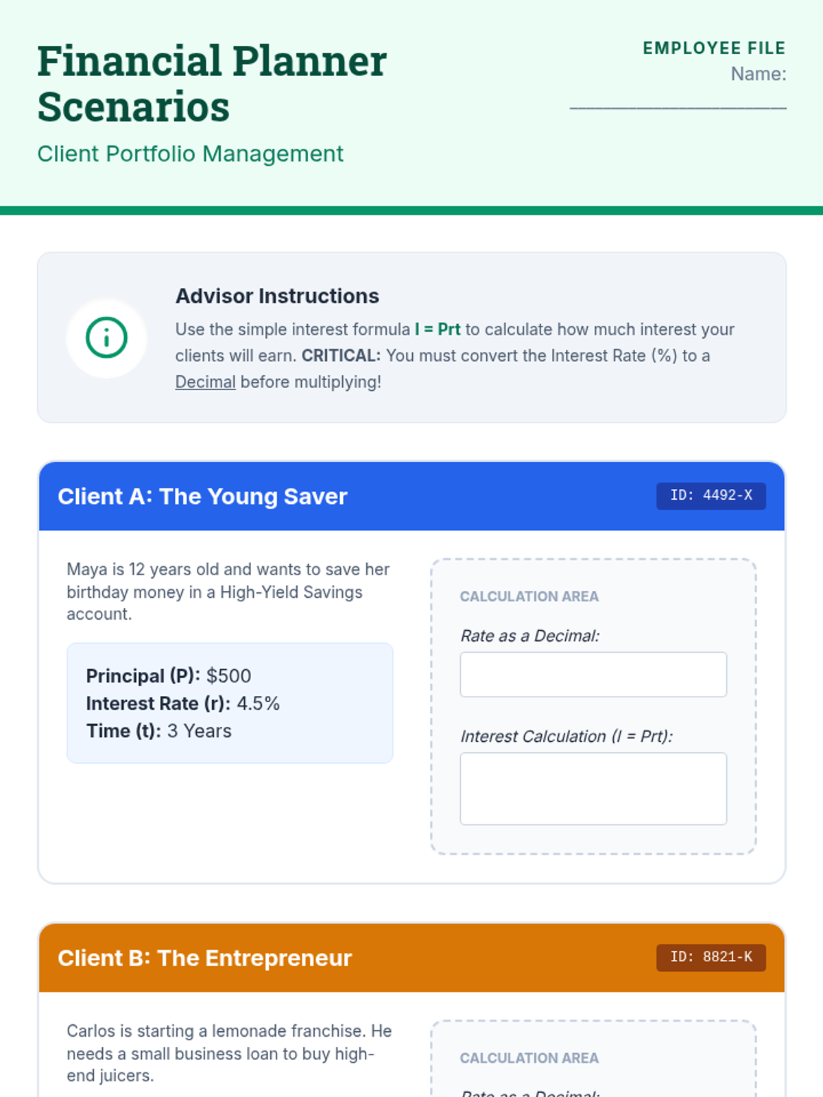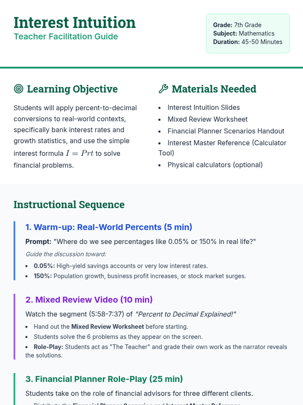 A 7th-grade math lesson where students apply percent-to-decimal conversions to real-world financial scenarios using simple interest calculations and a role-play activity.