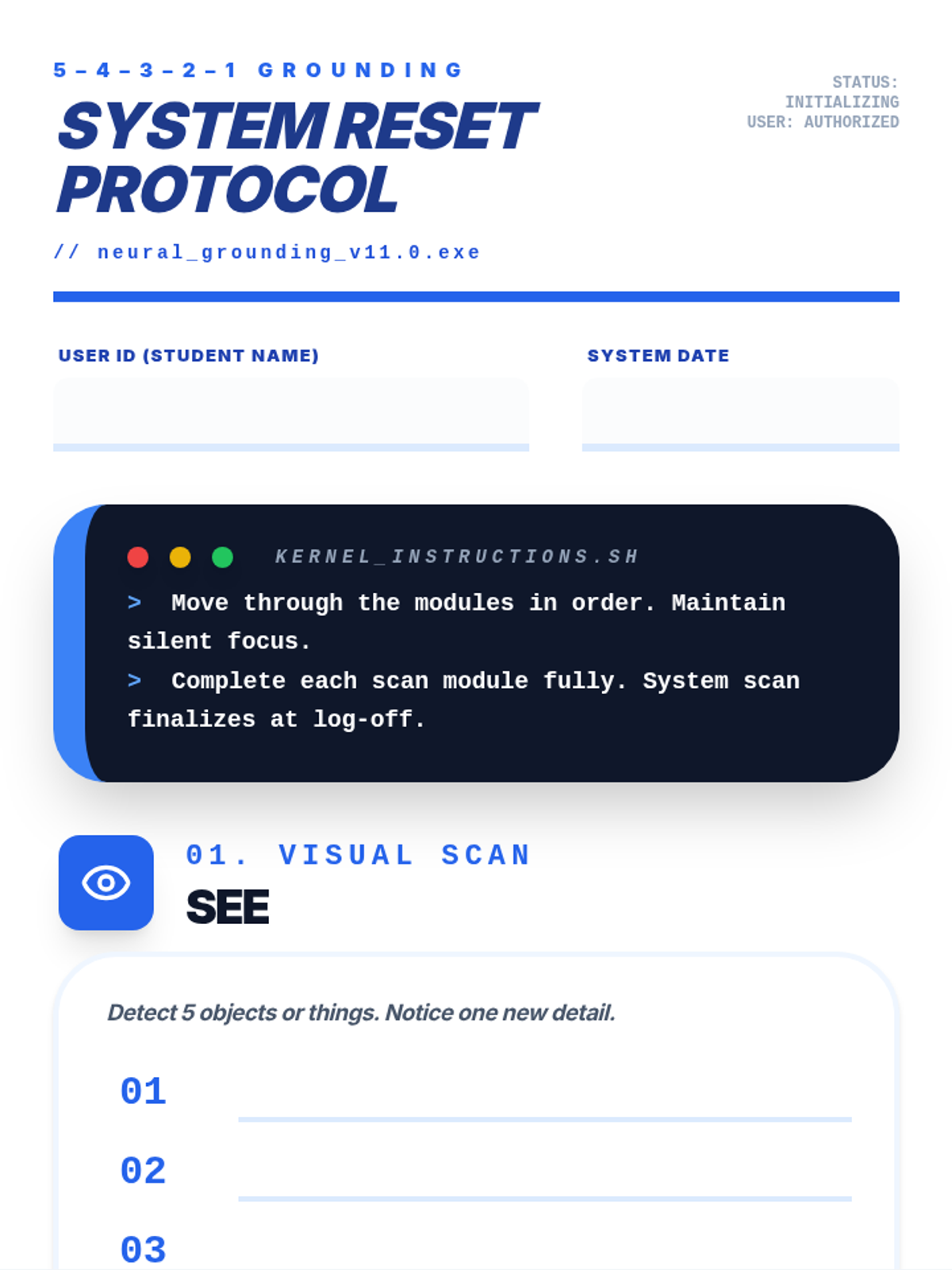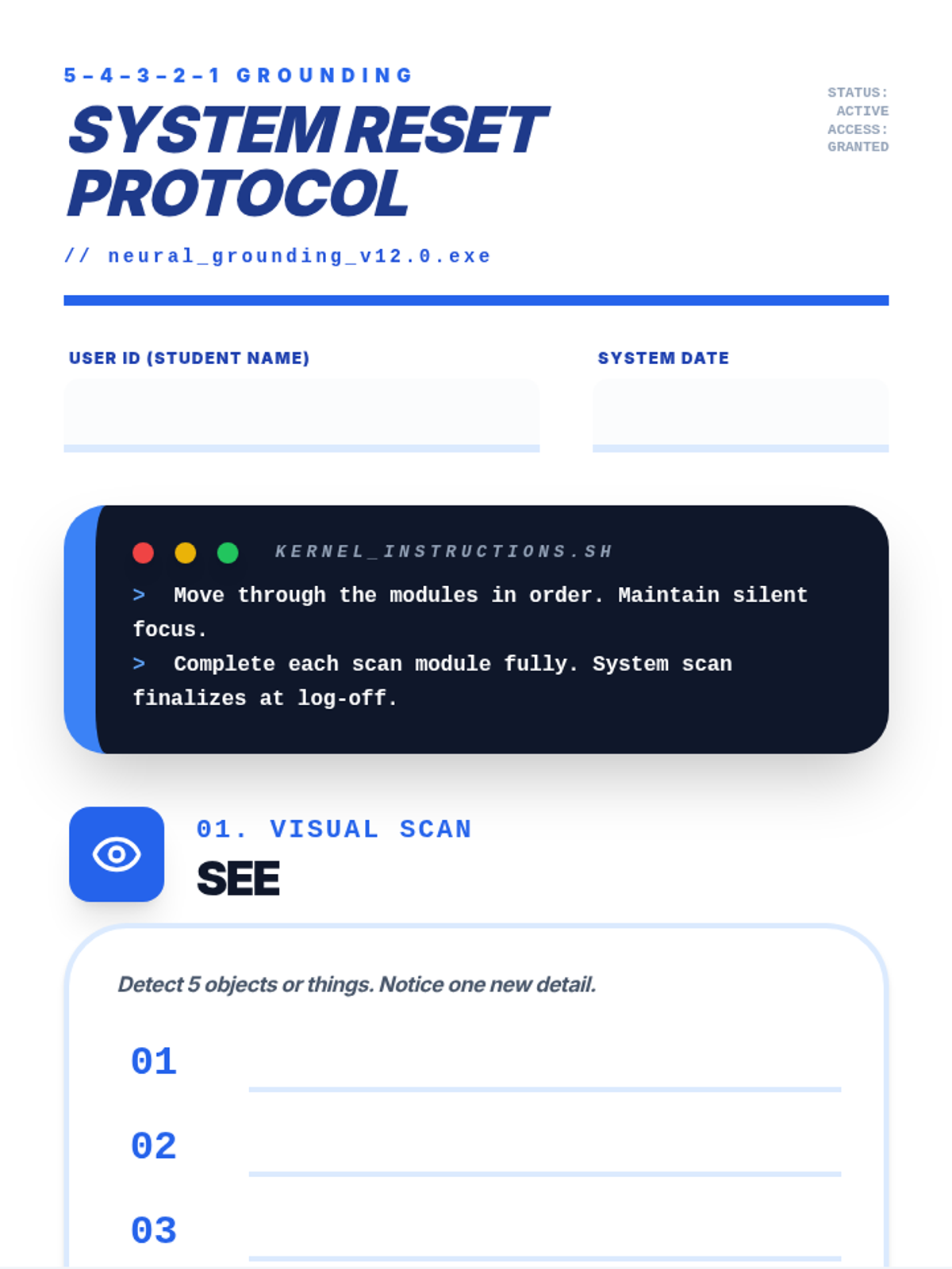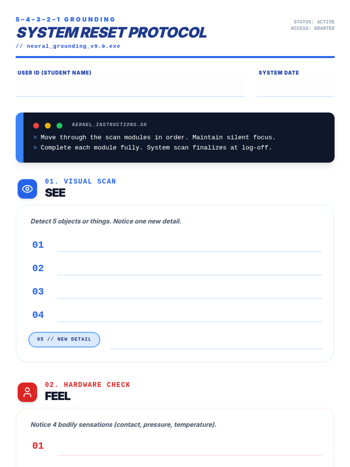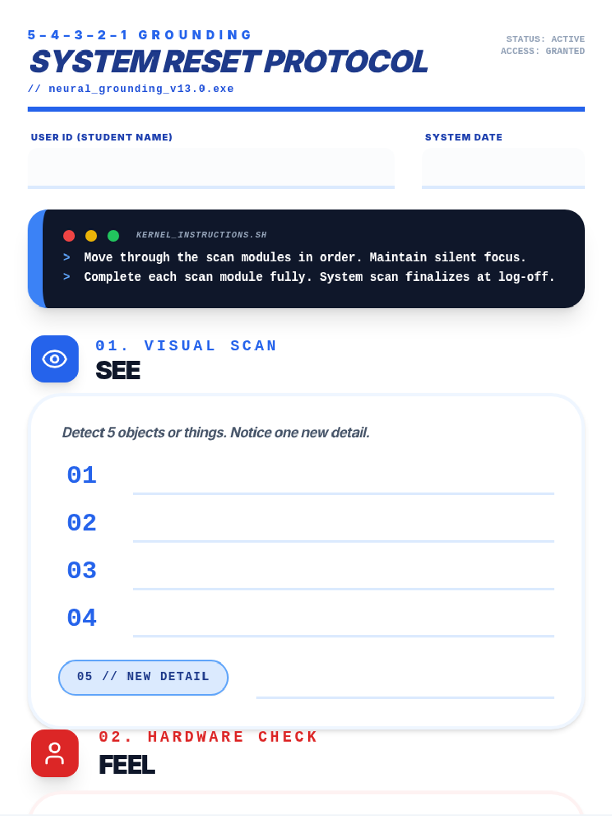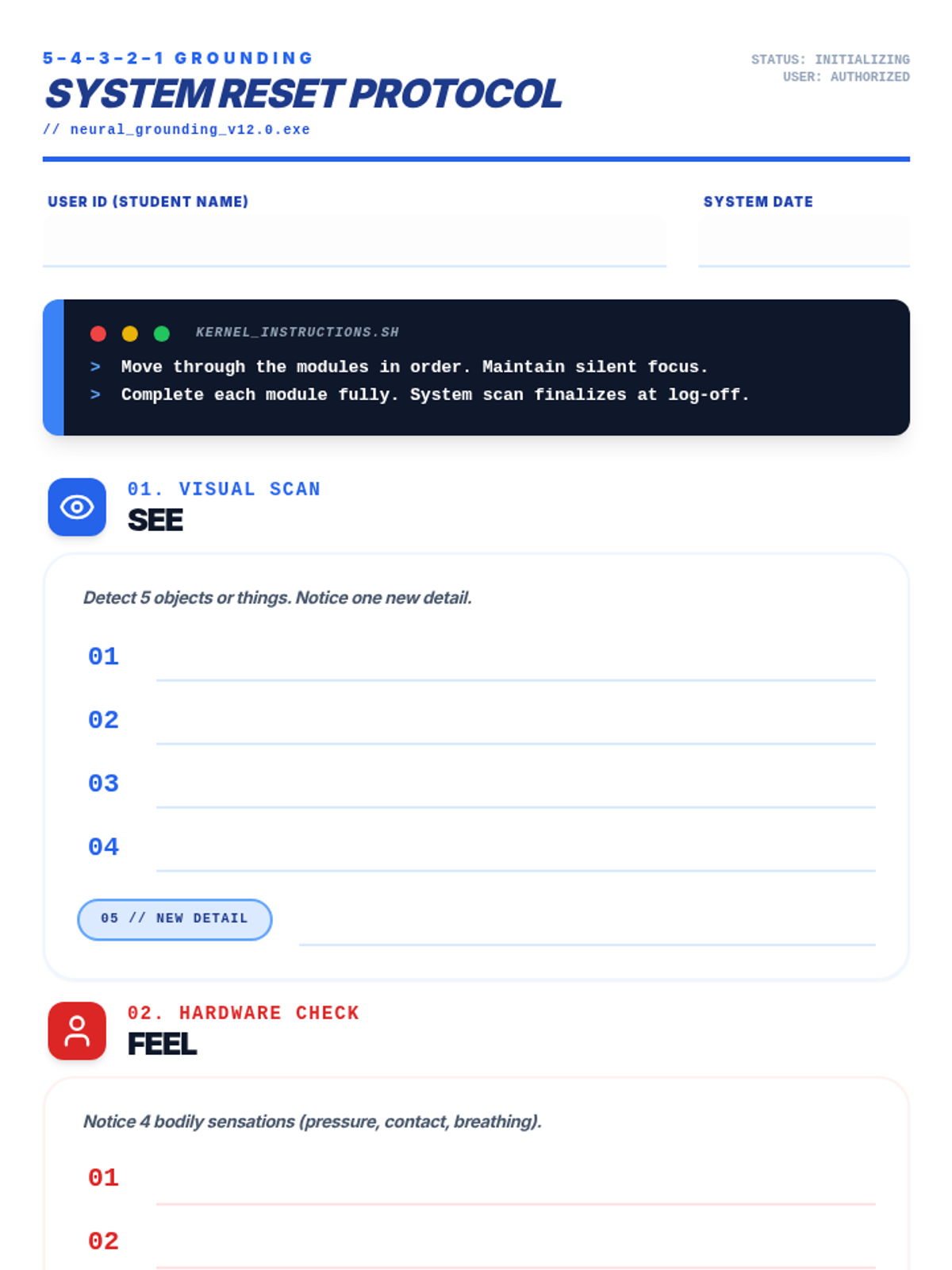 A lesson teaching students how to use the 5-4-3-2-1 grounding technique to manage stress and anxiety, framed through a technical 'system reset' metaphor. Students learn to recognize the 'spinning' state of anxiety and intercept it using sensory inputs.