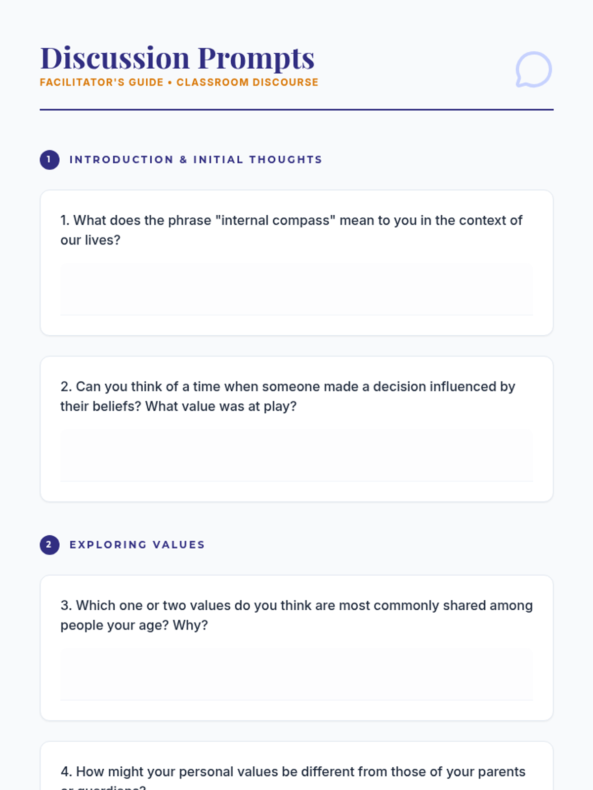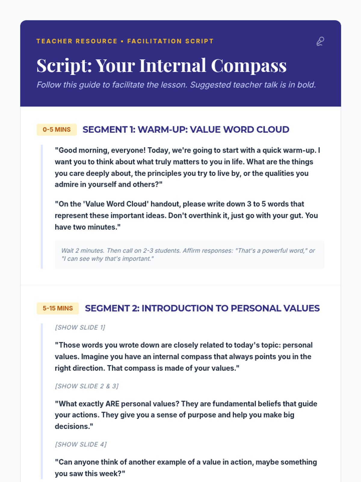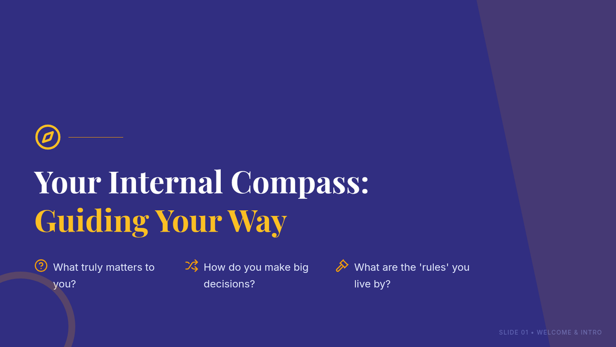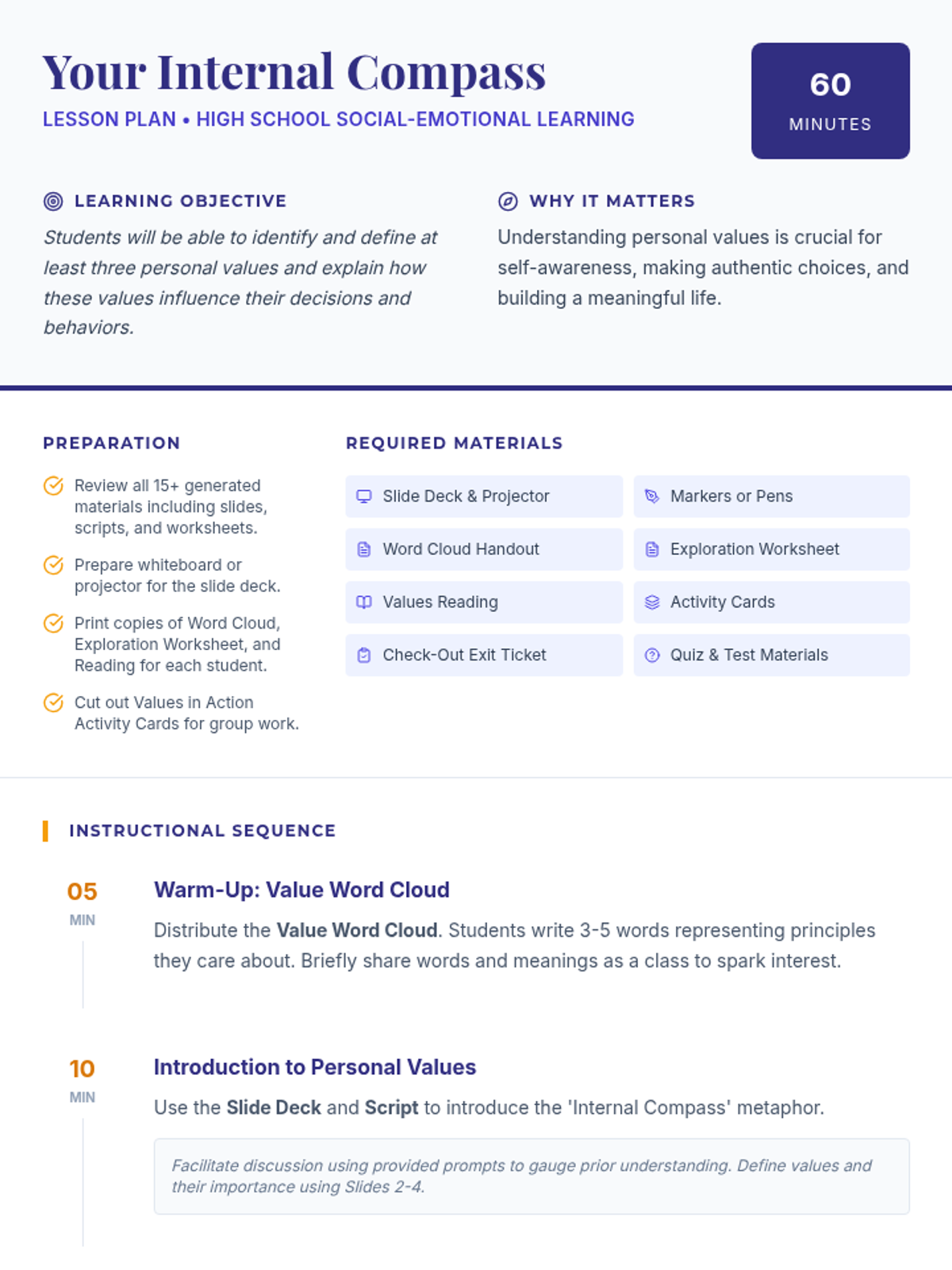 This lesson helps high school students identify and understand their personal values, providing an 'internal compass' to guide their decisions and actions through interactive discussion and self-reflection.