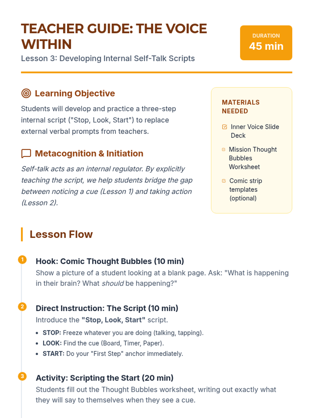 Students develop internal scripts to replace teacher directives with self-directed prompts.