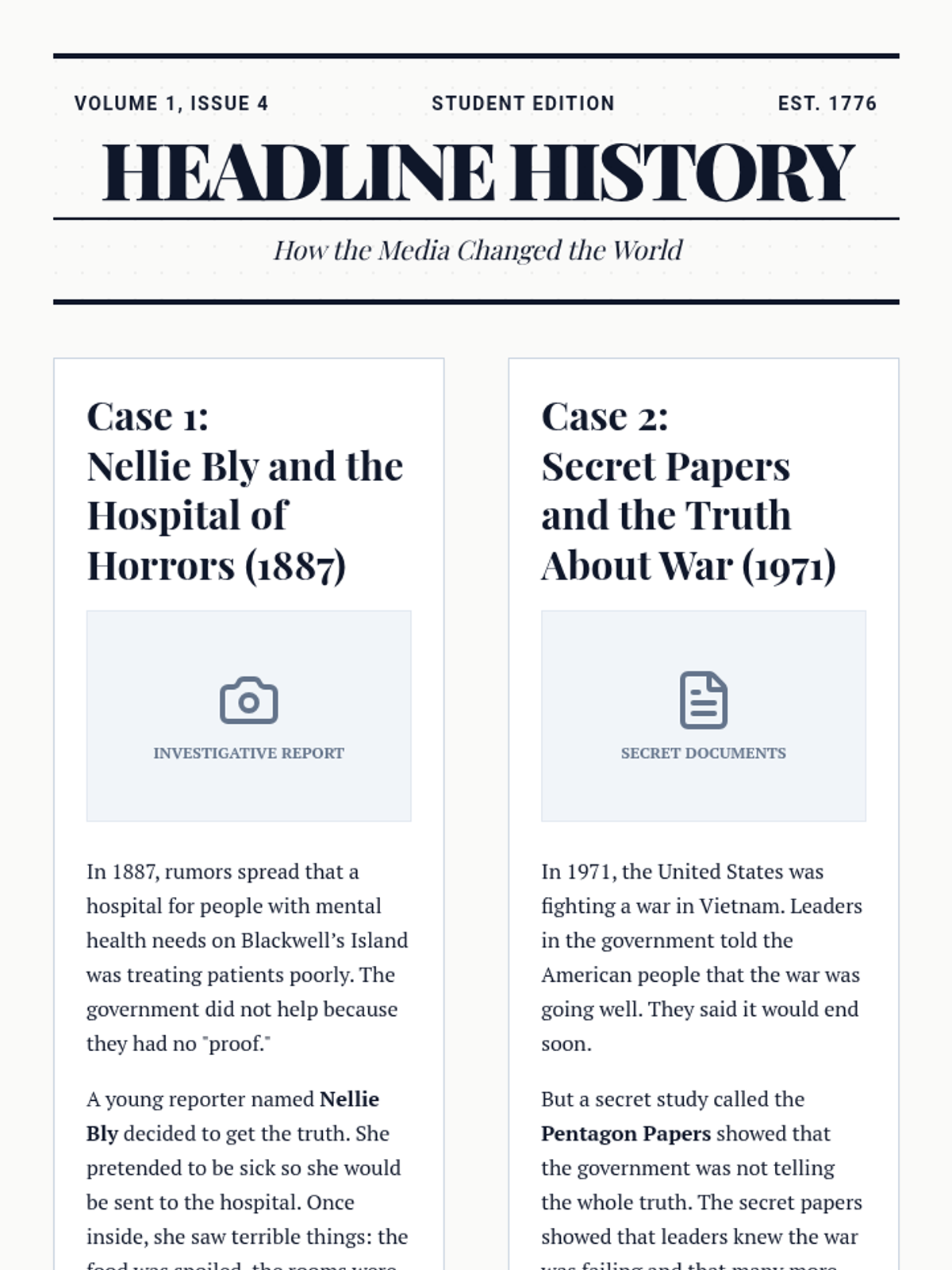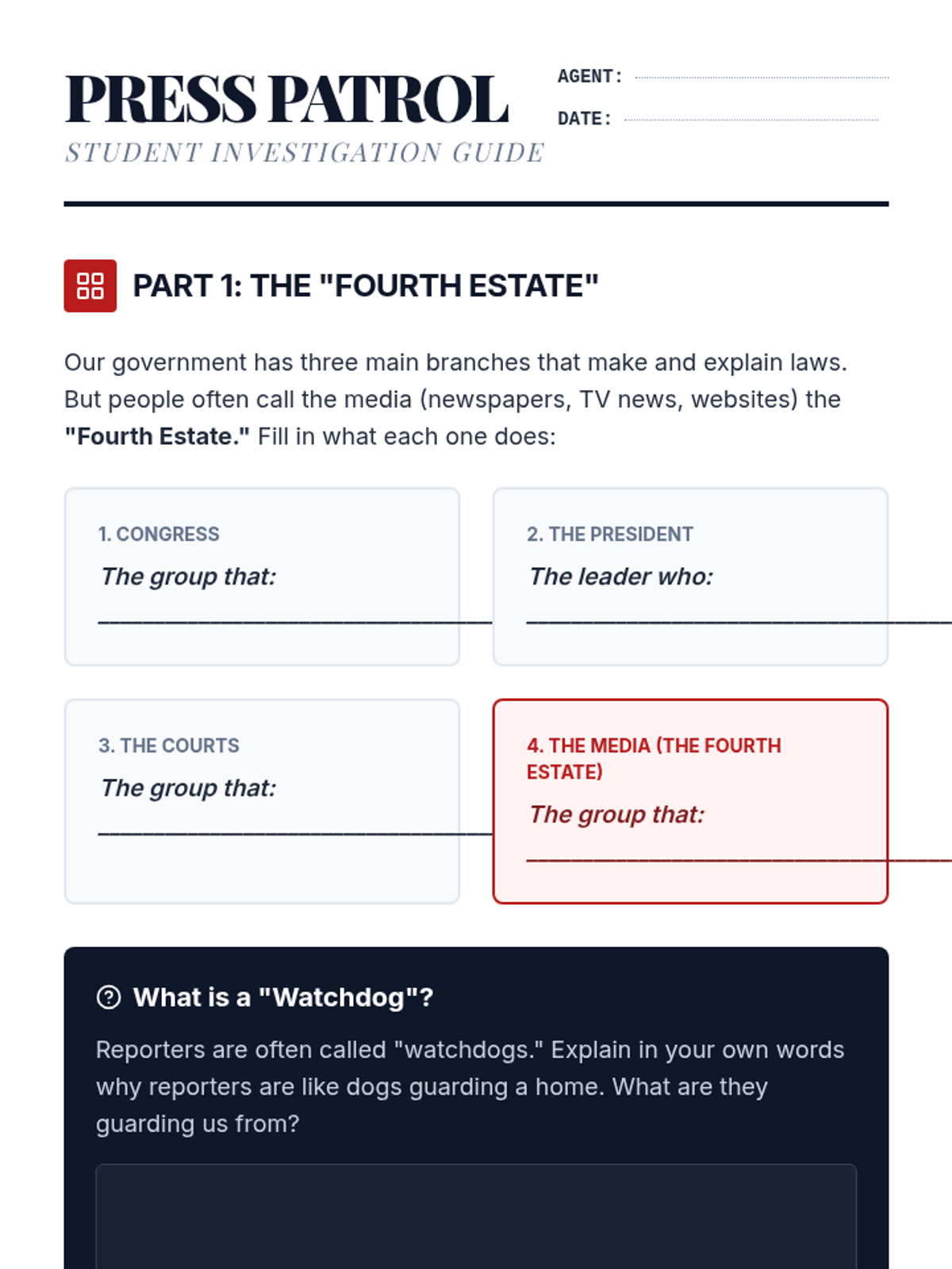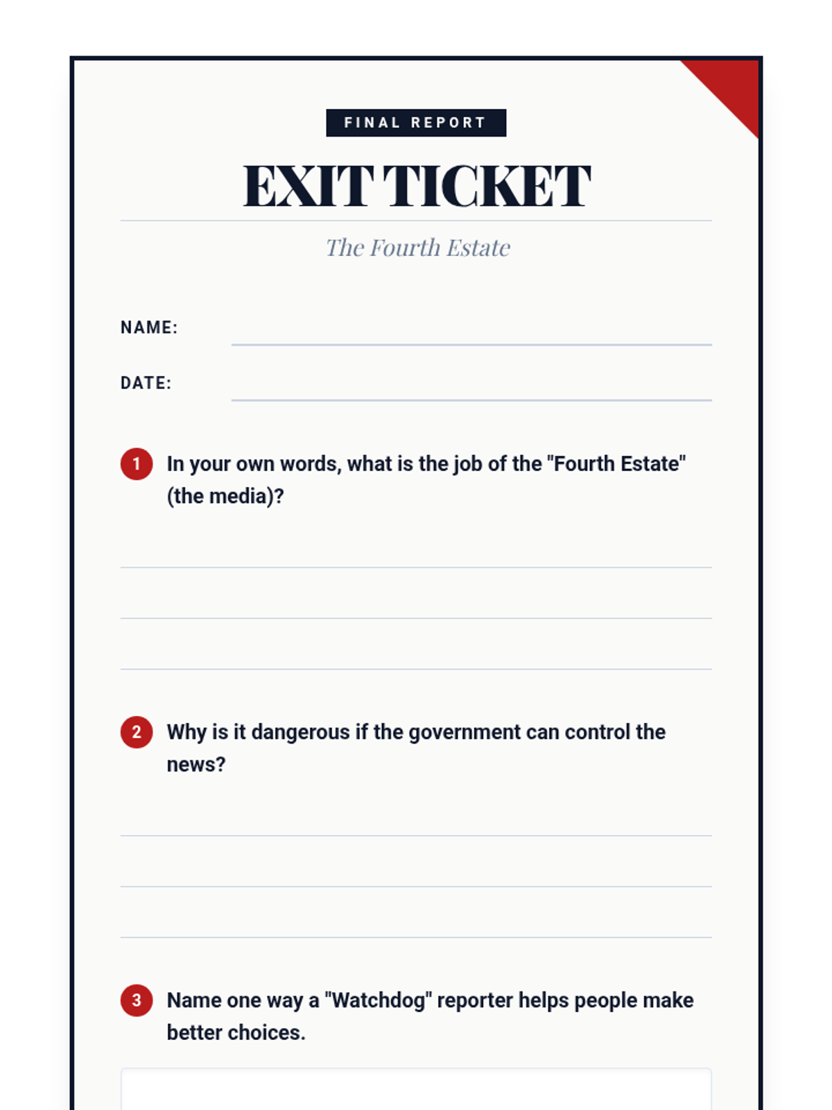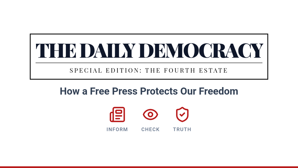 Students explore the vital role of a free press as the 'Fourth Estate' in a democracy, examining historical impact and current relevance through inquiry and analysis.