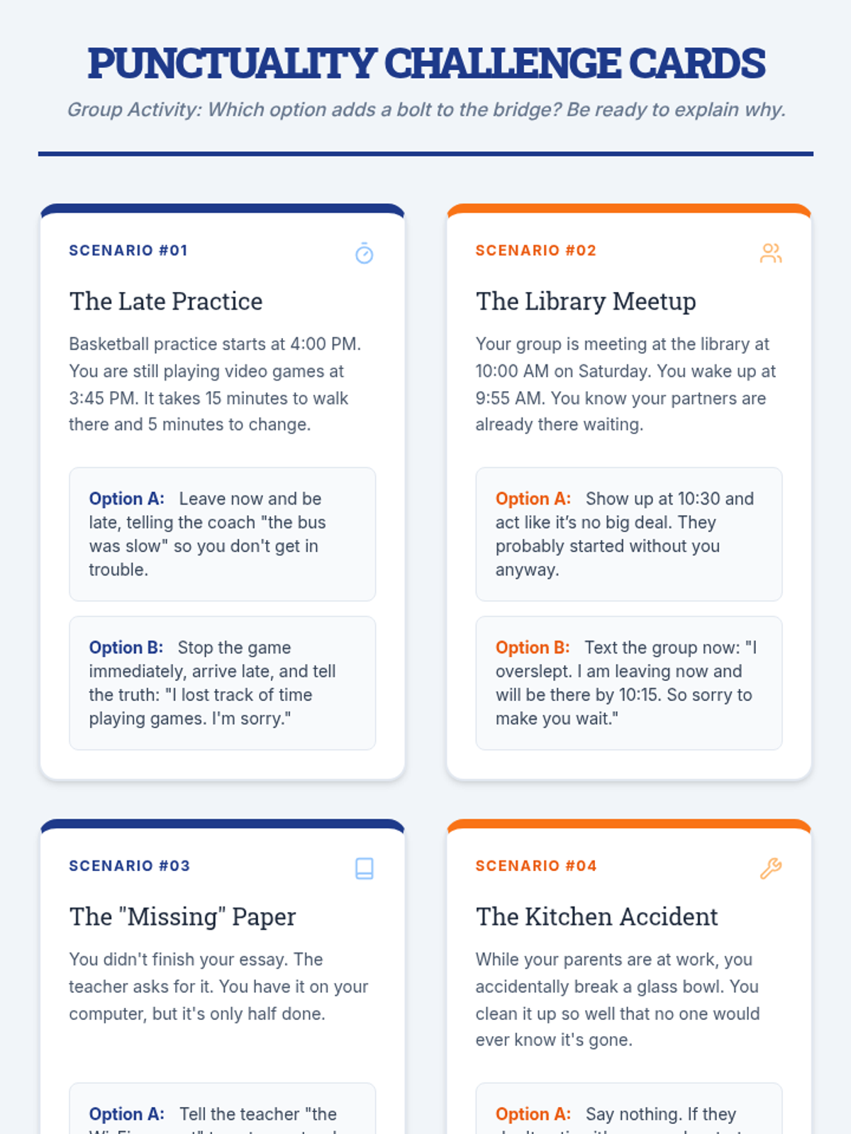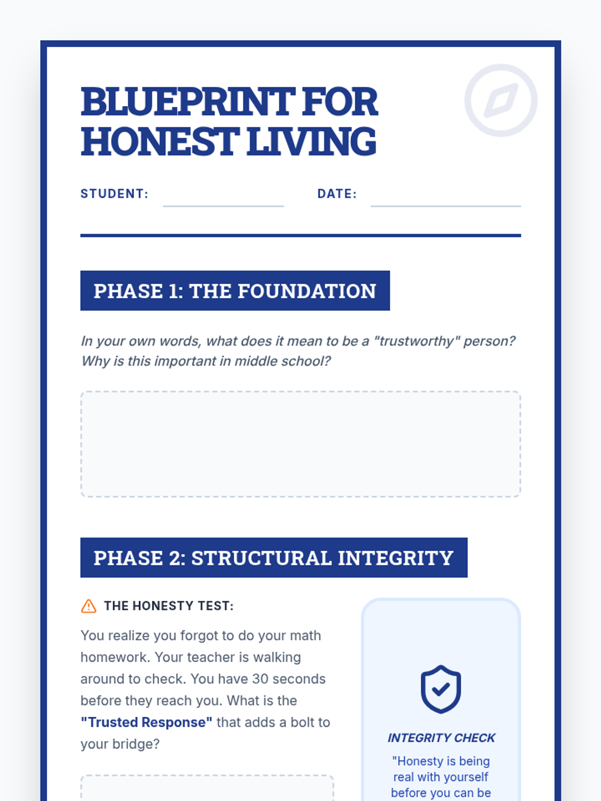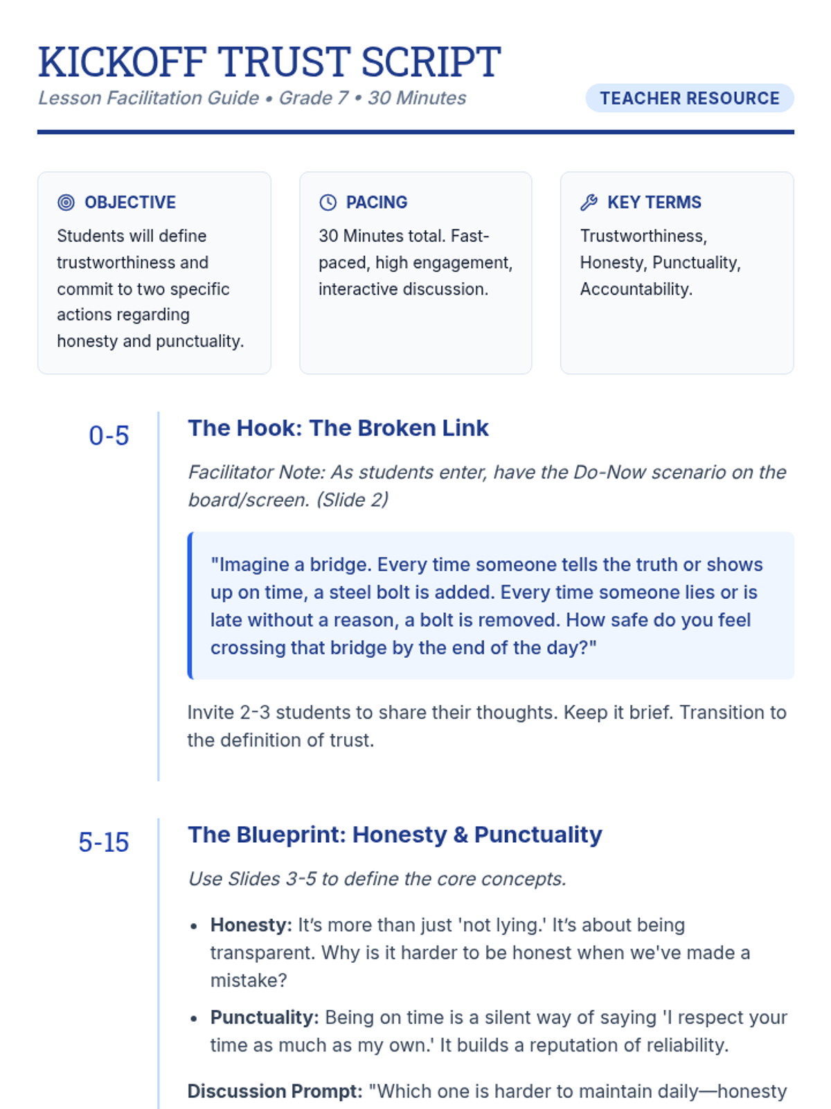A 30-minute character education lesson for 7th graders focused on defining trustworthiness through the pillars of honesty and punctuality. Students reflect on scenarios and create a personal action plan.