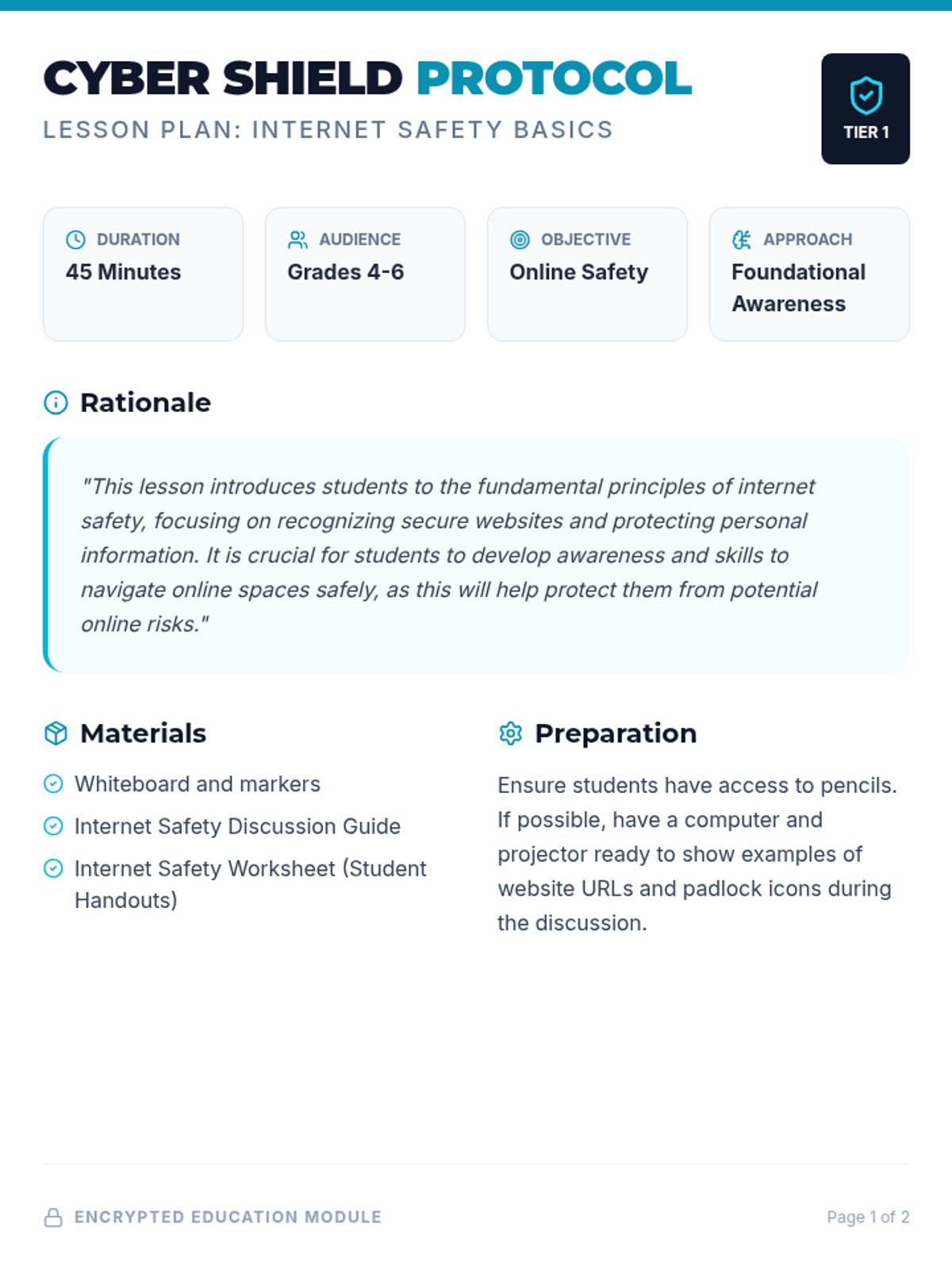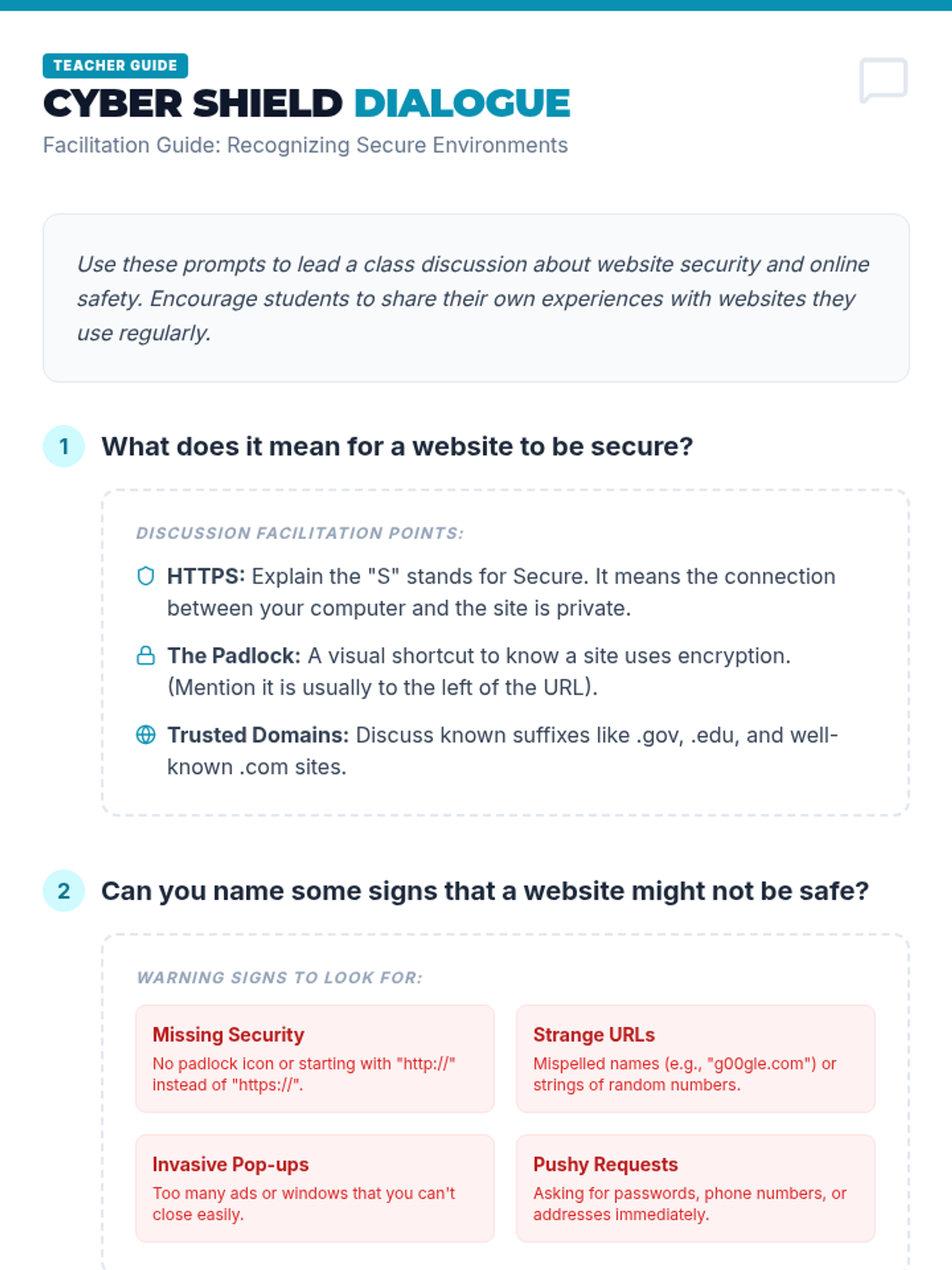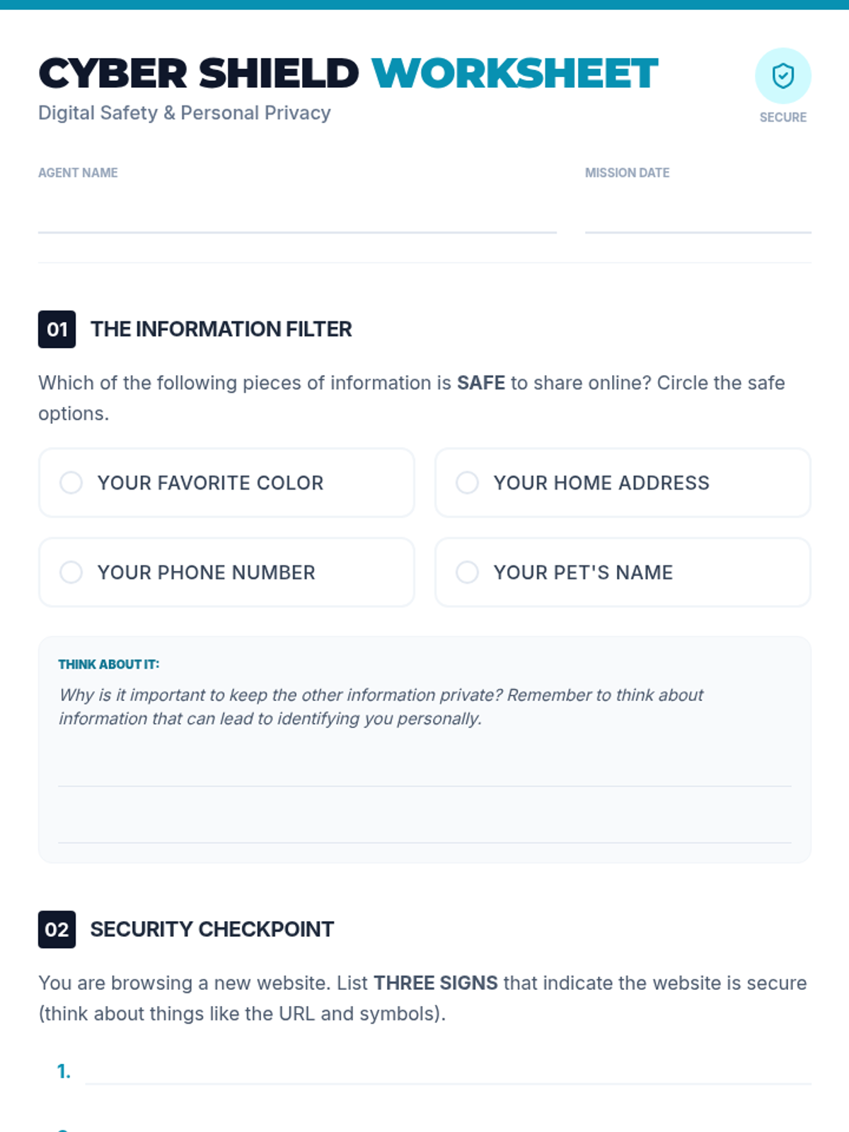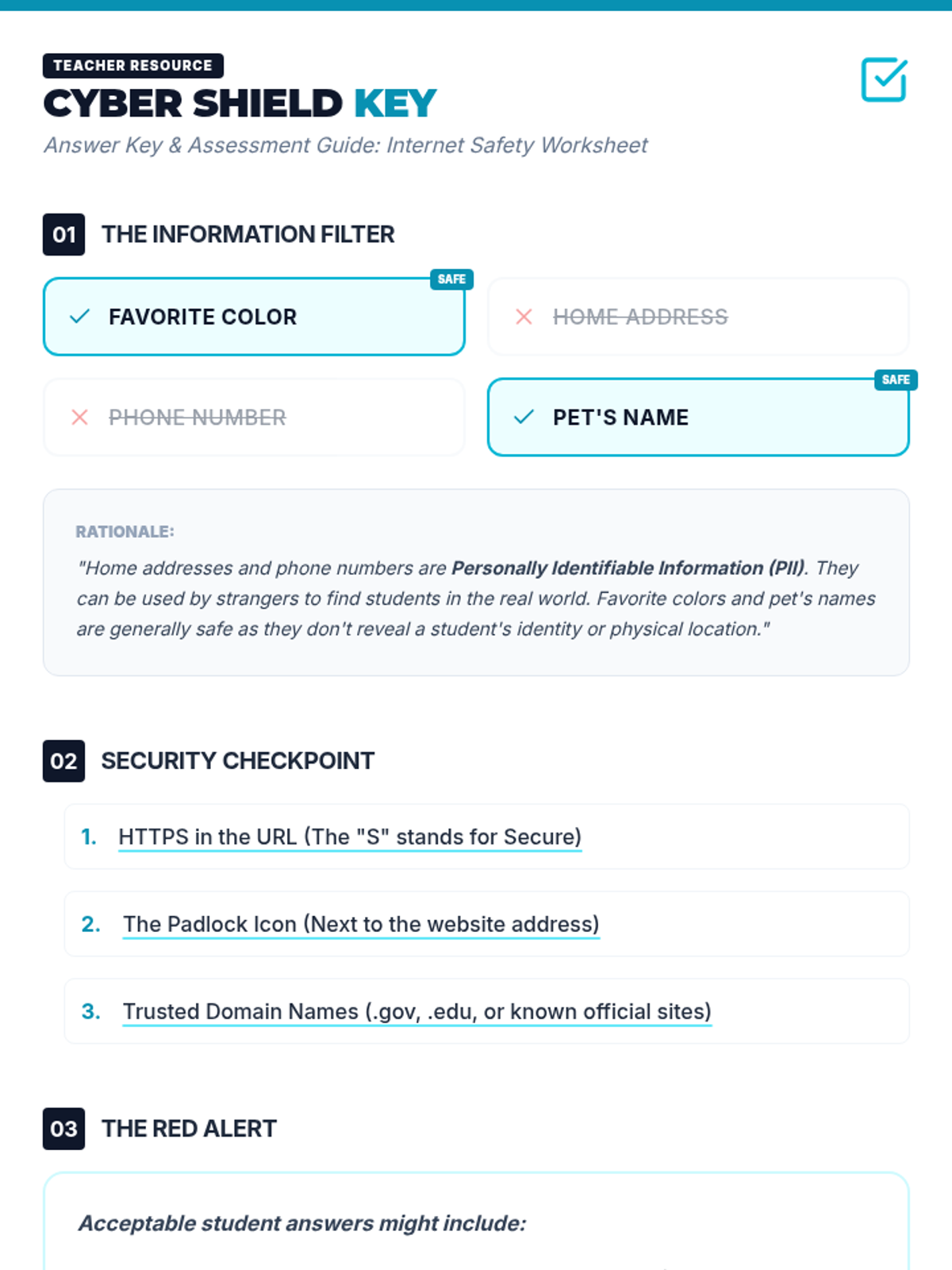 This lesson introduces 4th-6th grade students to the fundamentals of internet safety, focusing on recognizing secure websites (HTTPS/padlocks) and identifying which personal information is safe to share online.