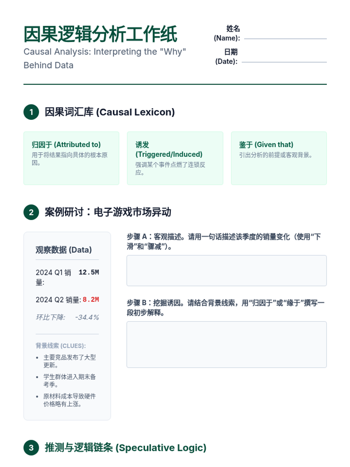 Moves from description to analysis, teaching causal conjunctions and speculative language to hypothesize the reasons behind data trends.