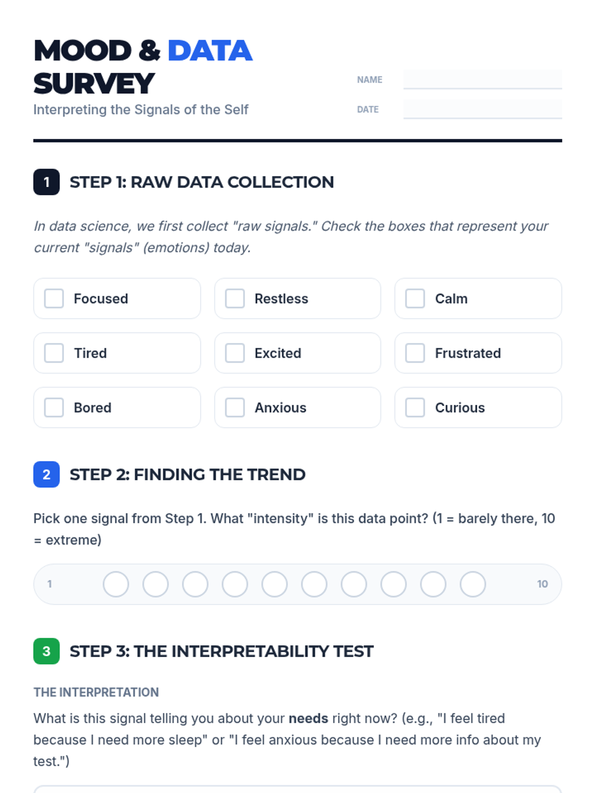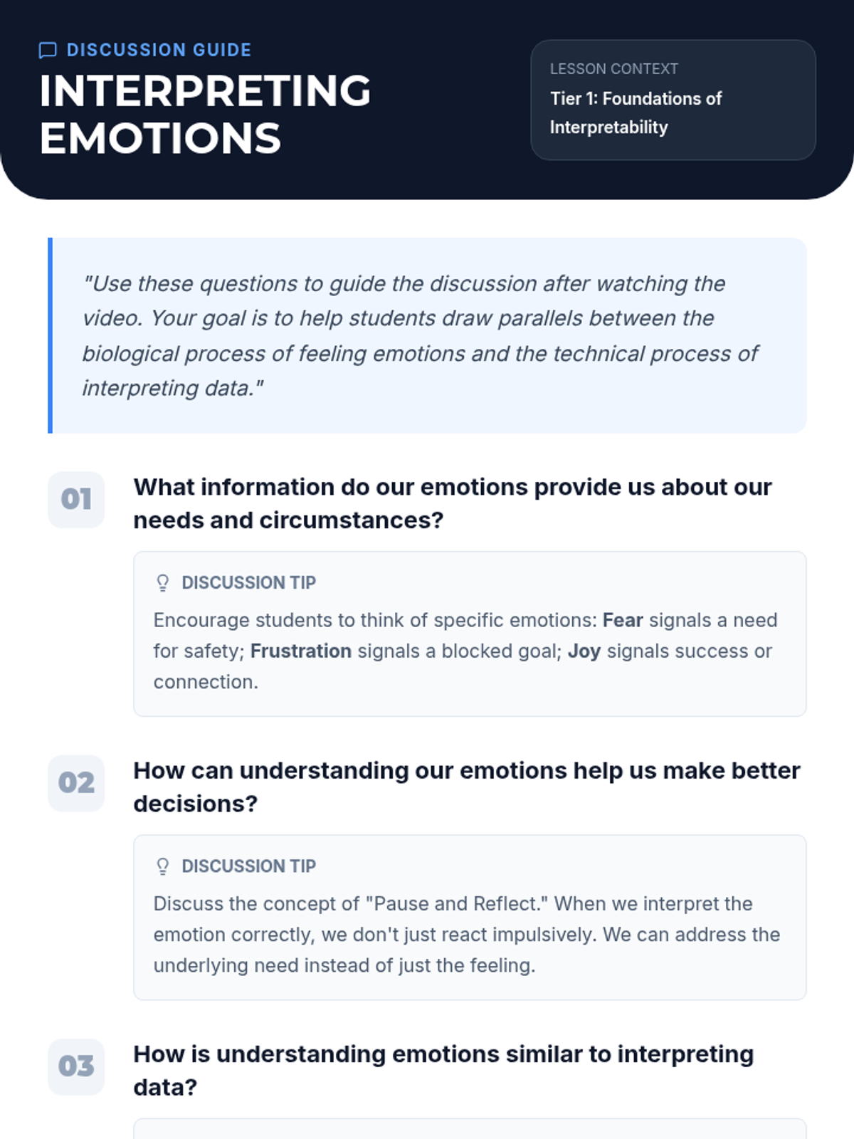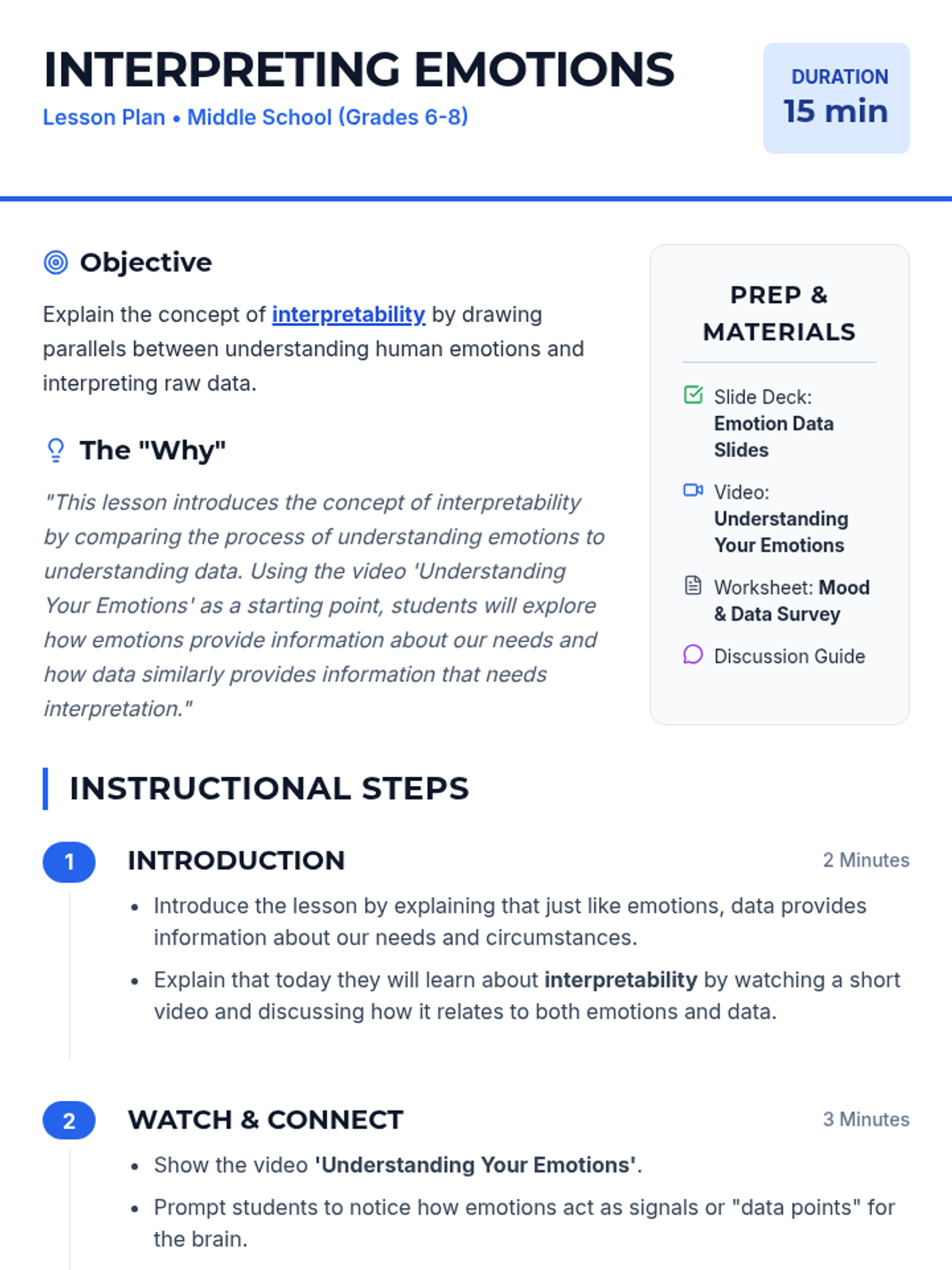 This lesson introduces the concept of interpretability by comparing the process of understanding emotions to understanding data. Students explore how emotions provide information about our needs and how data similarly provides information that needs interpretation.
