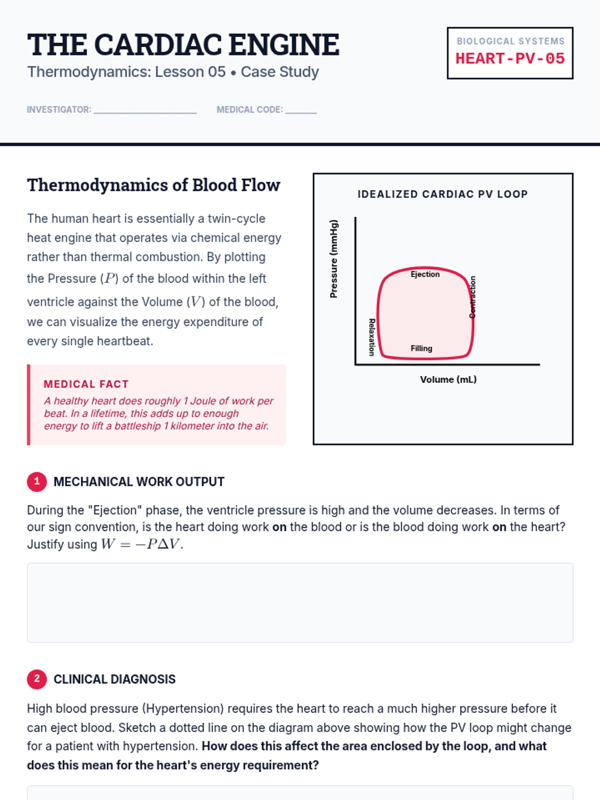 Students interpret complex PV diagrams for real-world engines and biological systems, such as the human heart.