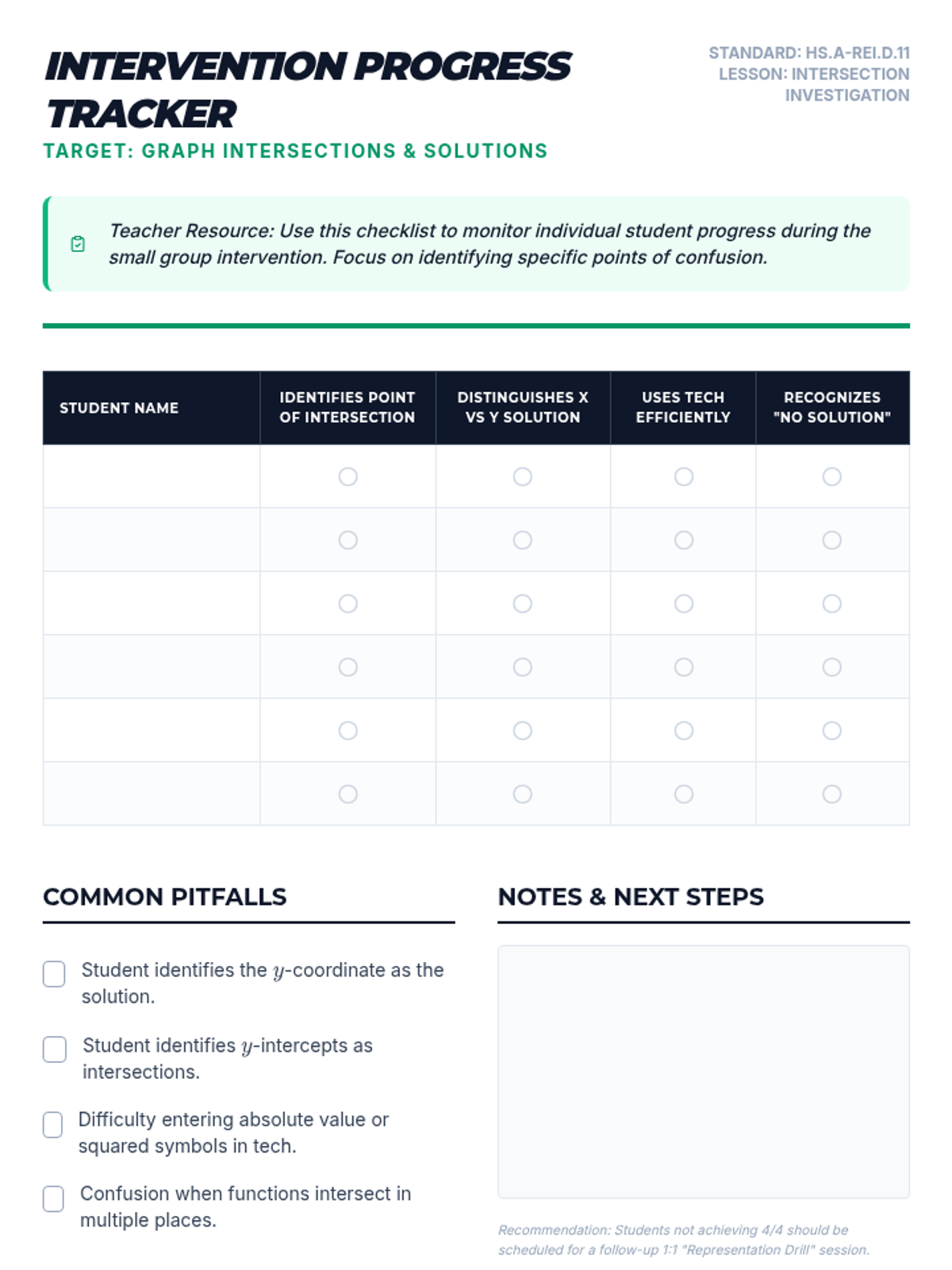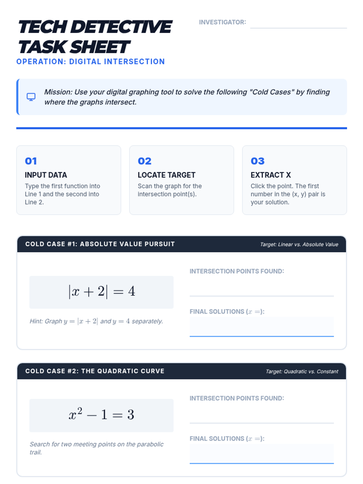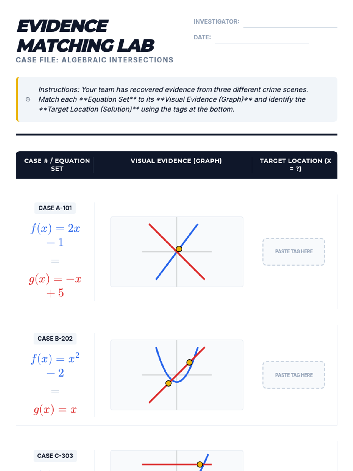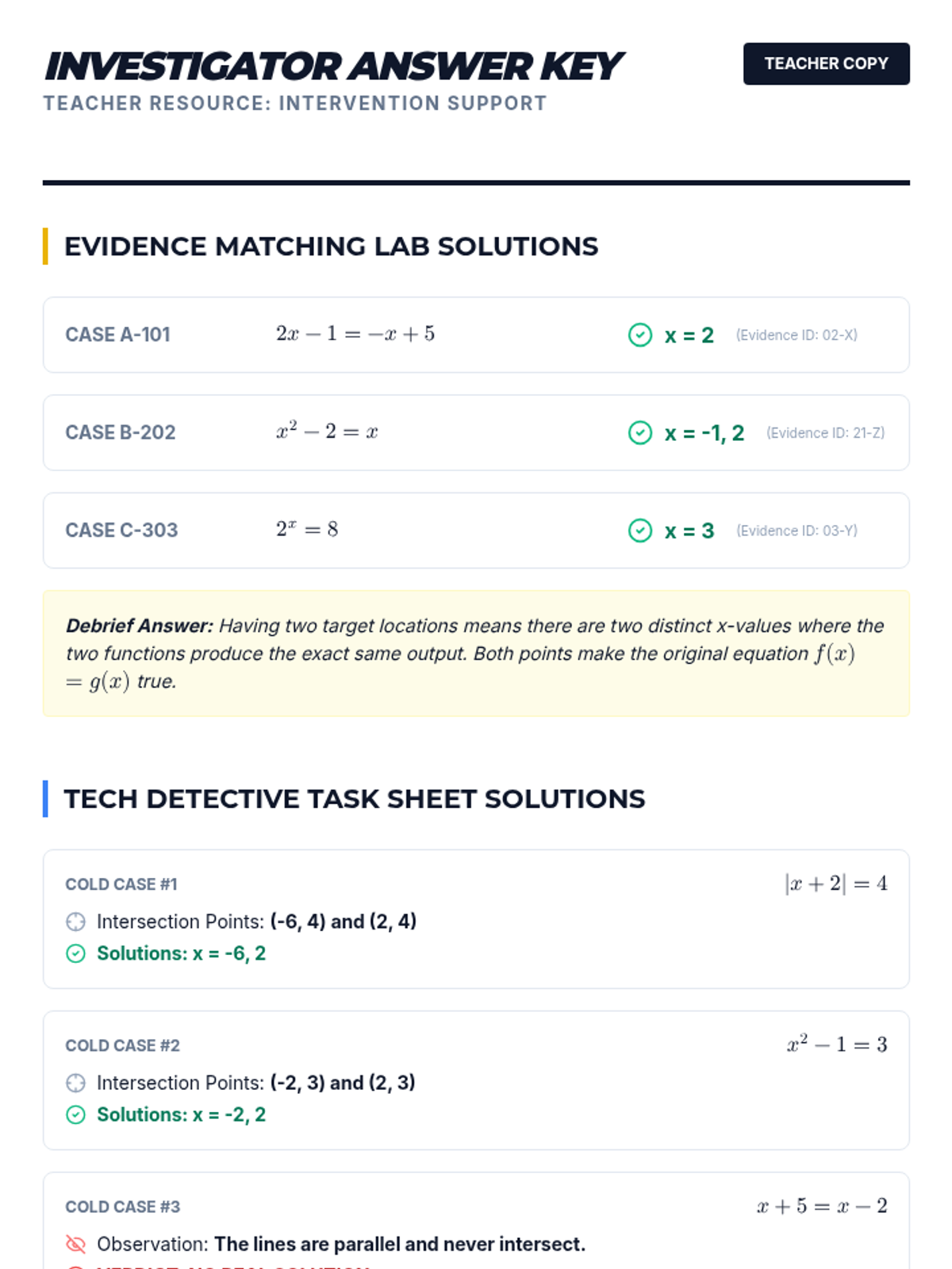 A Tier 2 intervention lesson focusing on solving equations by finding the intersection of graphs. Students will explore multiple function types (linear, quadratic, absolute value, exponential) to understand that the x-coordinate of the intersection point is the solution to f(x) = g(x).