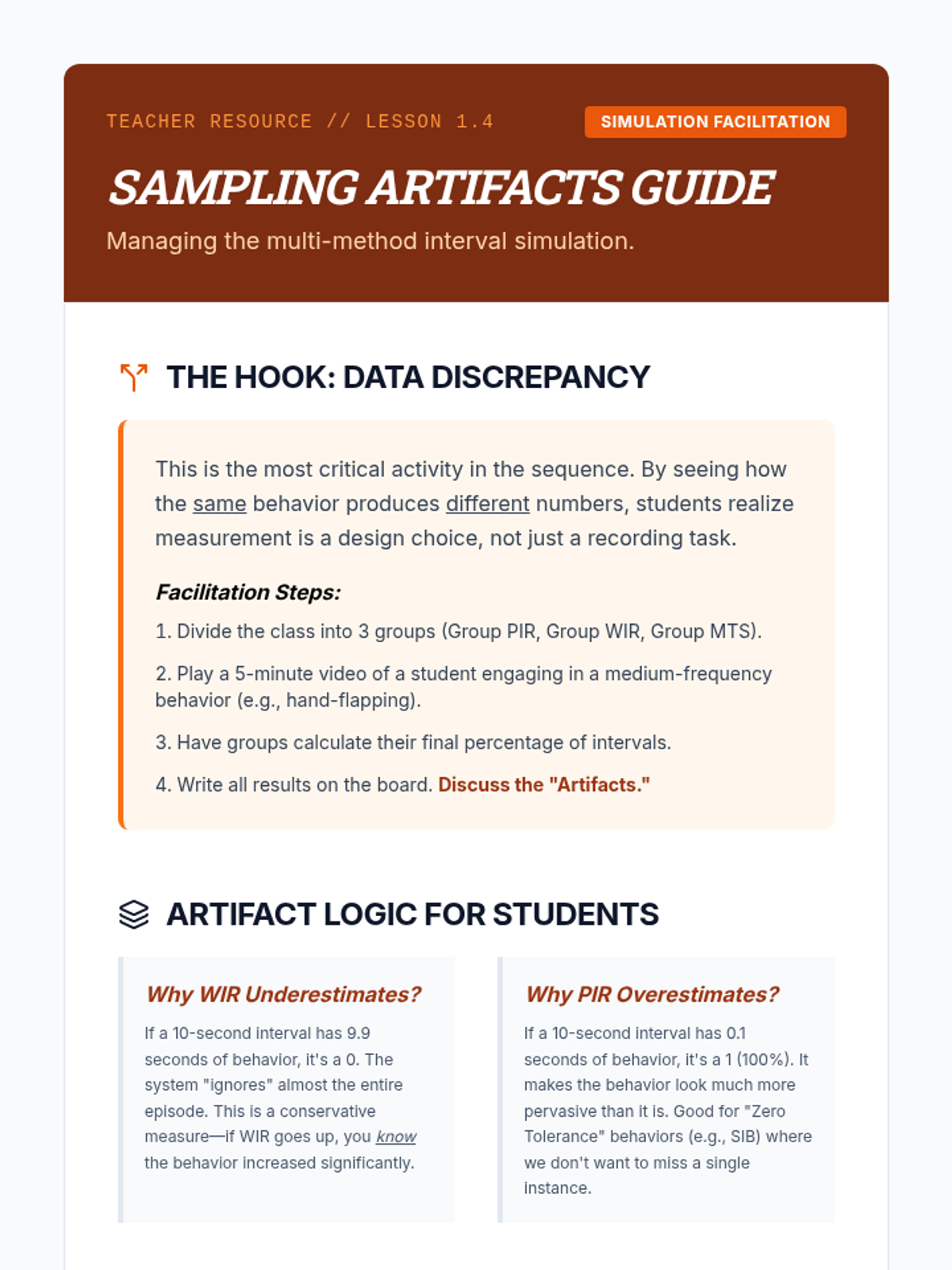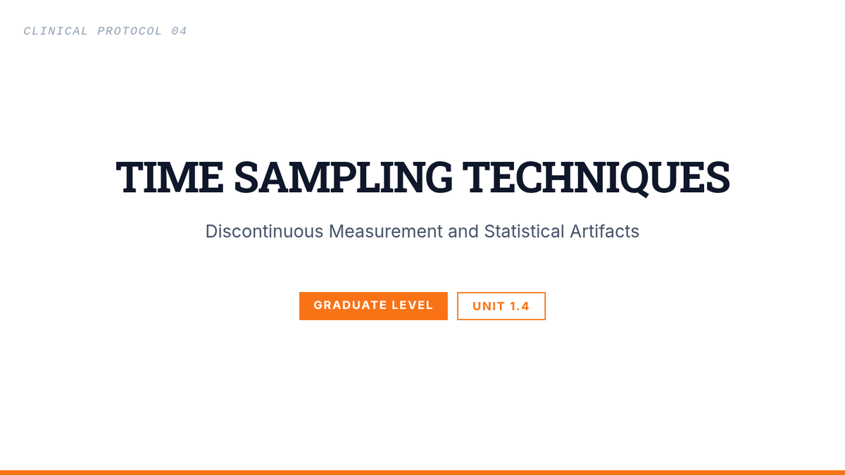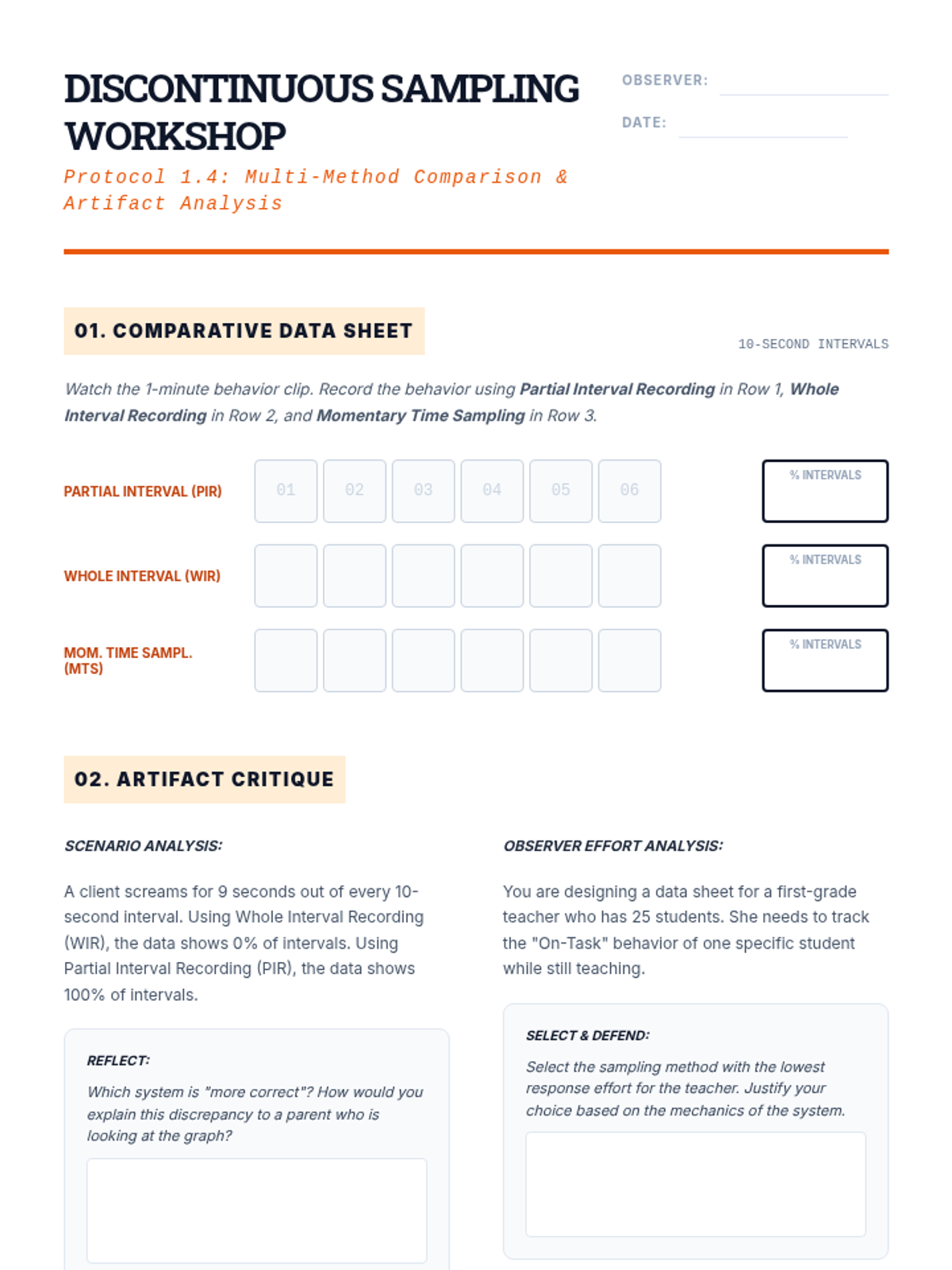 Introduces discontinuous measurement systems including whole-interval, partial-interval, and momentary time sampling. Students analyze measurement artifacts and how these systems over- or underestimate behavior.