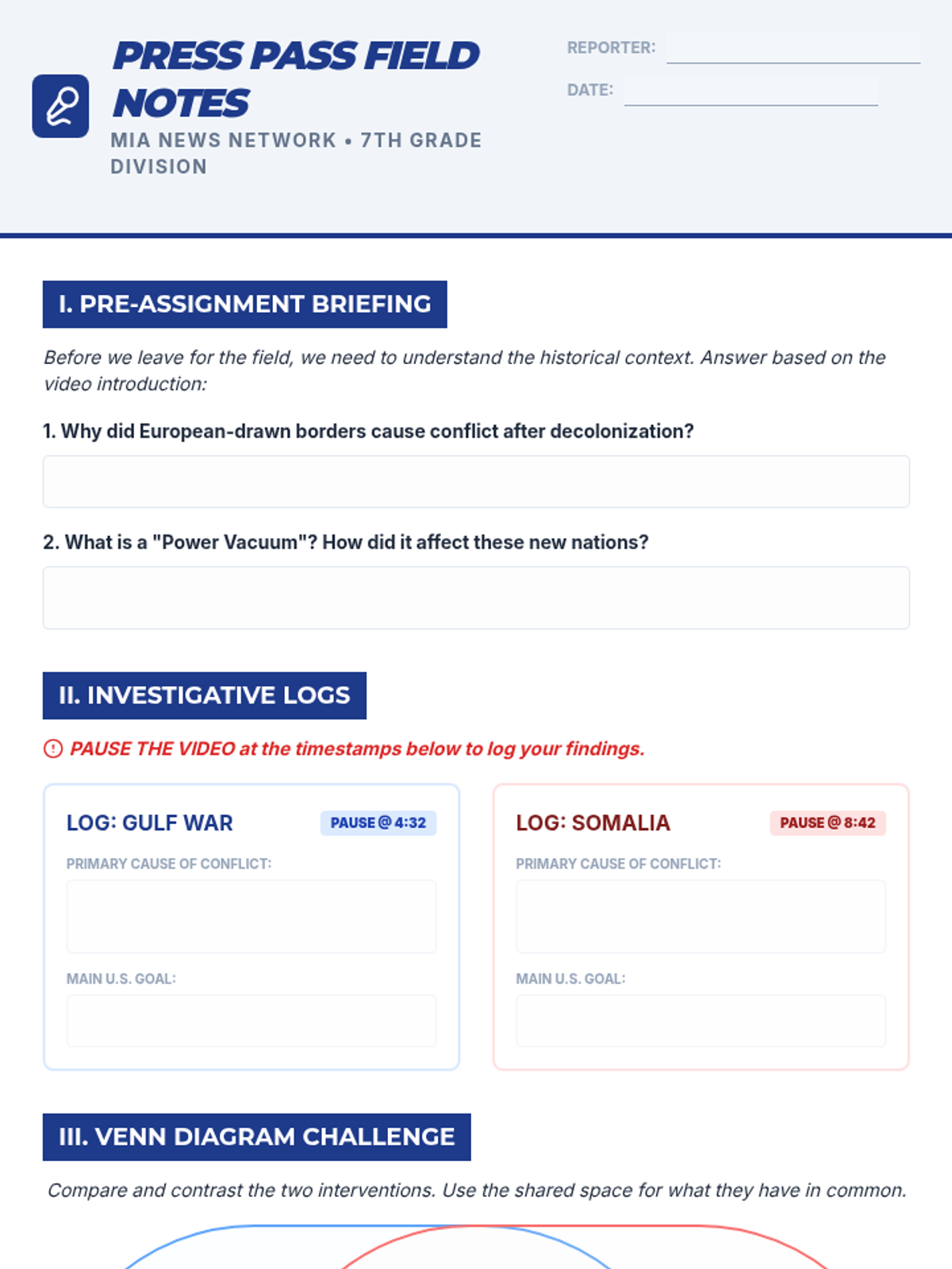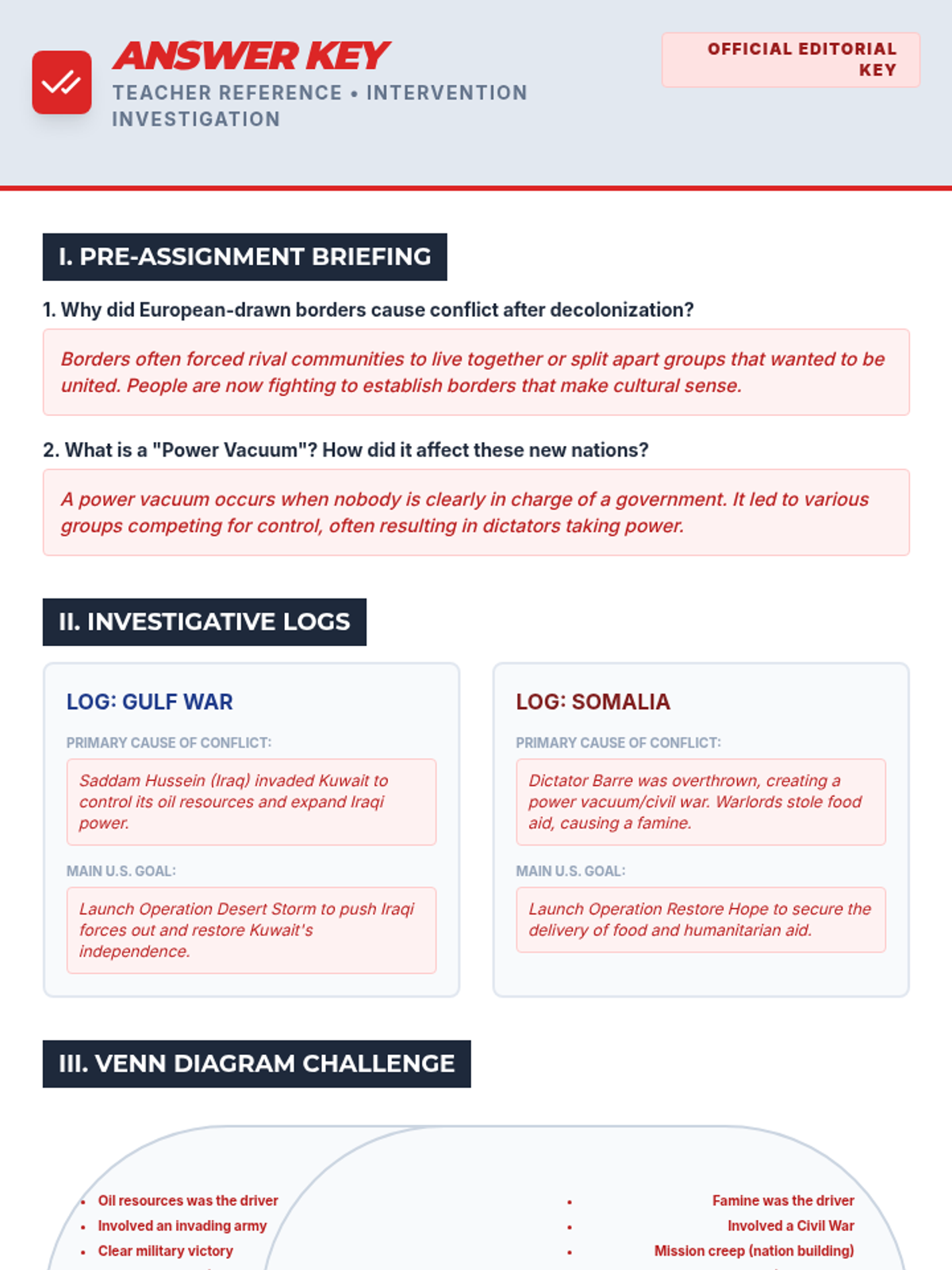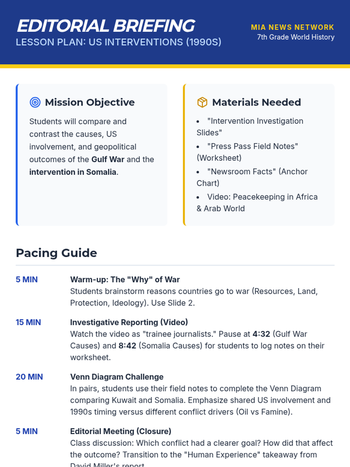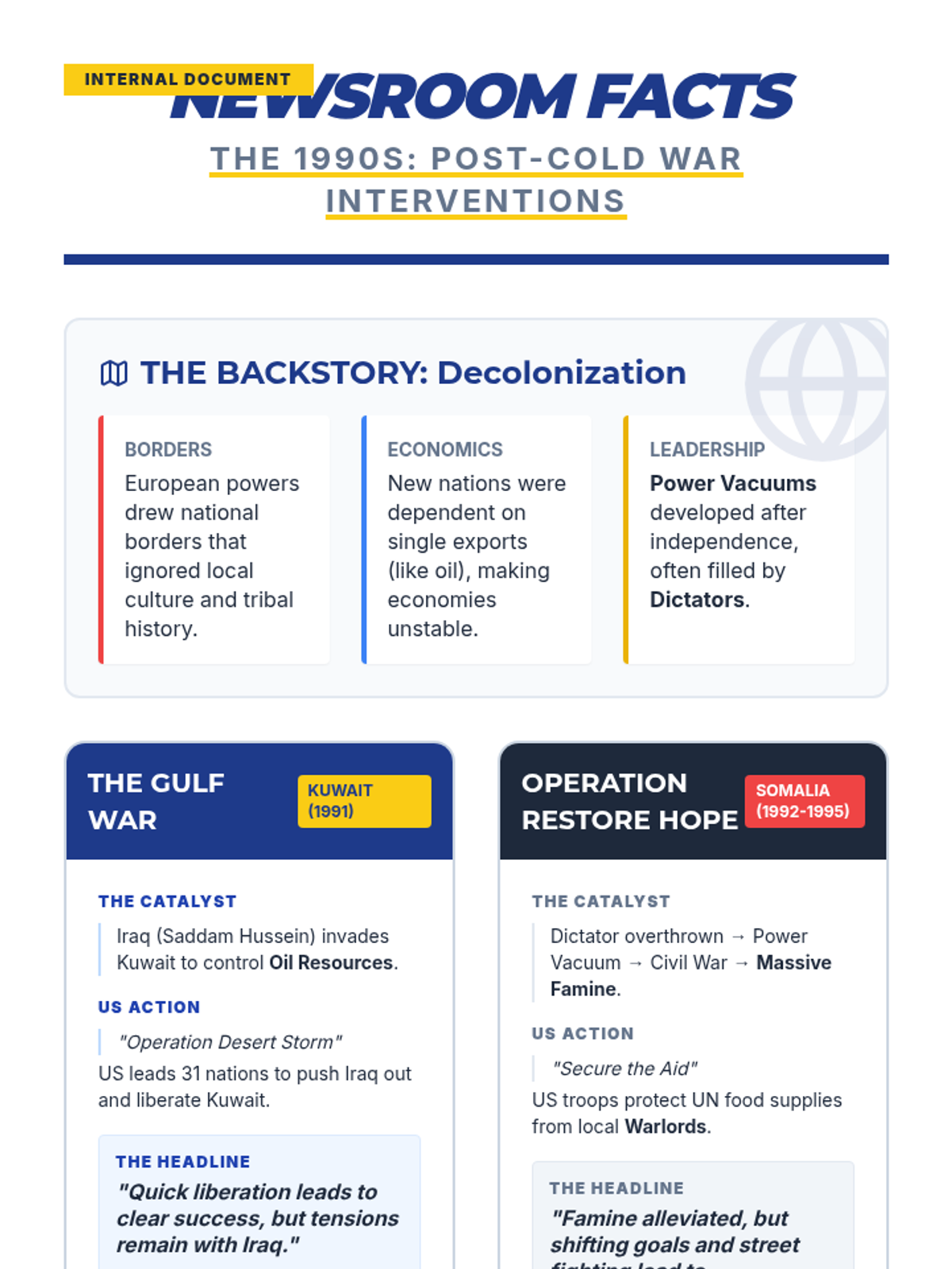 Students investigate the US-led peacekeeping missions in Kuwait and Somalia during the 1990s through a journalism-themed lens. They will analyze the distinct causes, military actions, and outcomes of both conflicts to understand the complexities of international intervention.