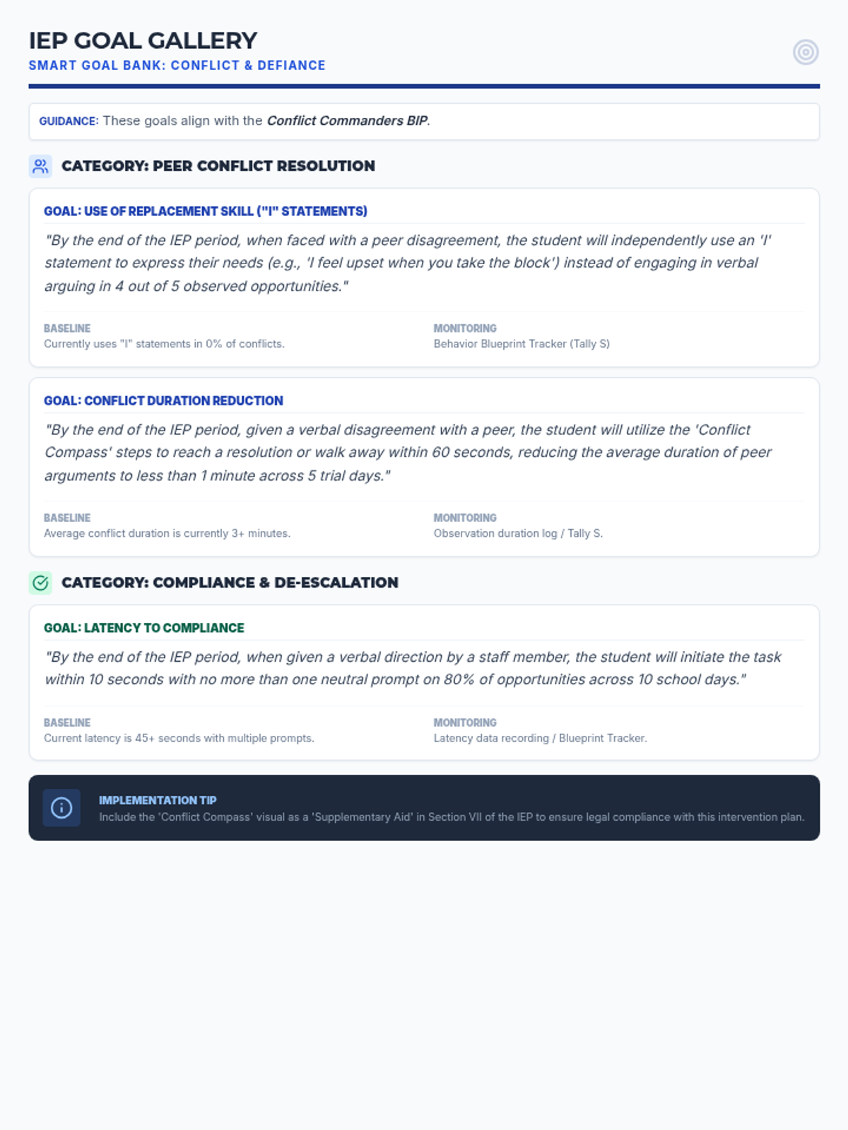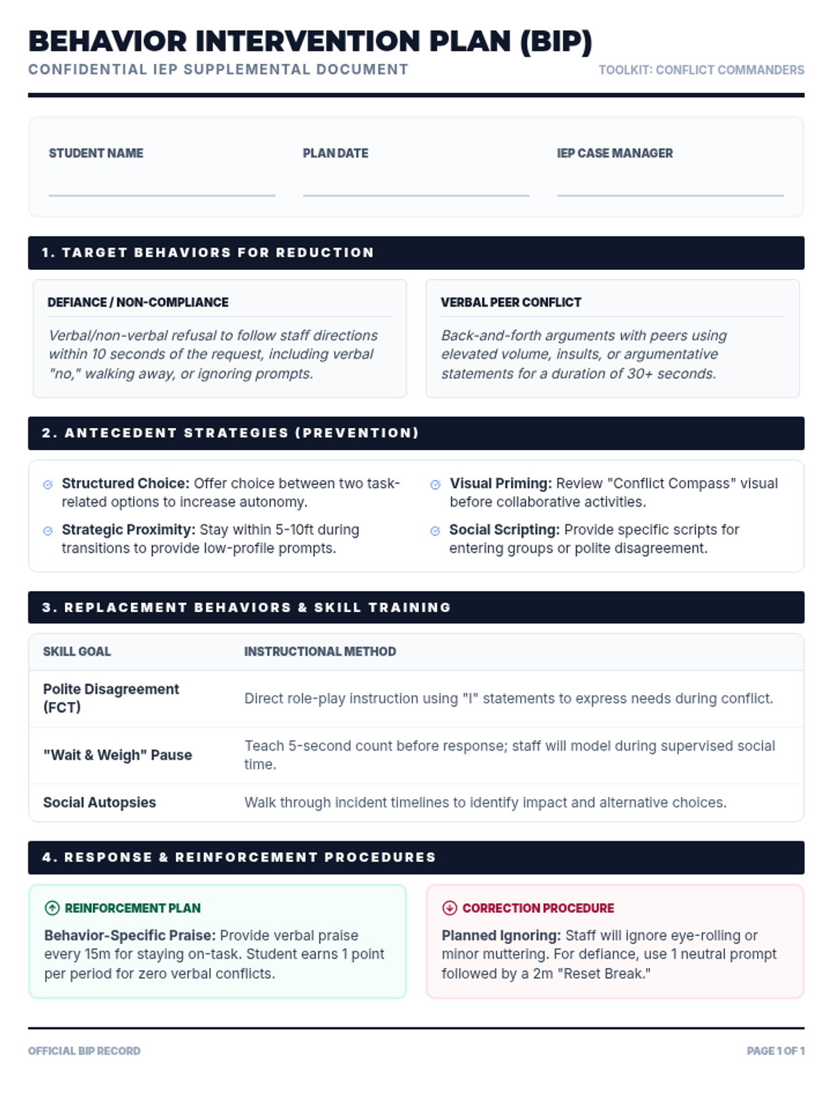 A comprehensive set of tools for managing and reducing peer defiance and verbal conflict, focusing on proactive BIP strategies, student-facing visuals, and data collection.