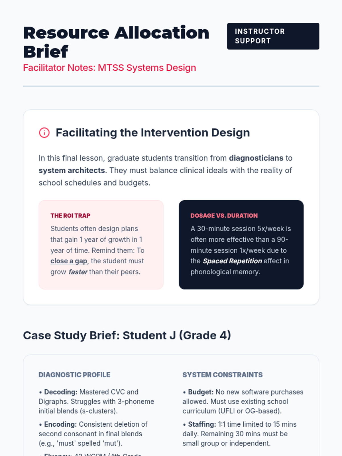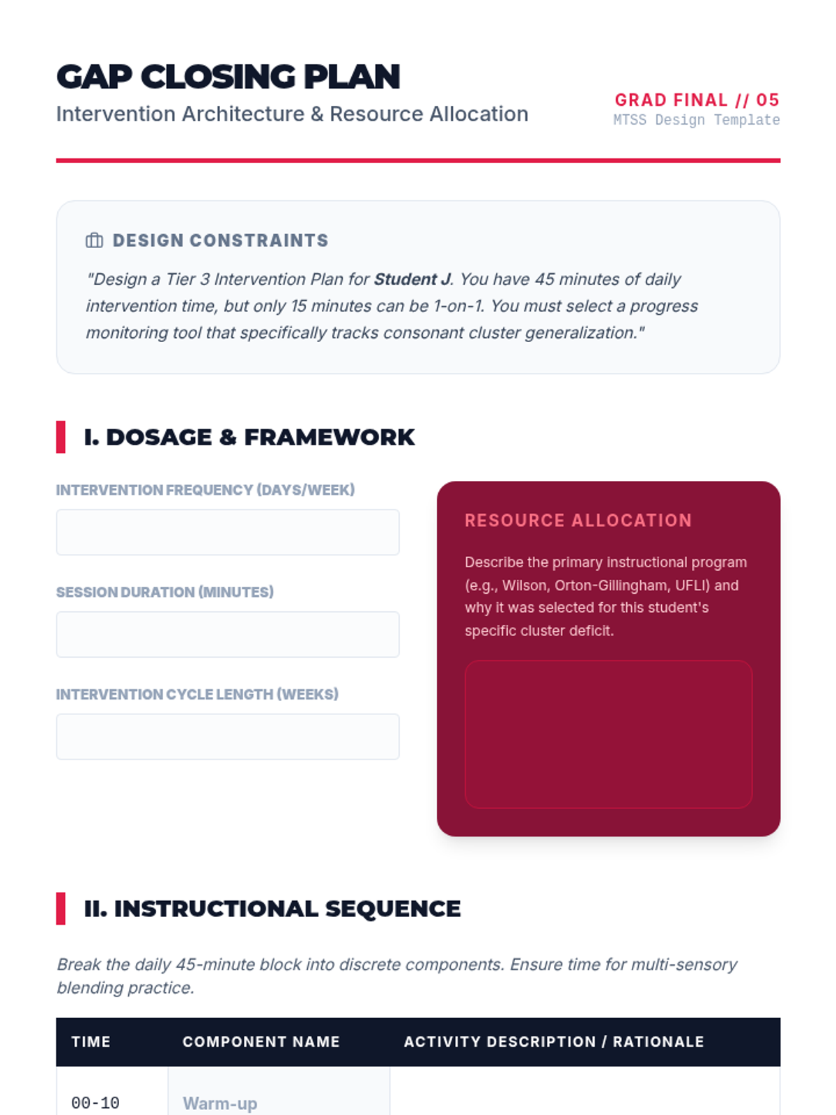 Students design a comprehensive Tier 2 or Tier 3 intervention plan for a specific case study student, balancing budget constraints with evidence-based practices to close reading gaps.