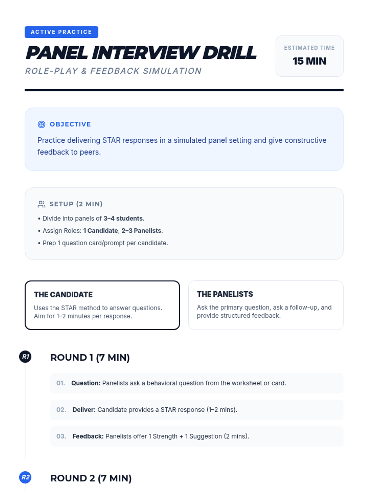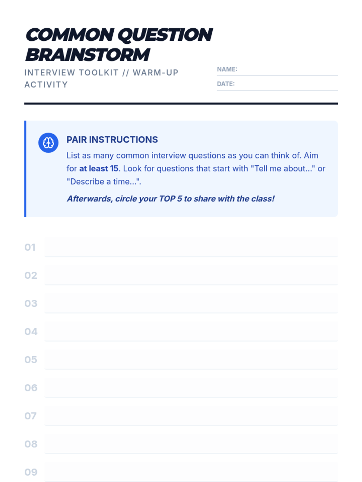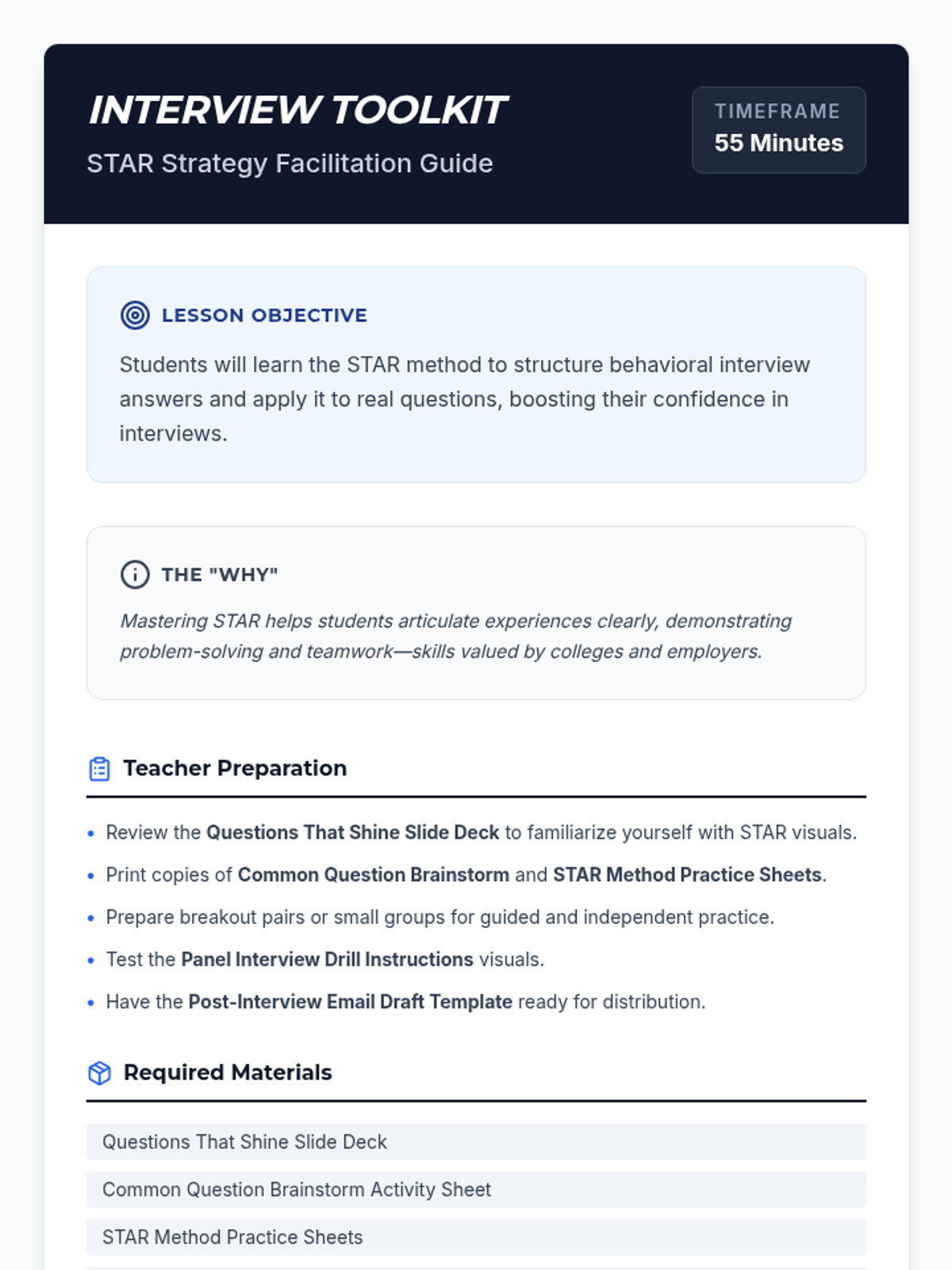 A comprehensive 9th-grade lesson on mastering interview skills using the STAR method, featuring a slide deck, brainstorming activities, and mock interview drills.