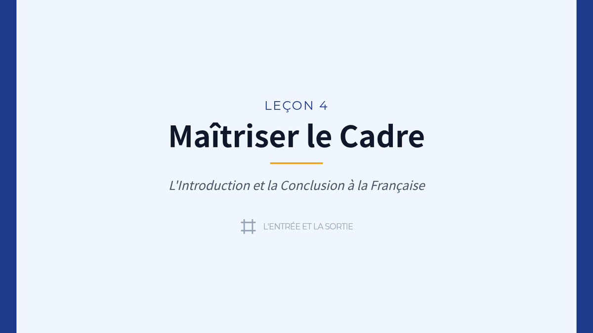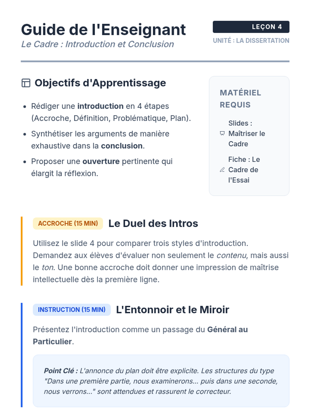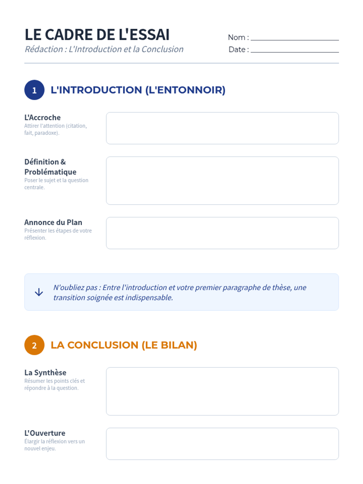 Students master the four-part French introduction and the reflective conclusion with an 'ouverture'.