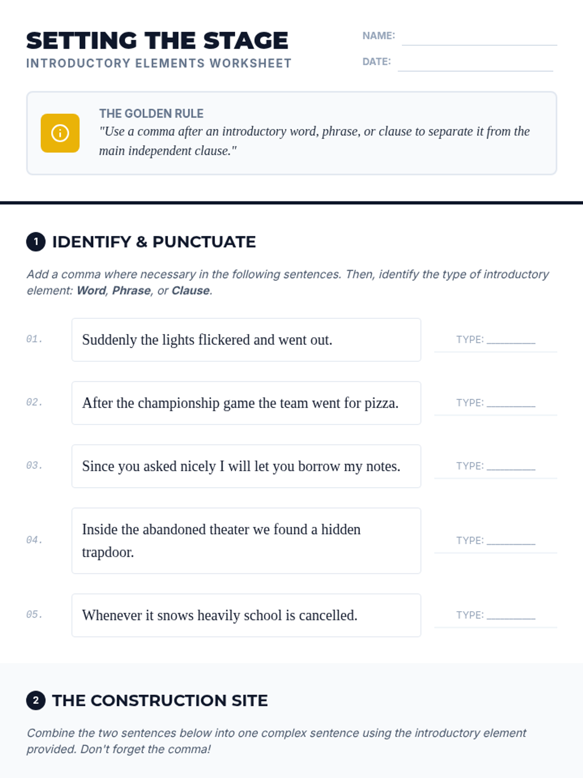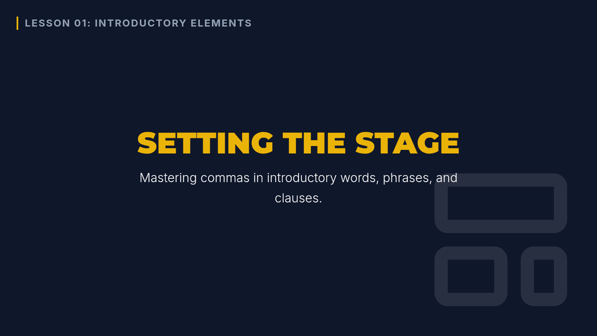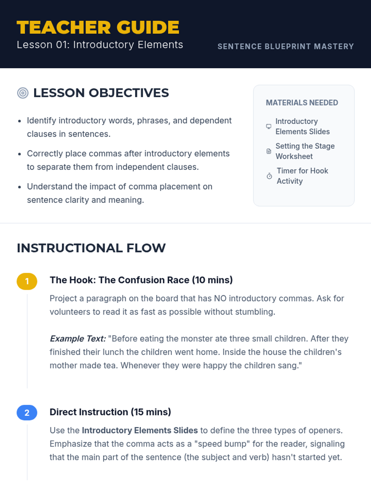 Students learn to identify and punctuate introductory words, phrases, and dependent clauses, focusing on how these elements set the stage for the main independent clause.