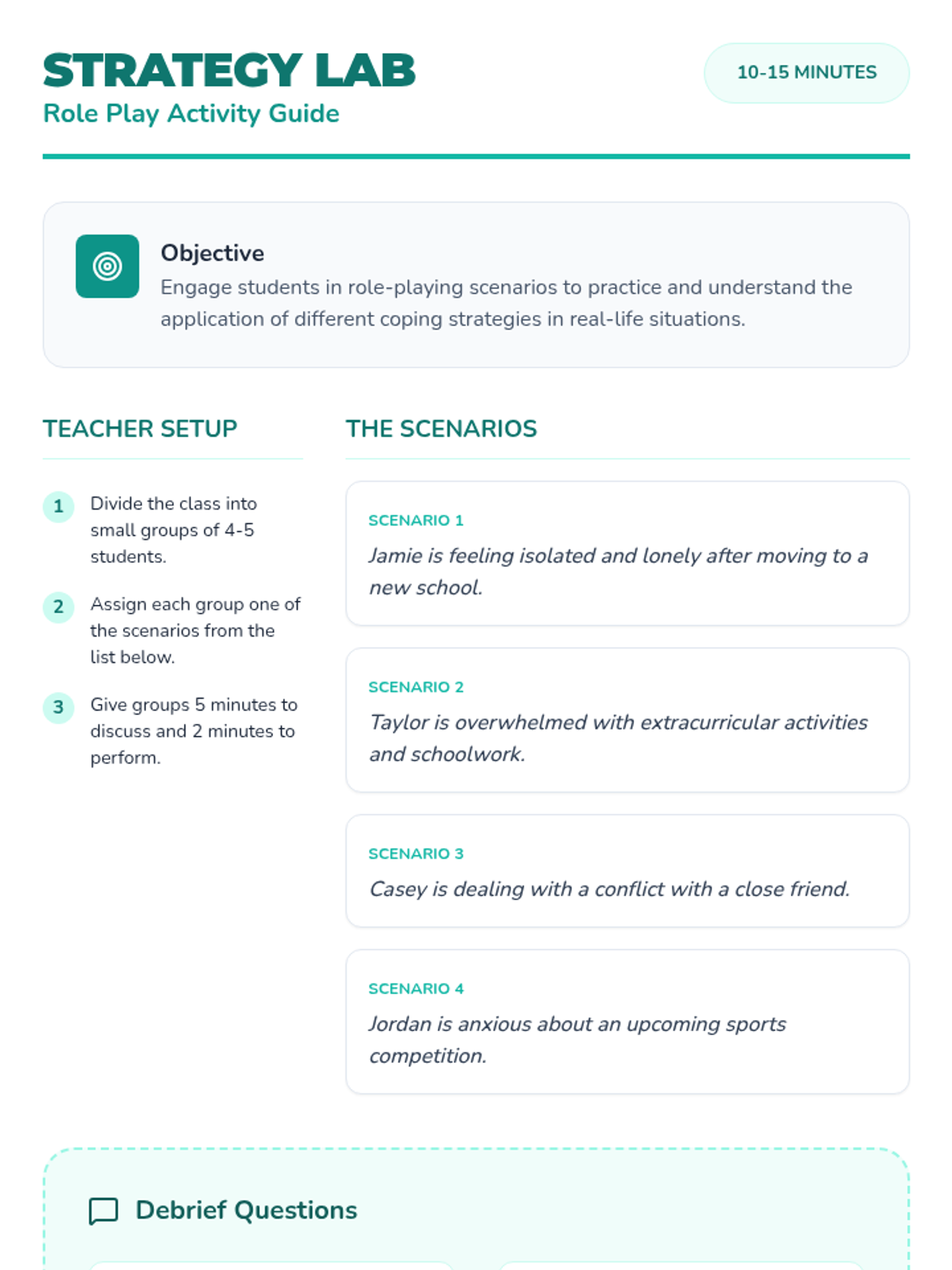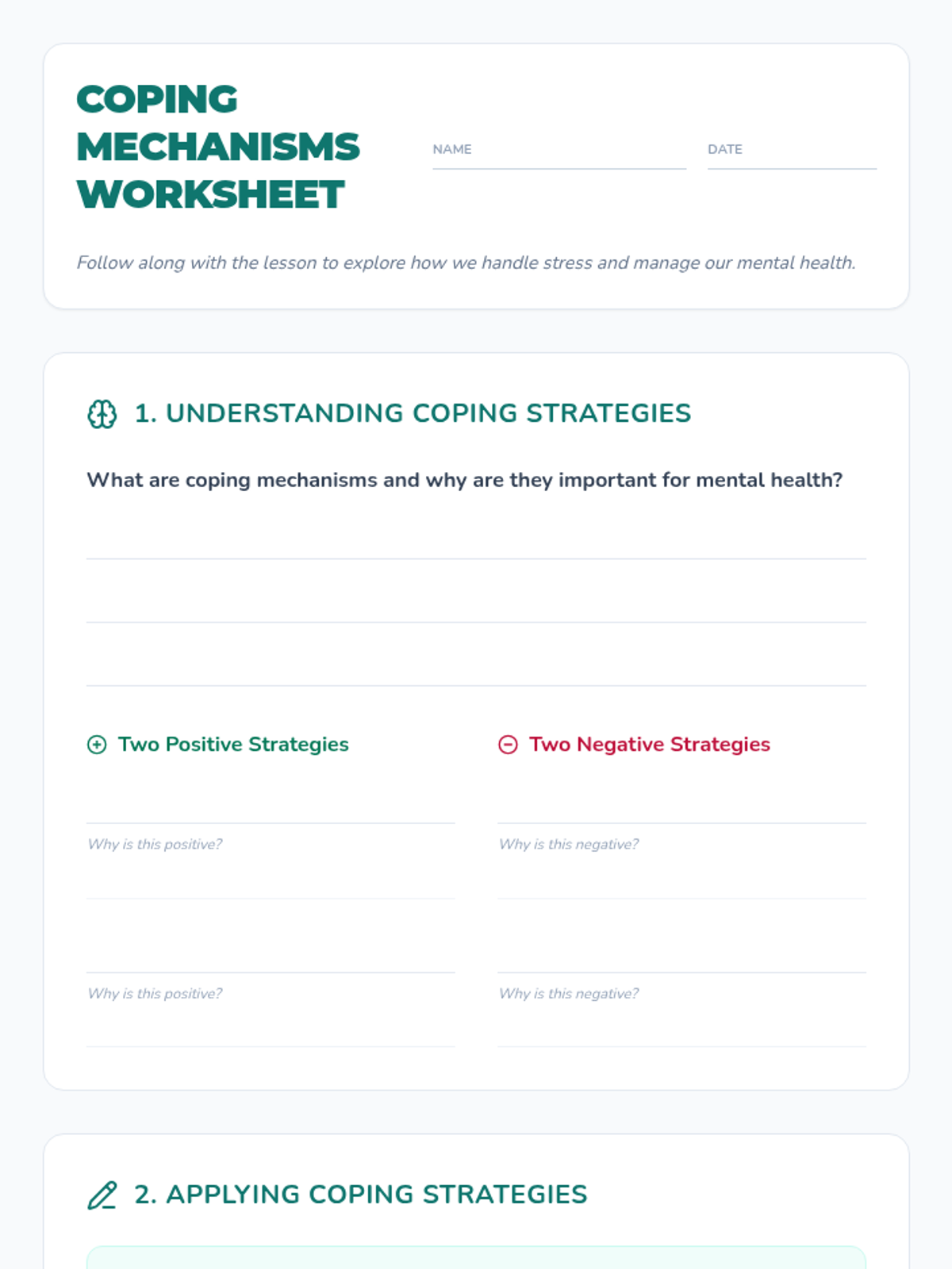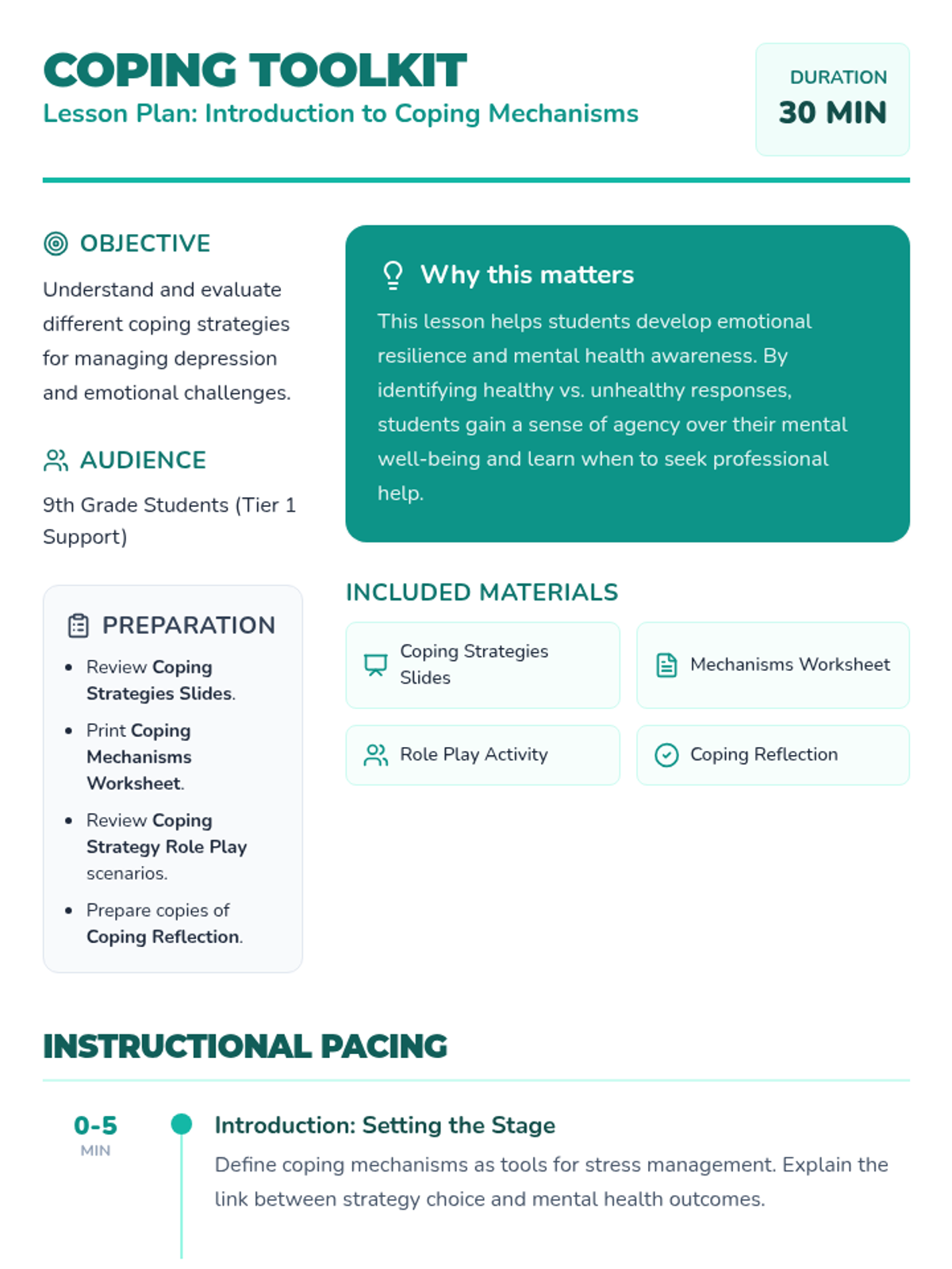 A 30-minute lesson for 9th-grade students exploring positive and negative coping mechanisms, their long-term effectiveness, and practical application in managing stress and depression.