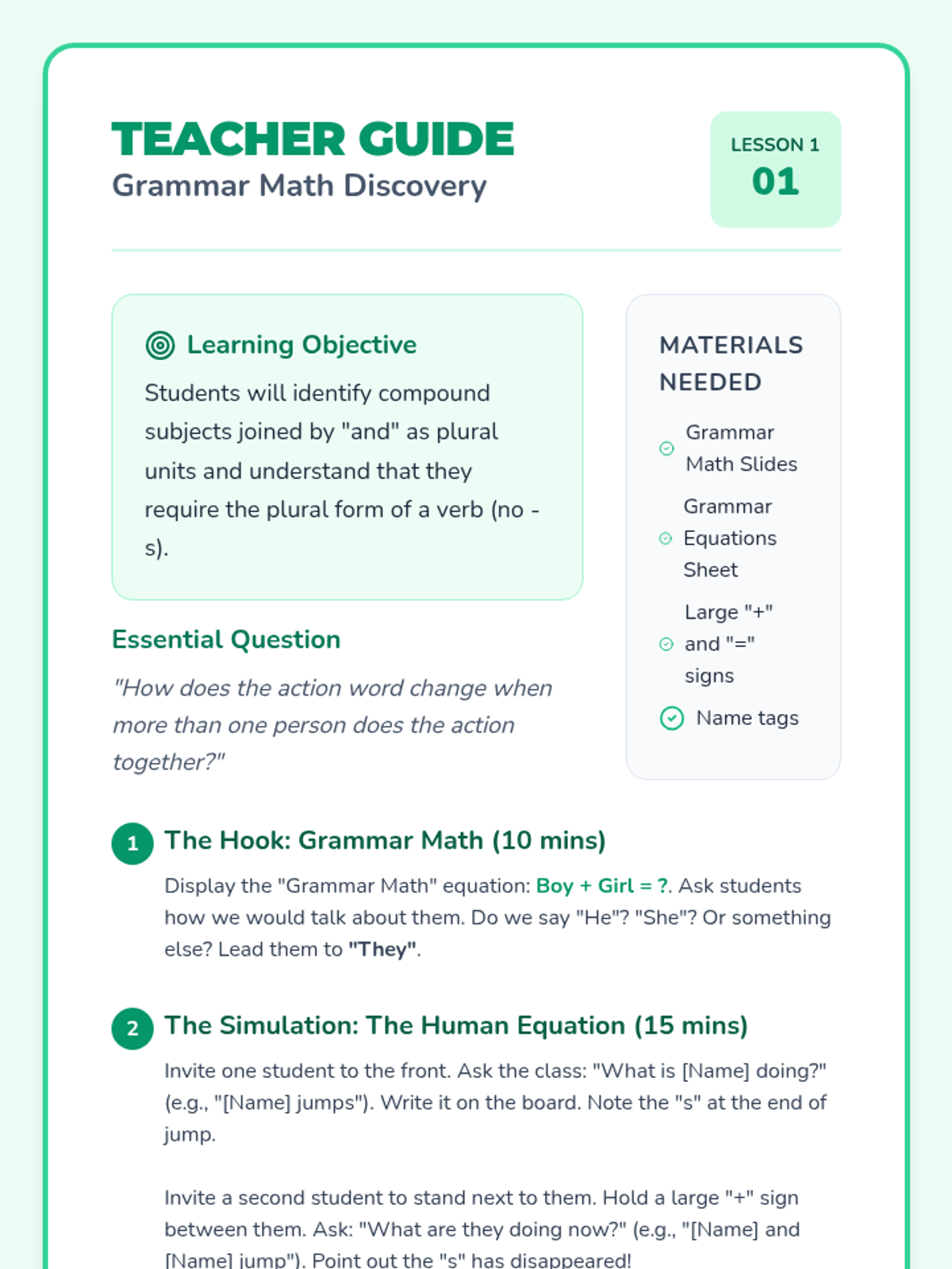Students discover that joining two names with 'and' creates a group. They practice physically standing together to represent compound subjects and observing that they are now a 'plural' unit.