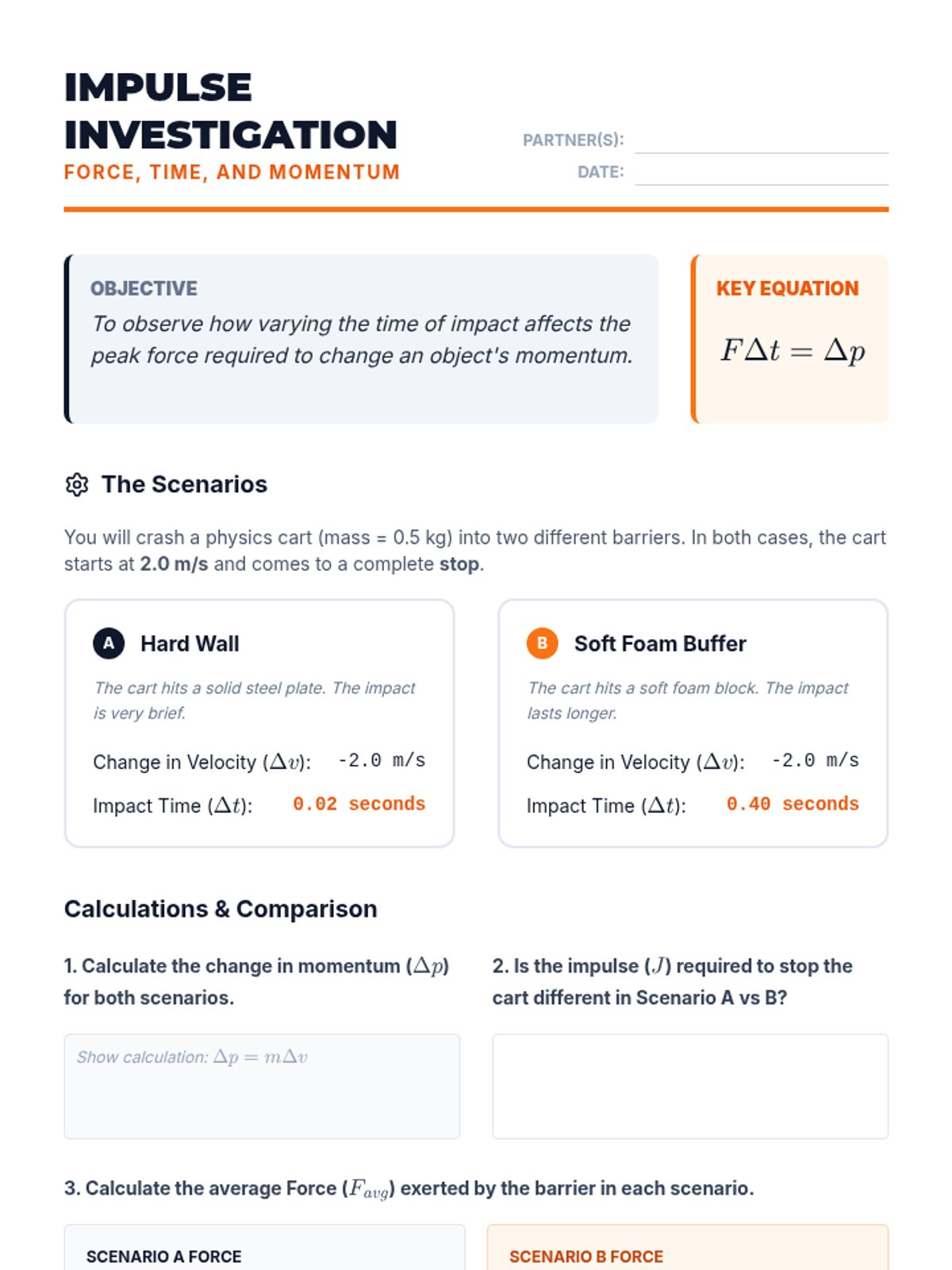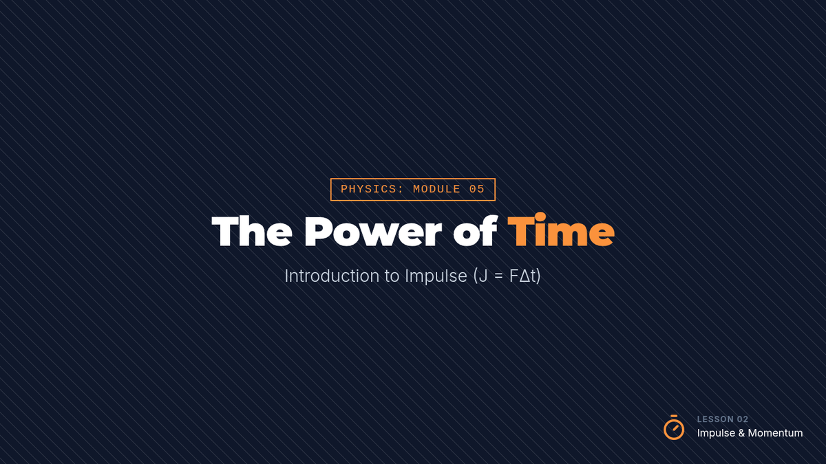 Introduces Impulse as a change in momentum and the relationship between force, time, and motion.