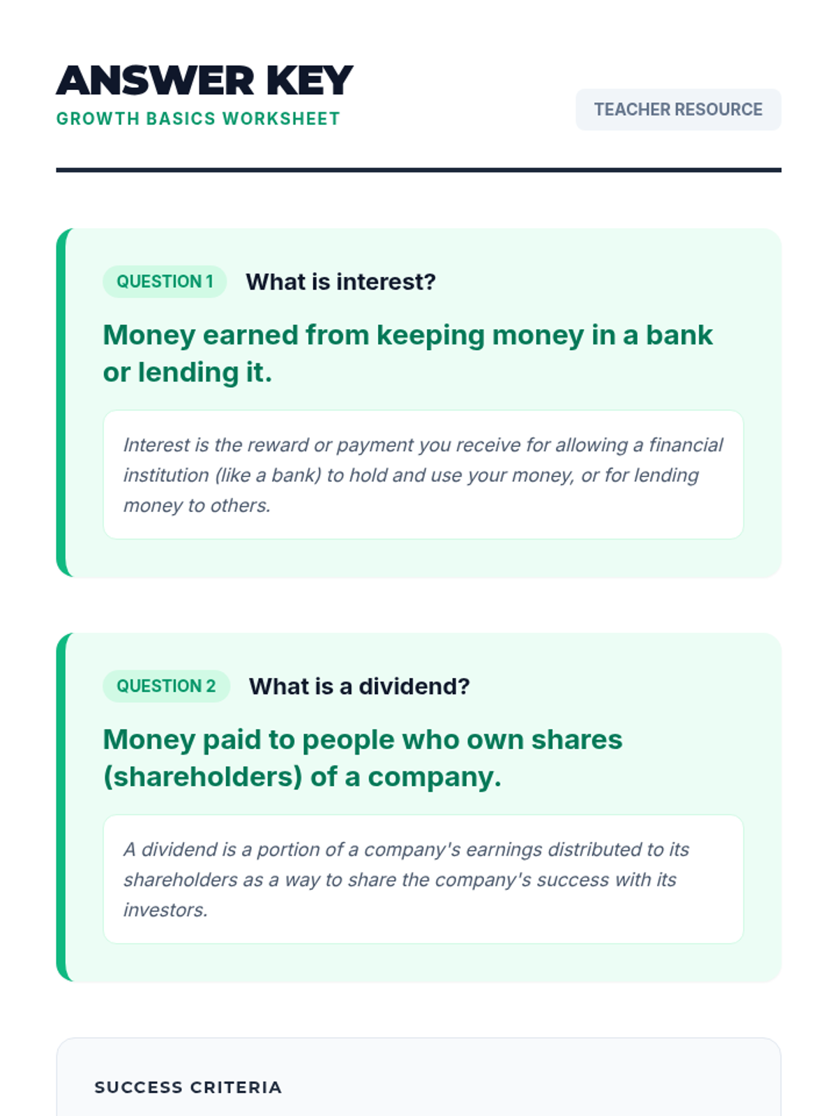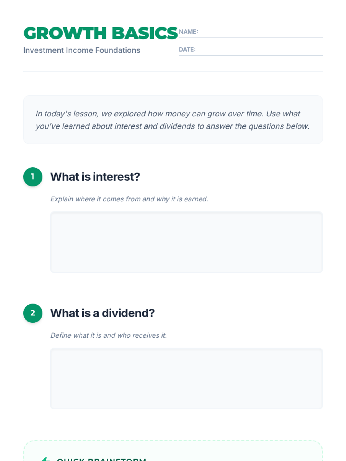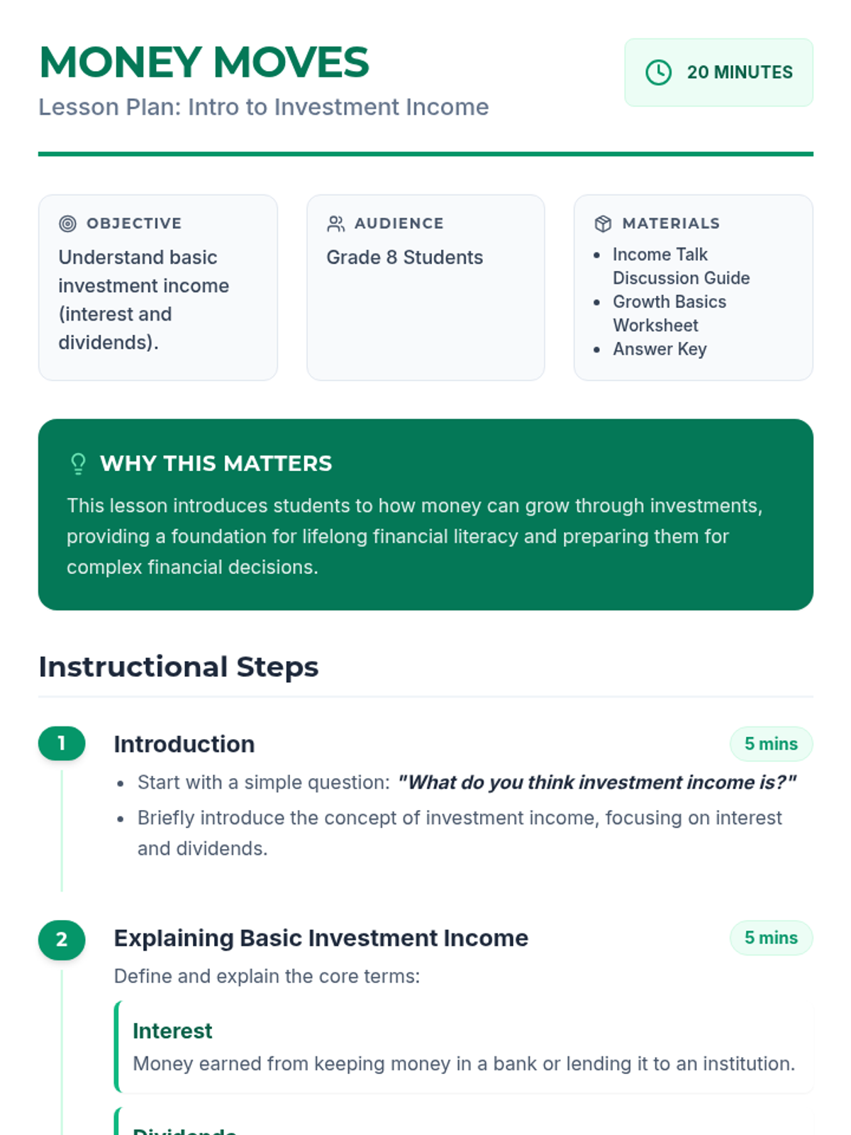 A foundational lesson for Grade 8 students on investment income, specifically interest and dividends. Students explore how money earns more money through banking and stock ownership.
