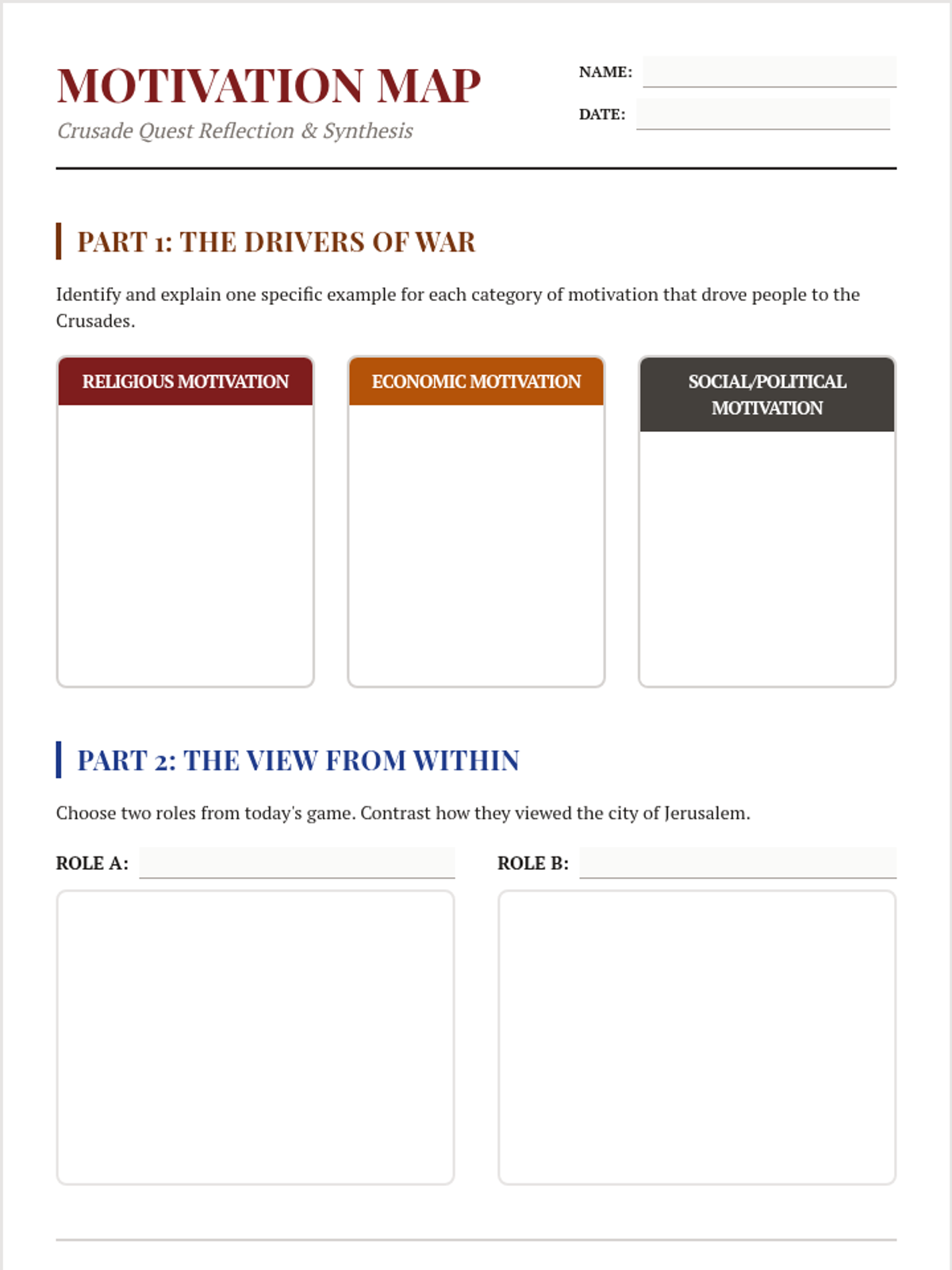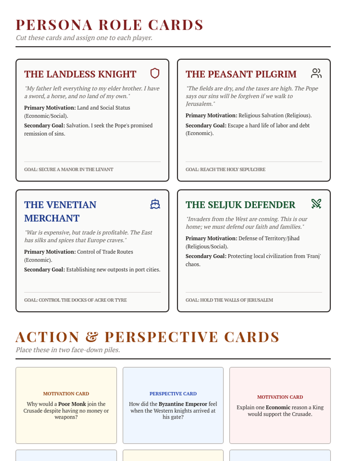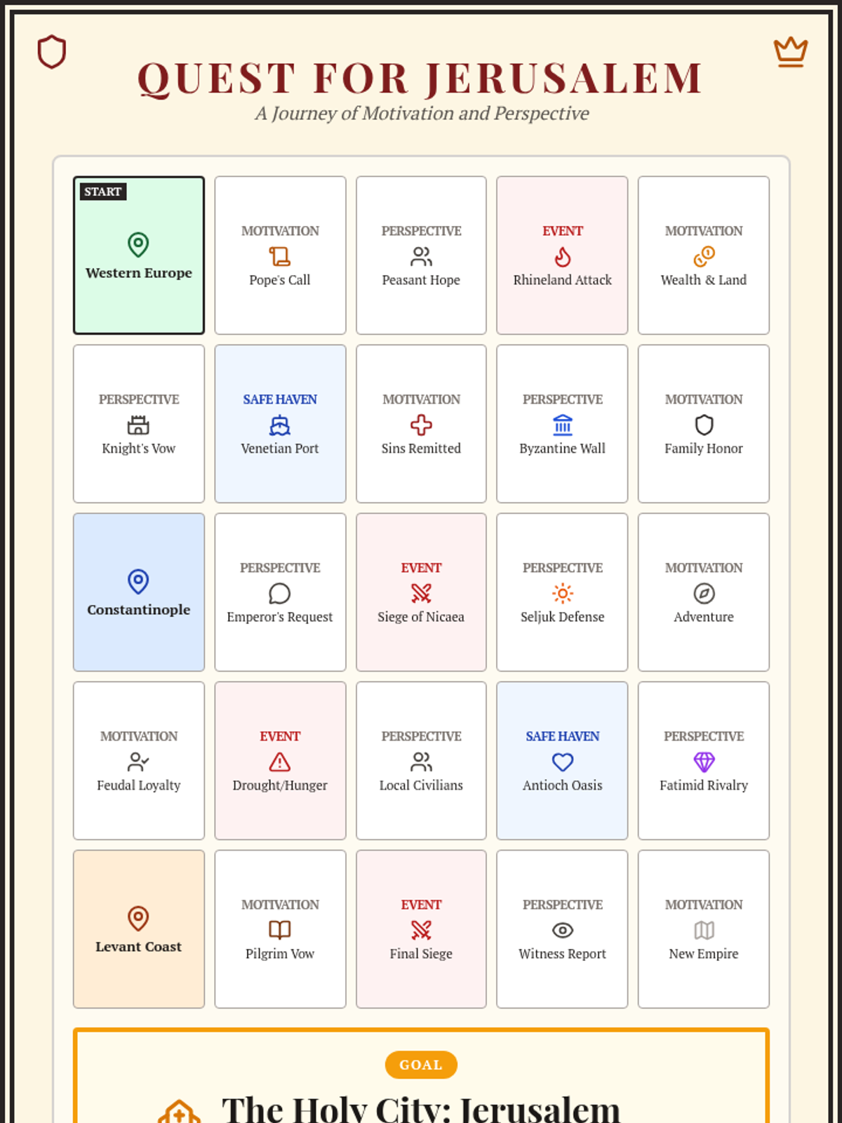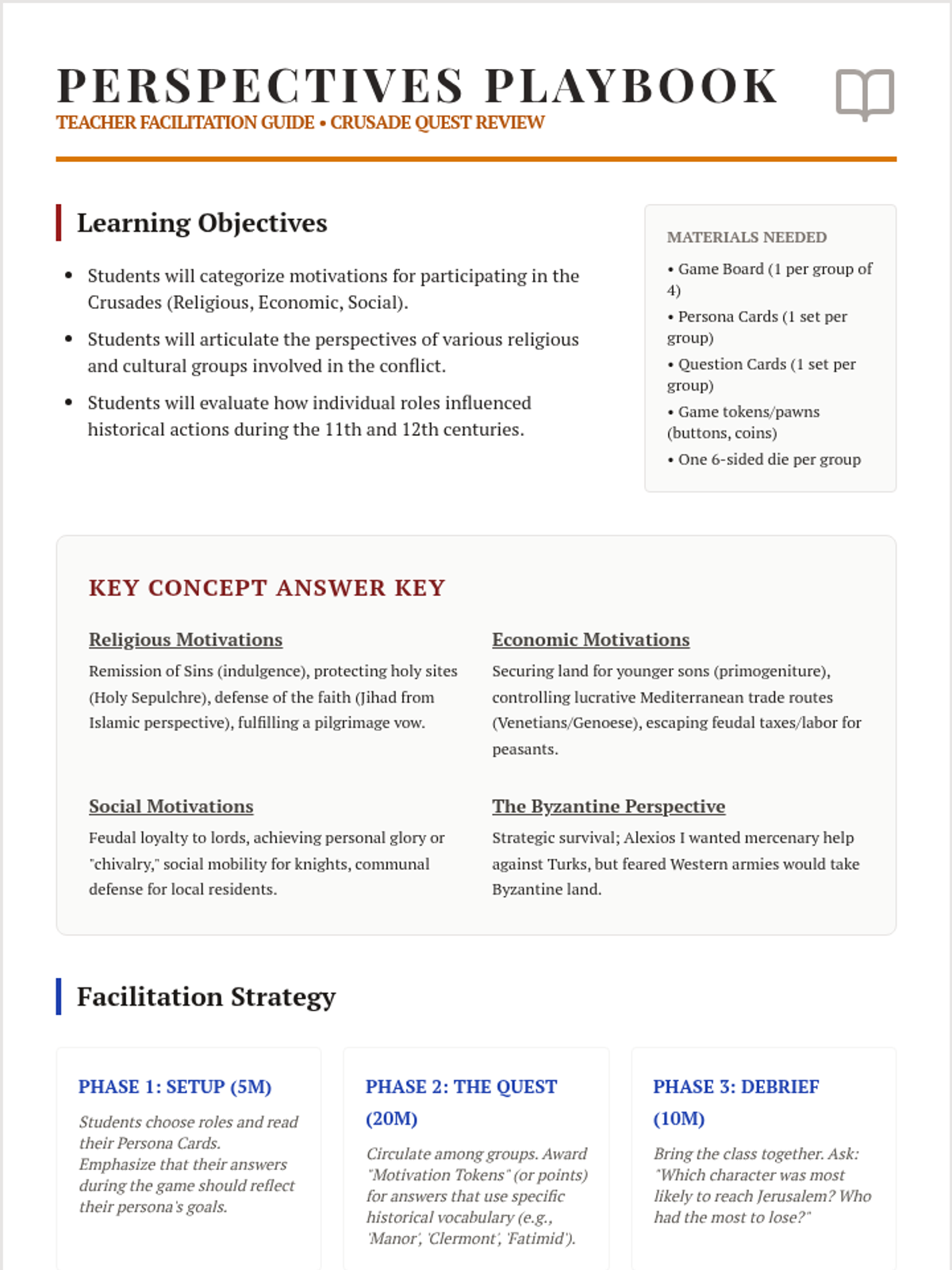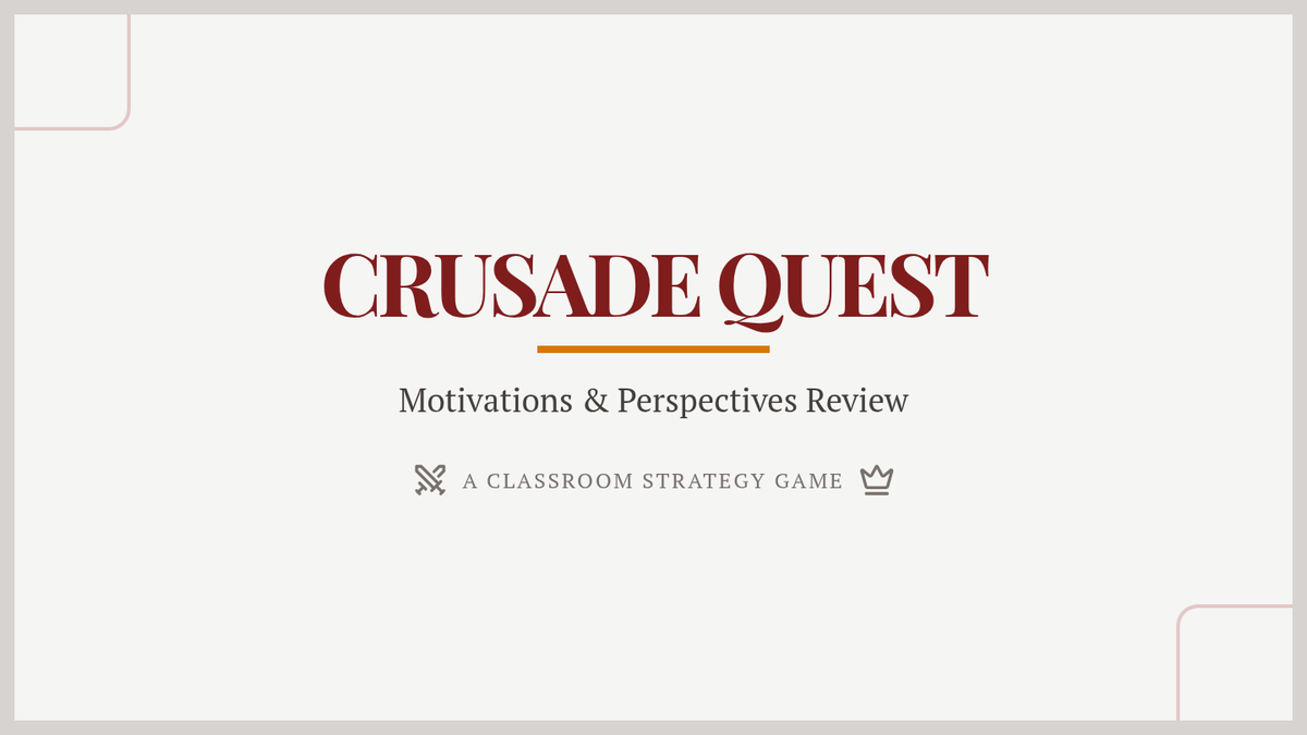 An interactive review lesson that uses a board game and role-play elements to examine the diverse motivations and religious perspectives of the Crusades. Students evaluate the social, economic, and spiritual drivers behind the conflict from multiple viewpoints.