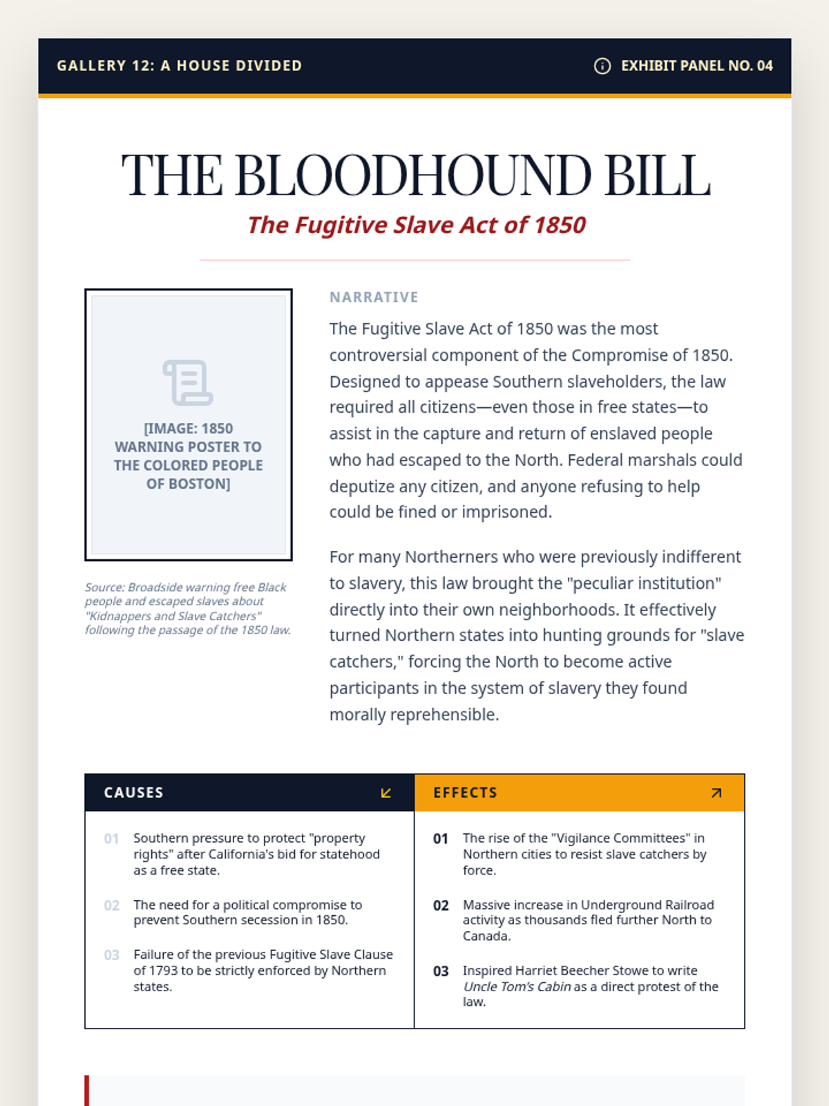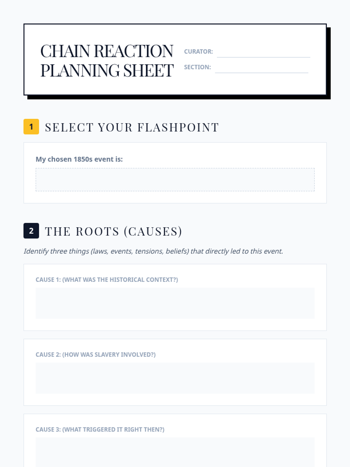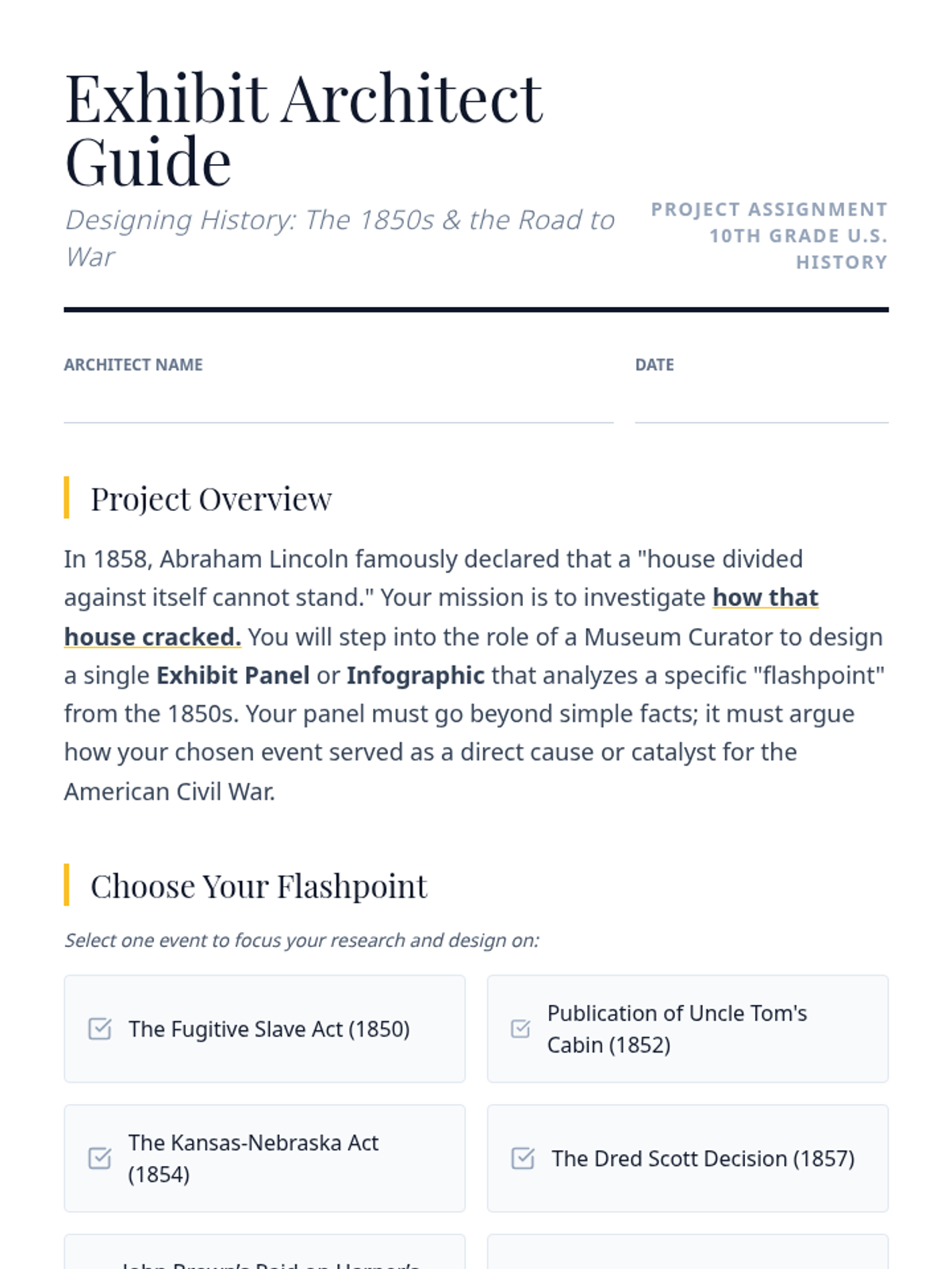 A project-based lesson where students design museum exhibit panels analyzing how the expansion of slavery in the 1850s led to the Civil War. Students focus on cause-and-effect relationships through historical research and visual design.