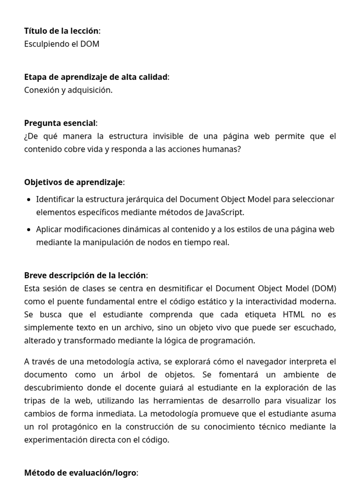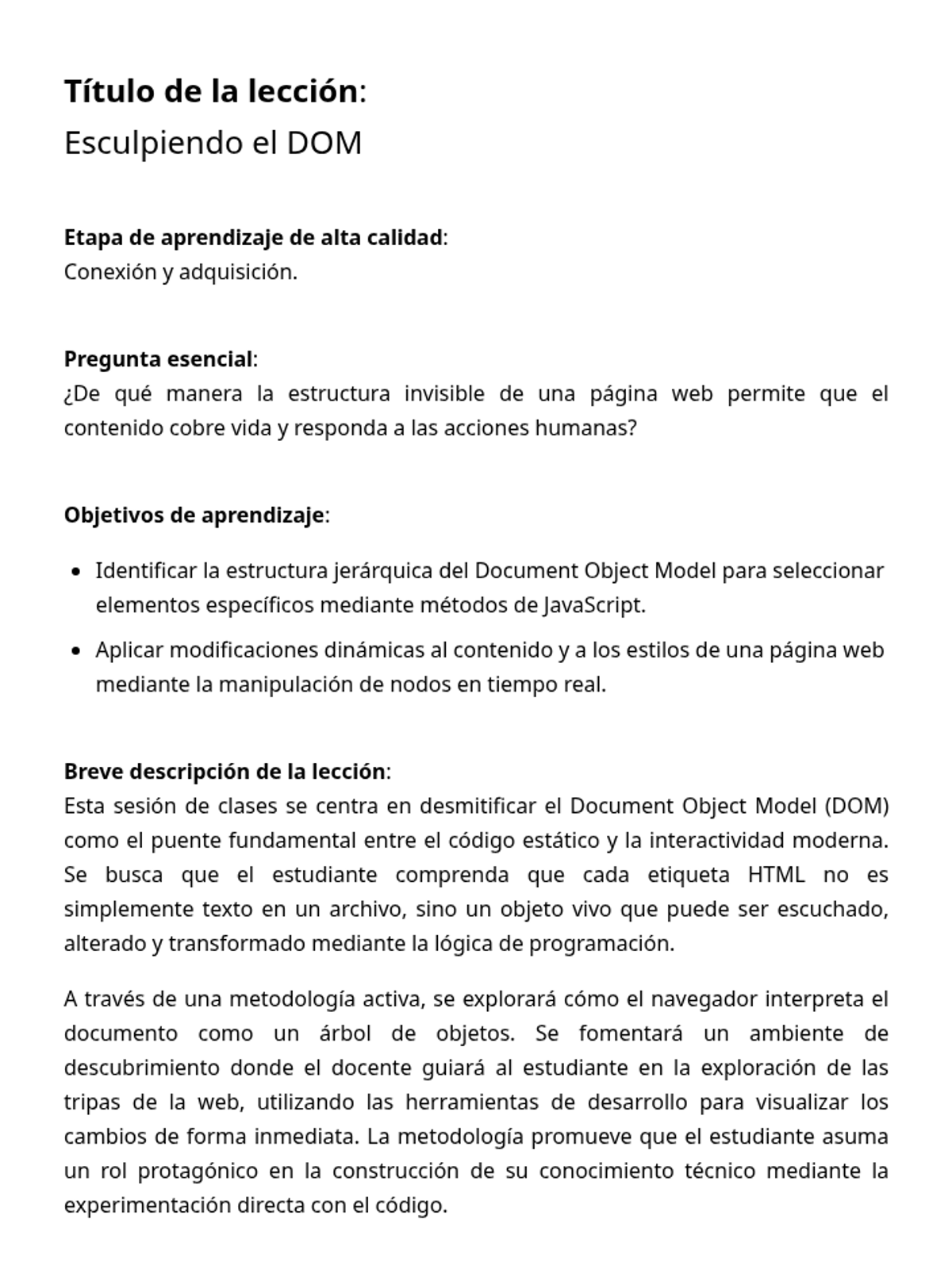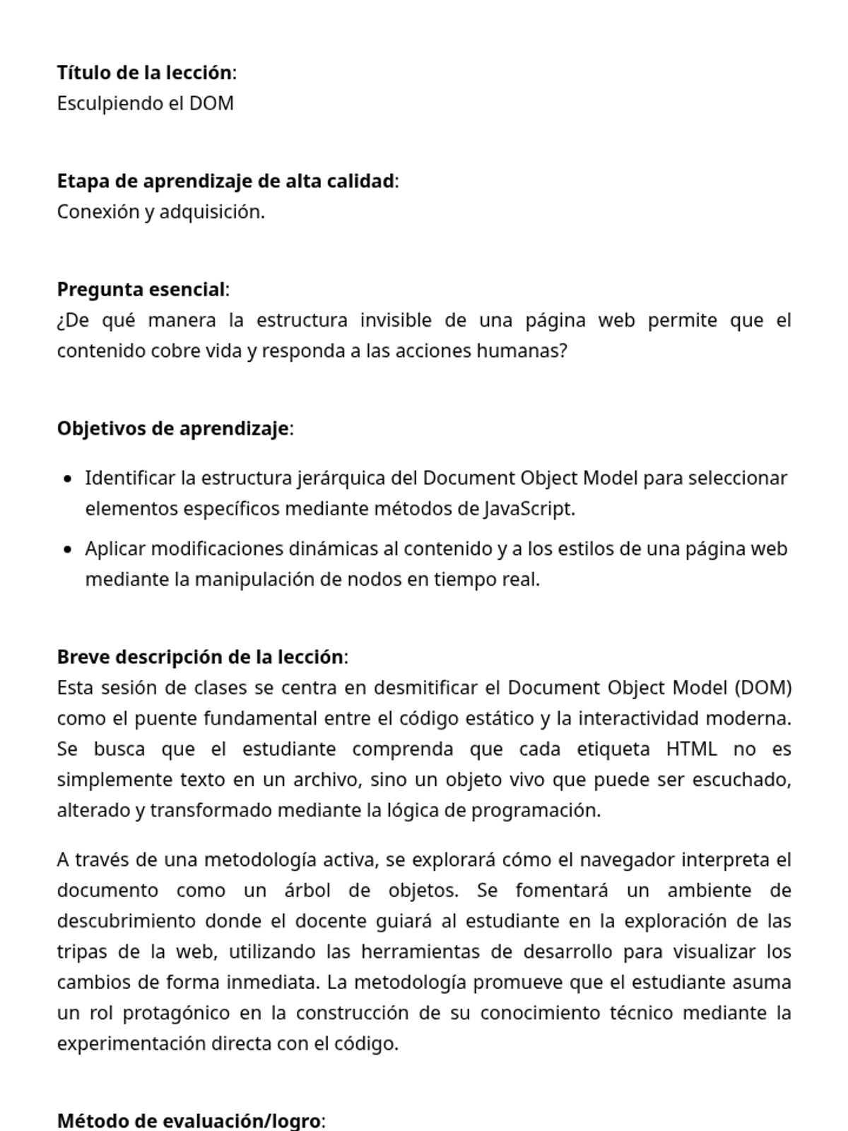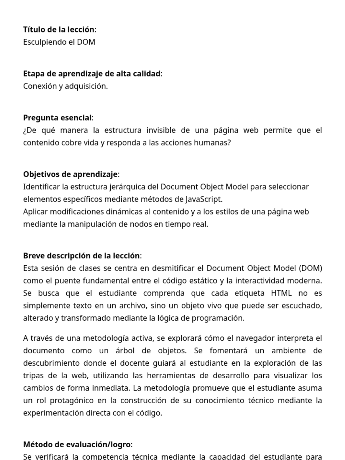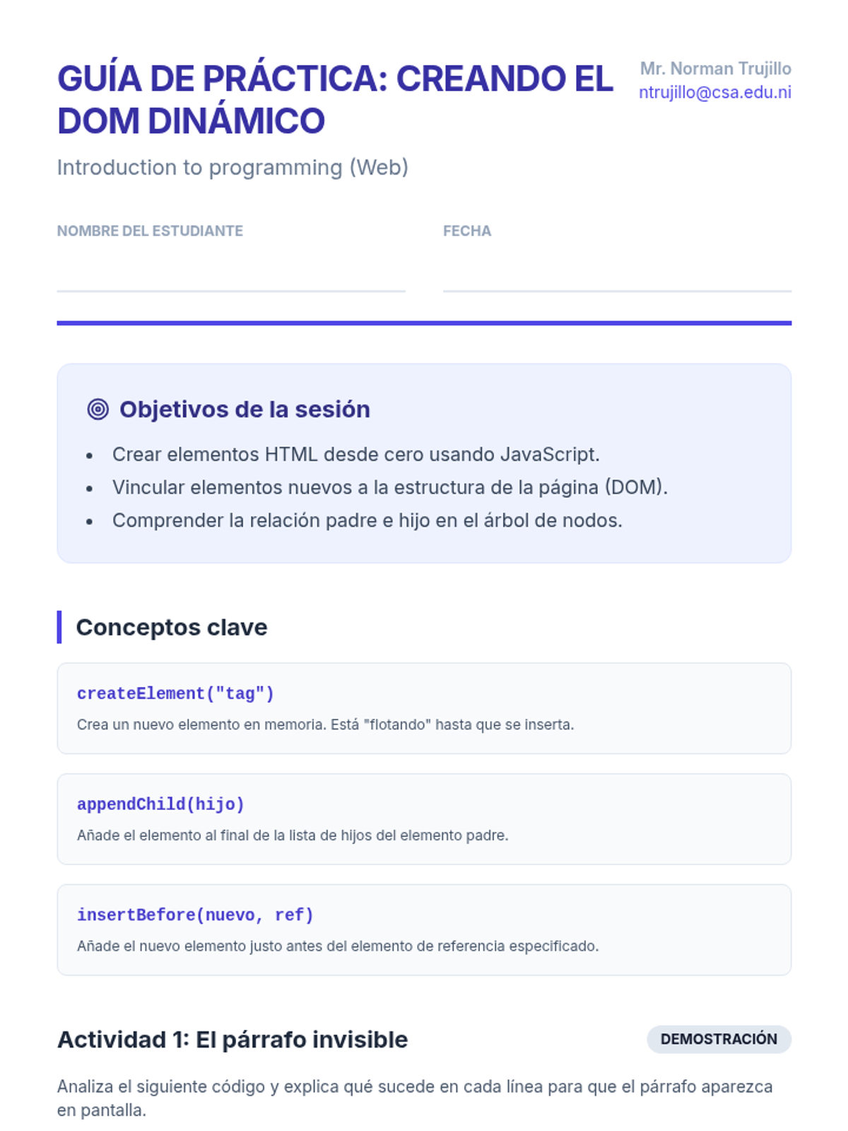 En esta sesión, los estudiantes aprenderán a dinamizar páginas web mediante la creación y adición de elementos al DOM utilizando JavaScript. Se explorarán métodos como createElement, appendChild e insertBefore para construir interfaces interactivas desde cero.