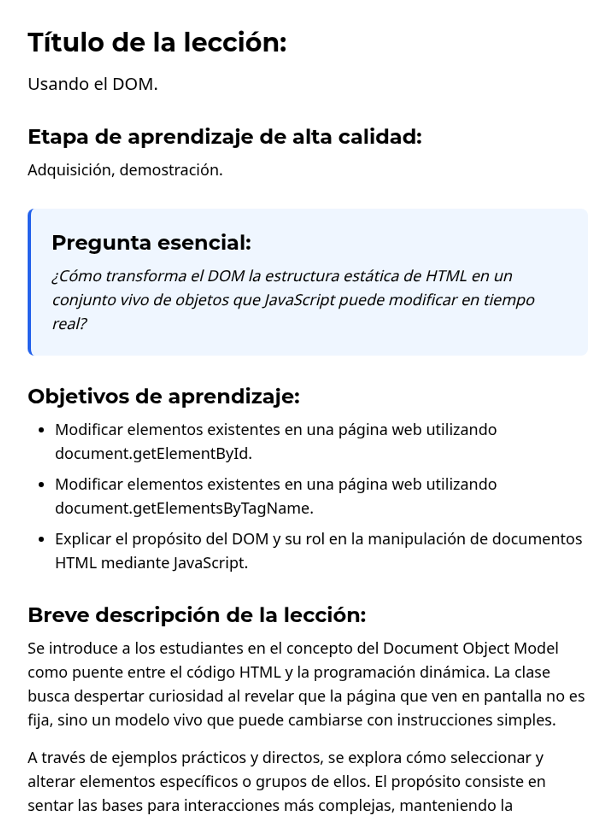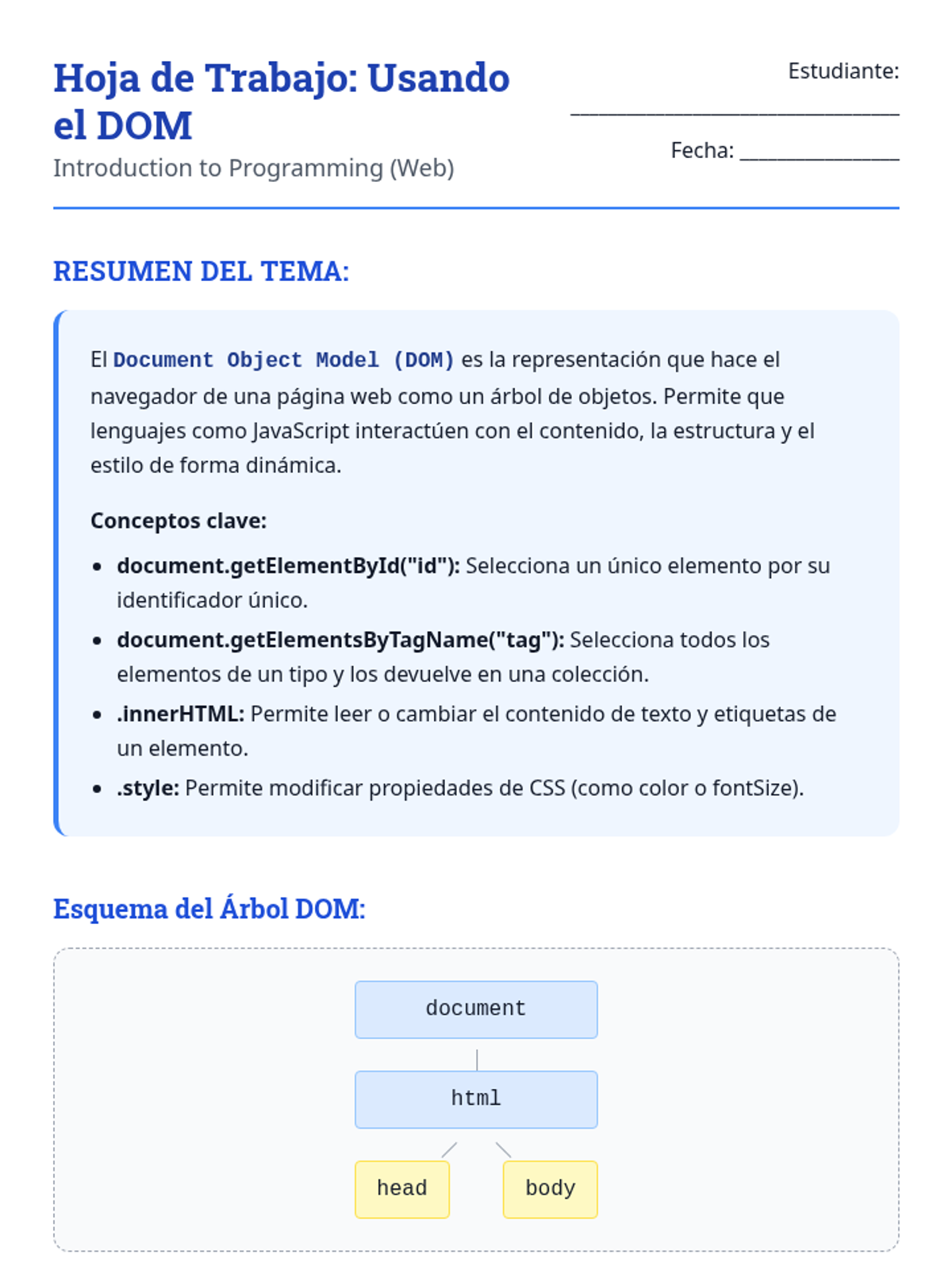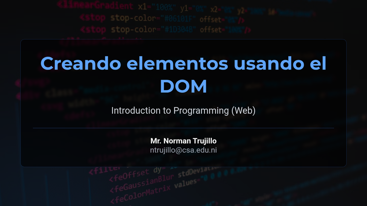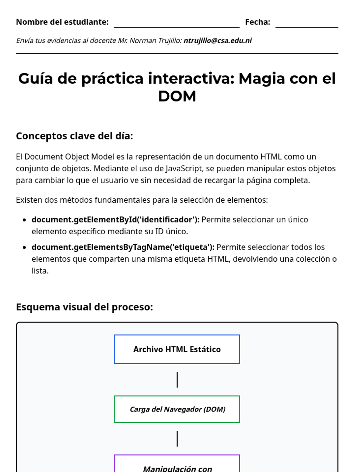 En esta sesión, los estudiantes aprenderán a dinamizar páginas web mediante la creación y adición de elementos al DOM utilizando JavaScript. Se explorarán métodos como createElement, appendChild e insertBefore para construir interfaces interactivas desde cero.