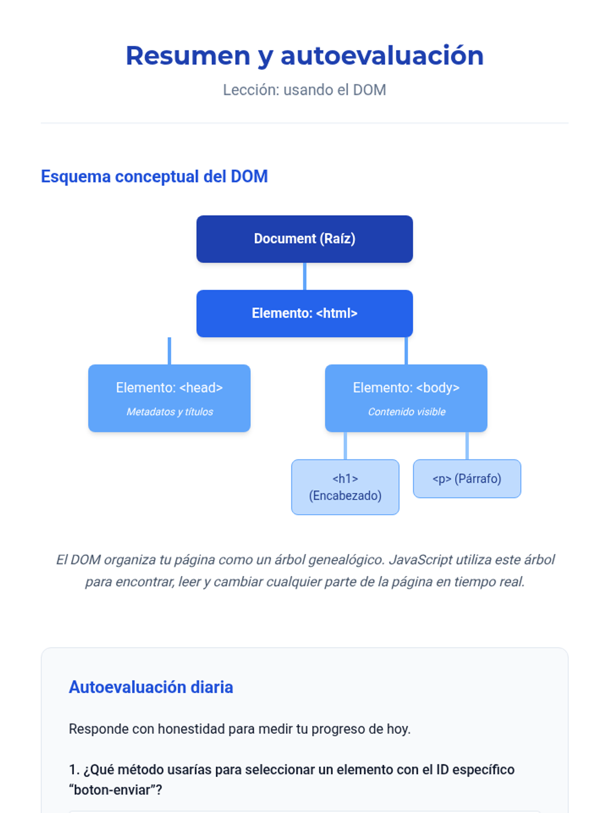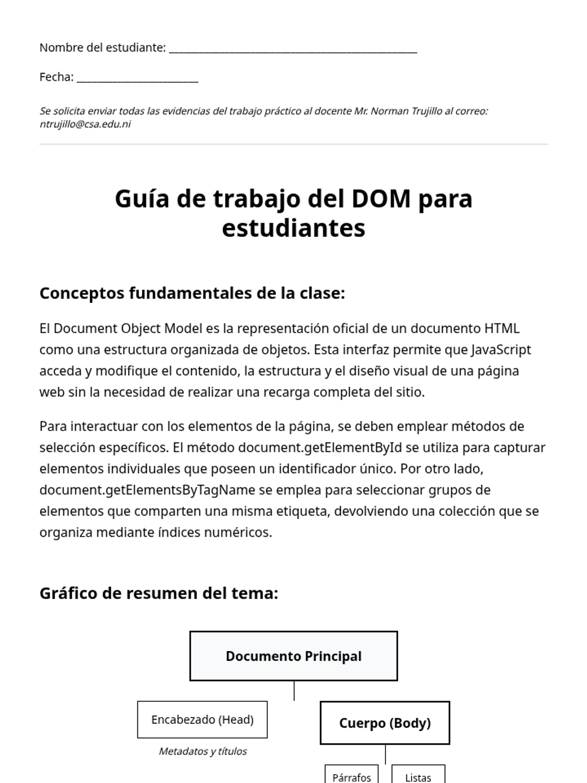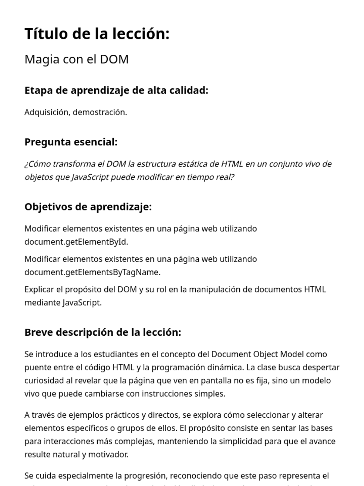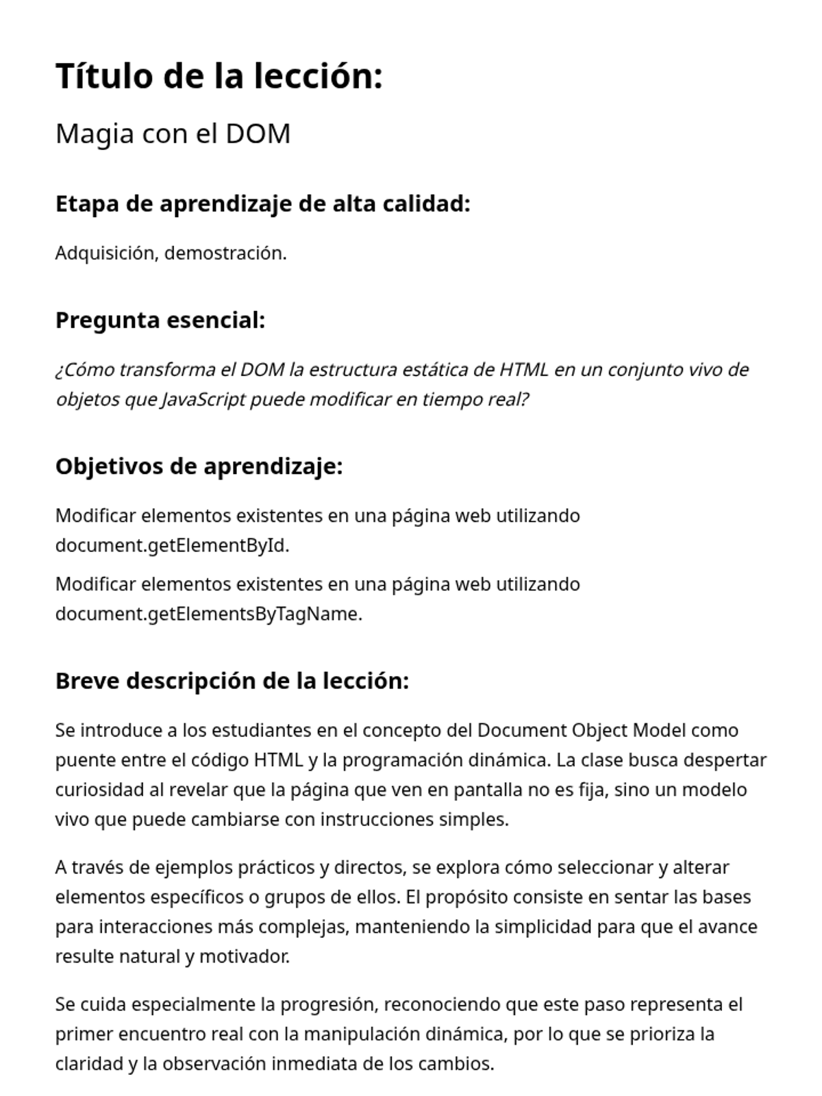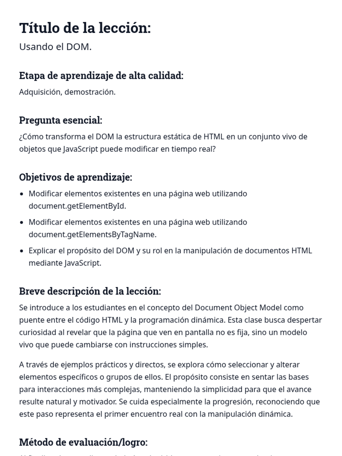 En esta sesión, los estudiantes aprenderán a dinamizar páginas web mediante la creación y adición de elementos al DOM utilizando JavaScript. Se explorarán métodos como createElement, appendChild e insertBefore para construir interfaces interactivas desde cero.