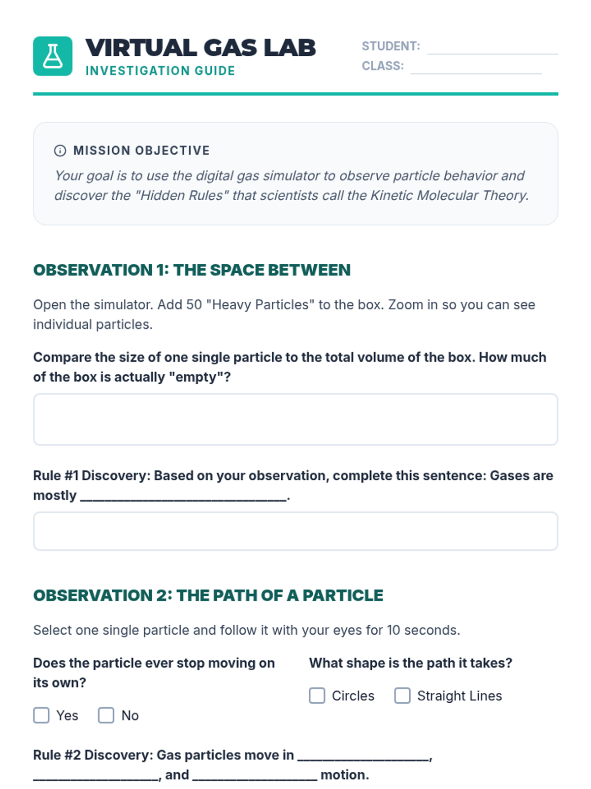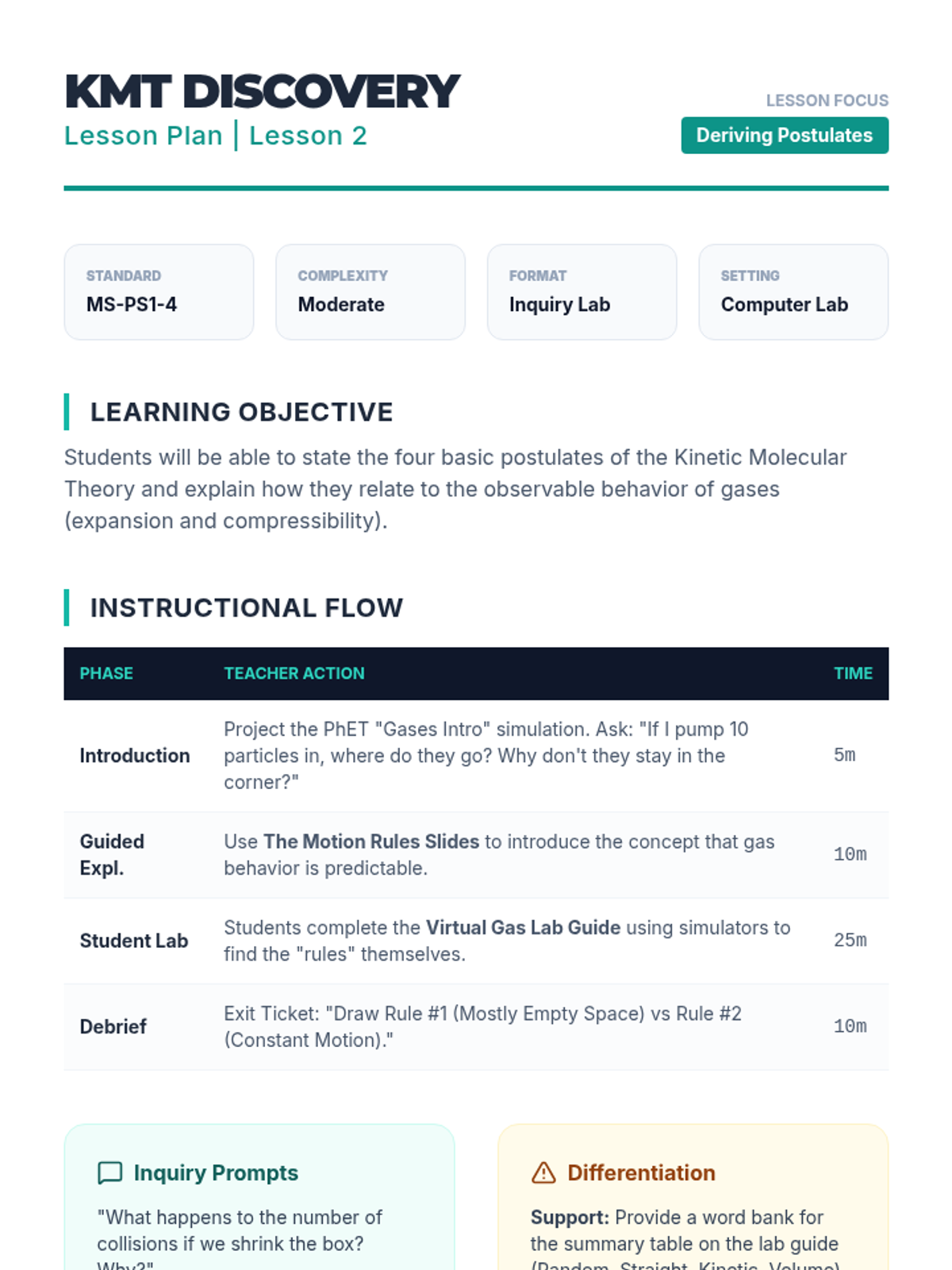 Through inquiry-based observation of gas simulations, students derive the basic postulates of Kinetic Molecular Theory, focusing on the constant, random motion of particles.