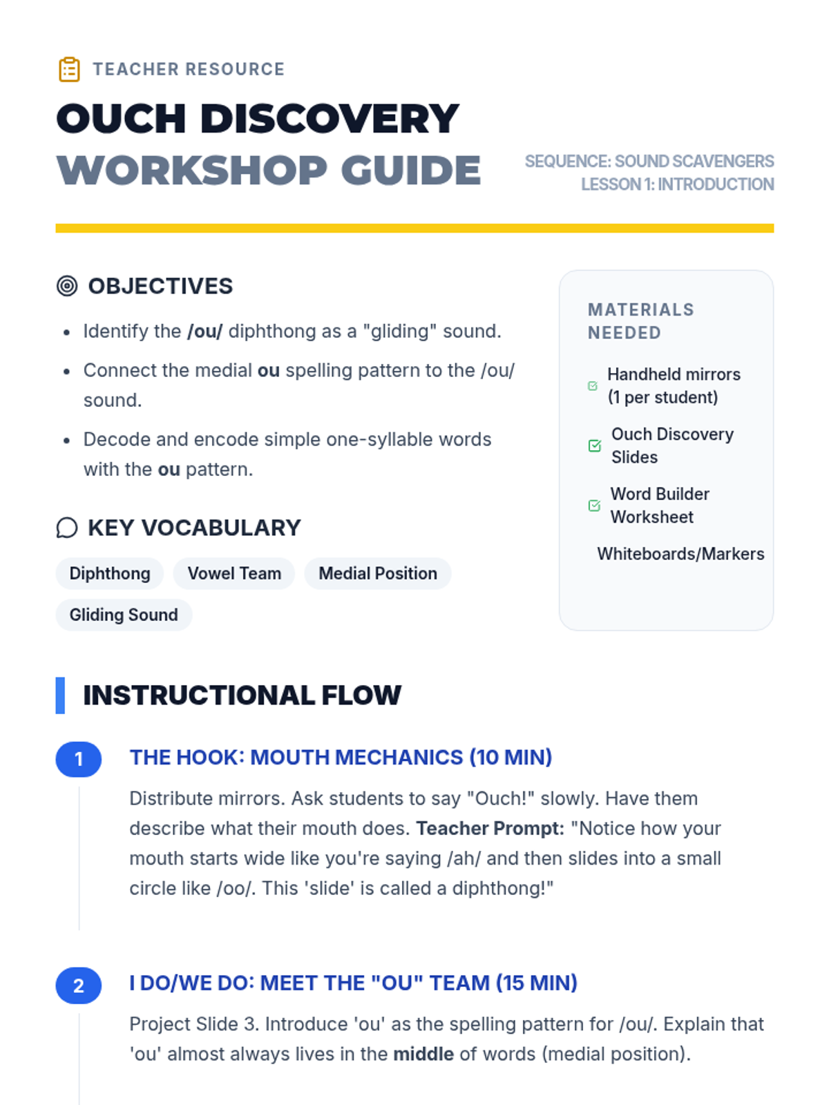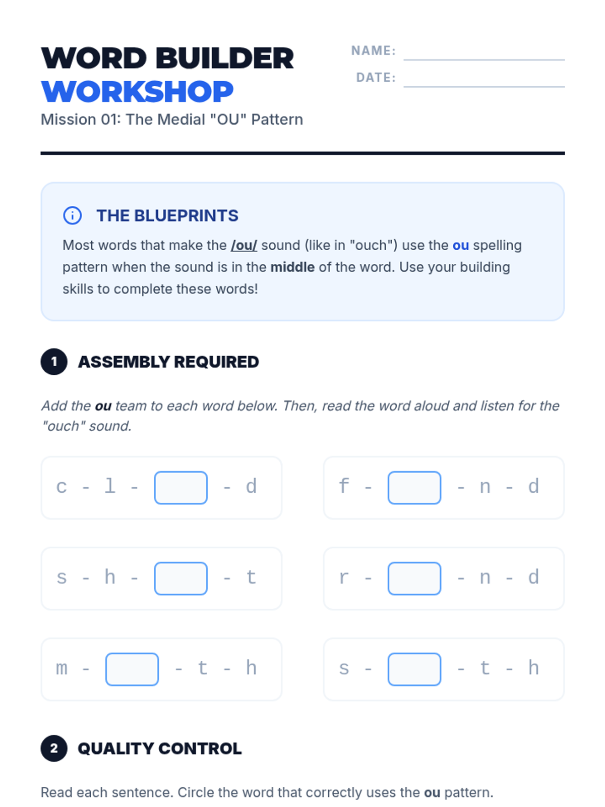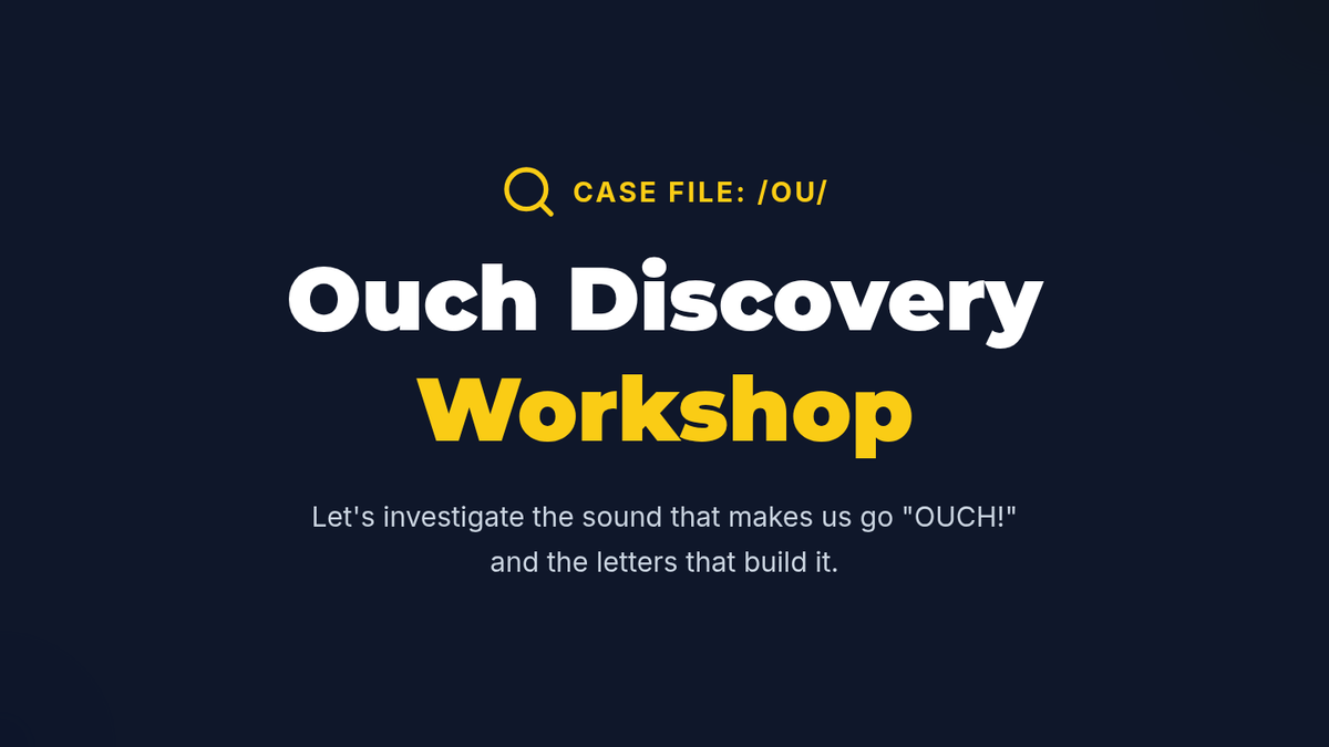 Students are introduced to the /ou/ sound (as in 'ouch') and the 'ou' spelling pattern typically found in the middle of words. Through a 'word building' workshop, they construct words like 'cloud,' 'shout,' and 'found.'