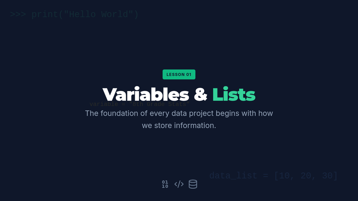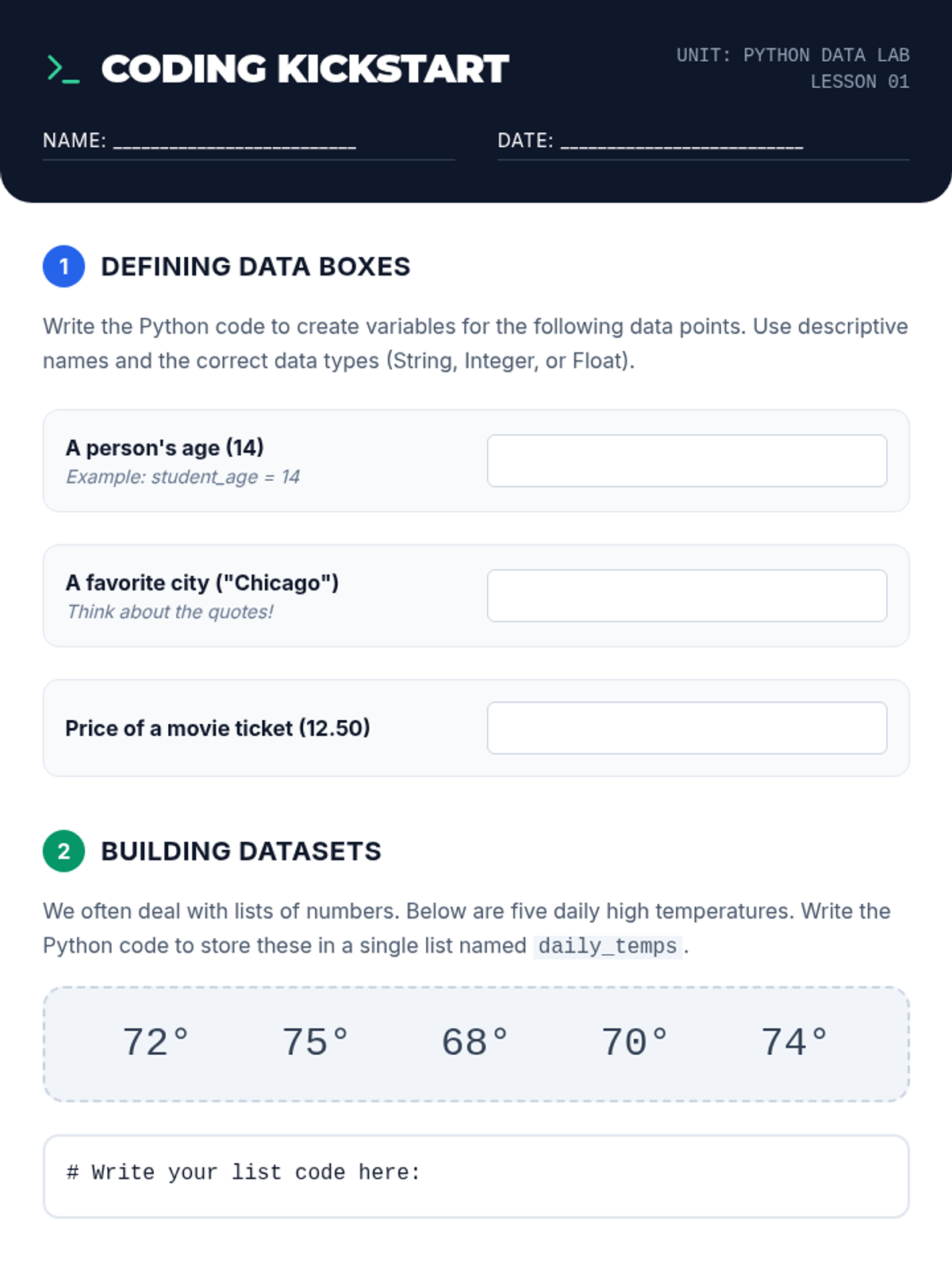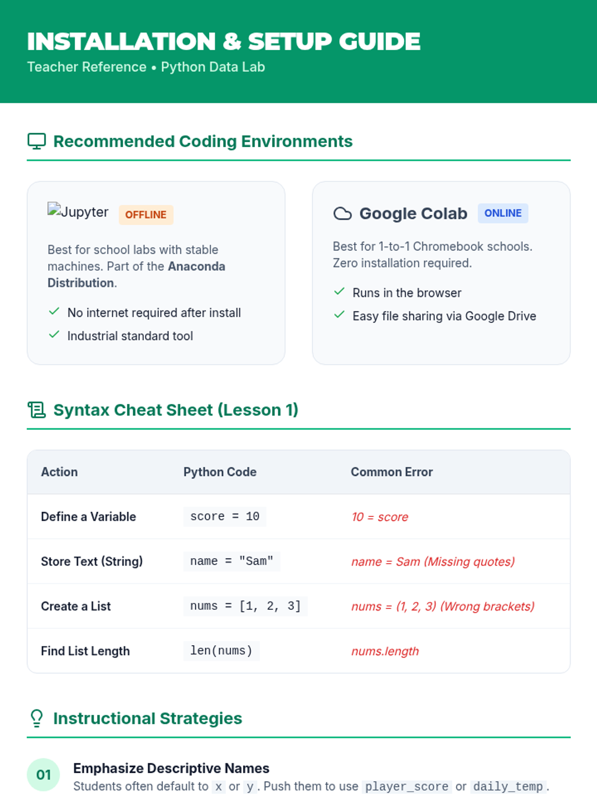 Students set up their coding environment and learn basic Python syntax for variables and lists, using data like temperatures and scores.
