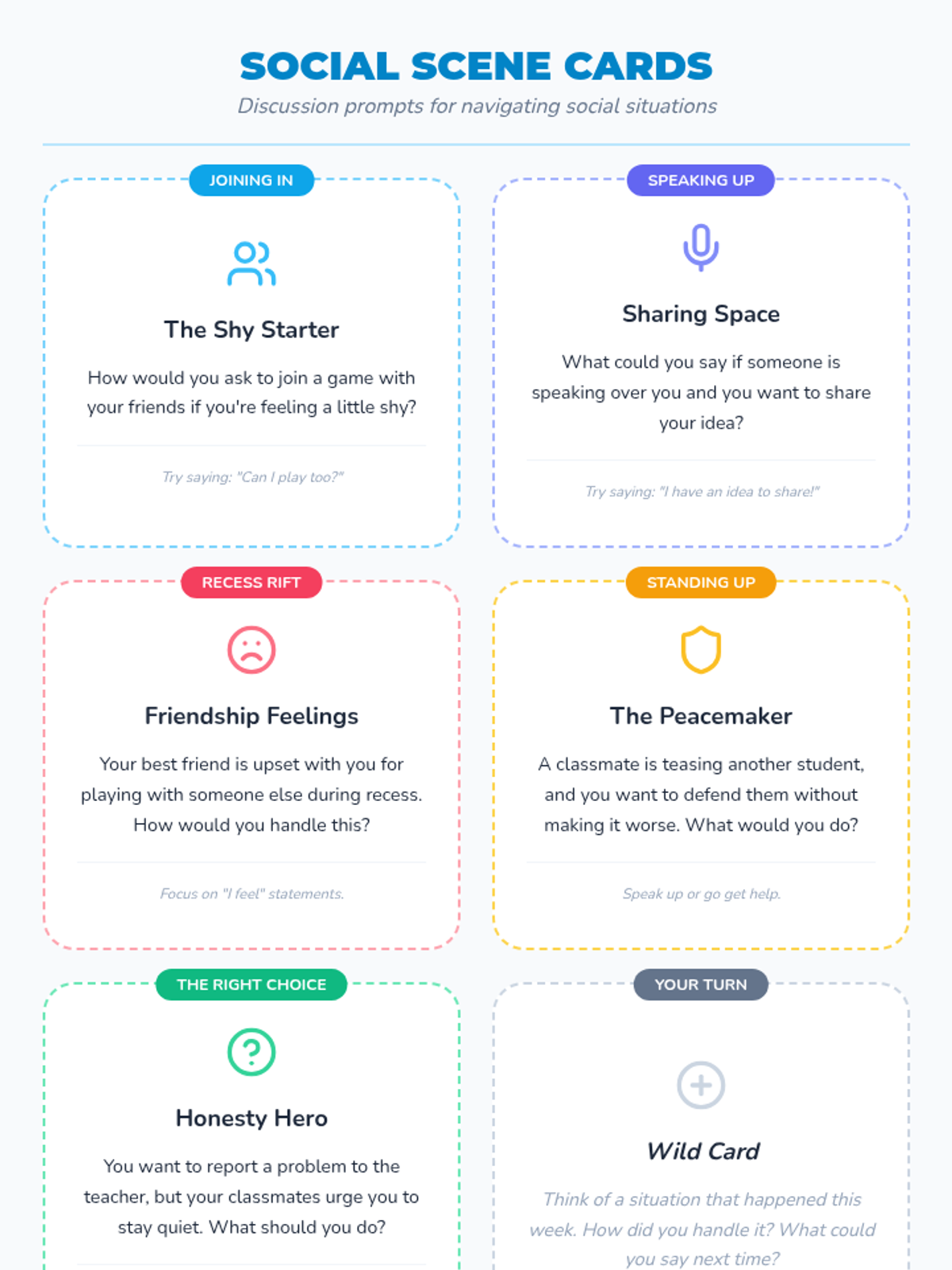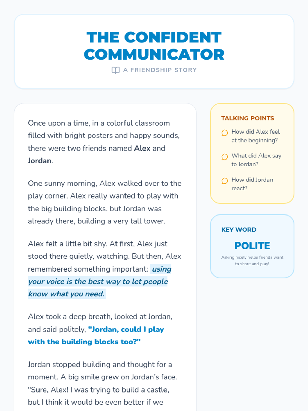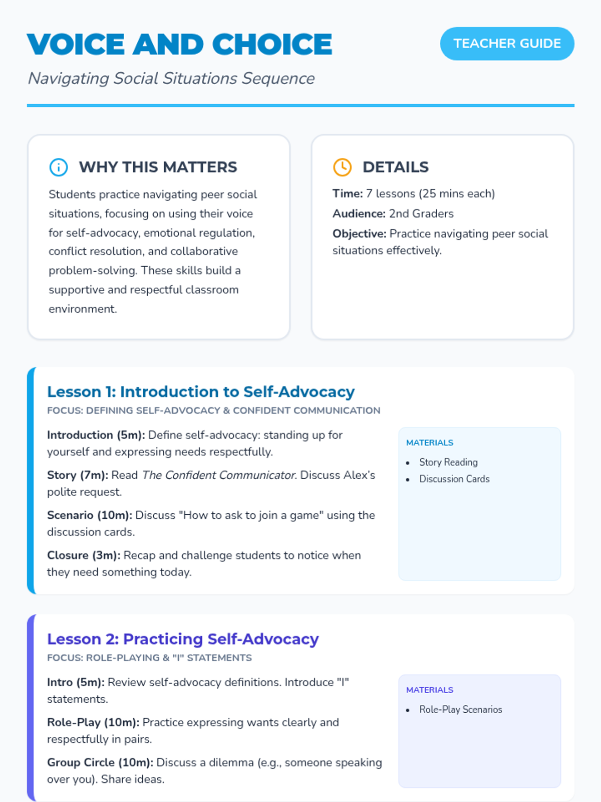 Students are introduced to the concept of self-advocacy through a story about Alex and Jordan, discussing how to express needs and wants respectfully.
