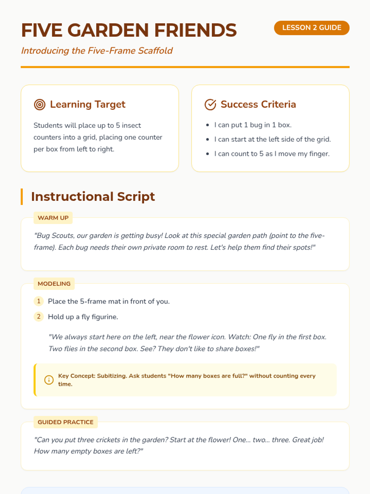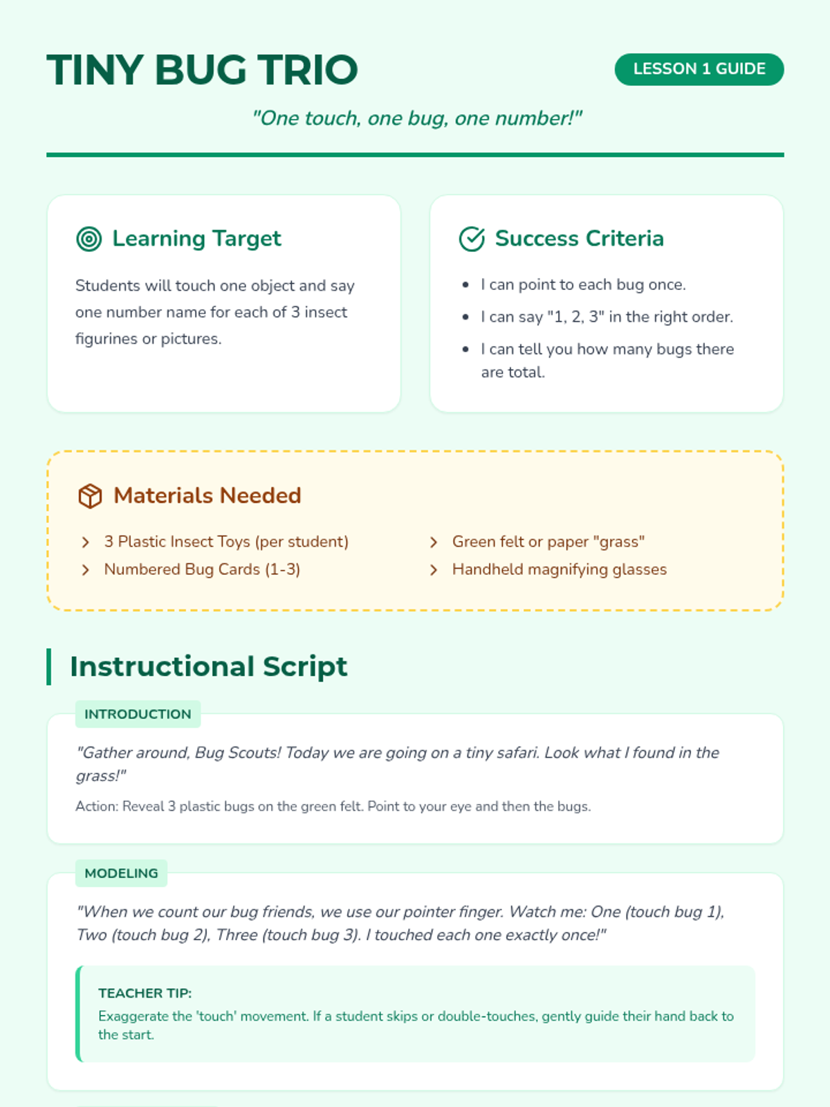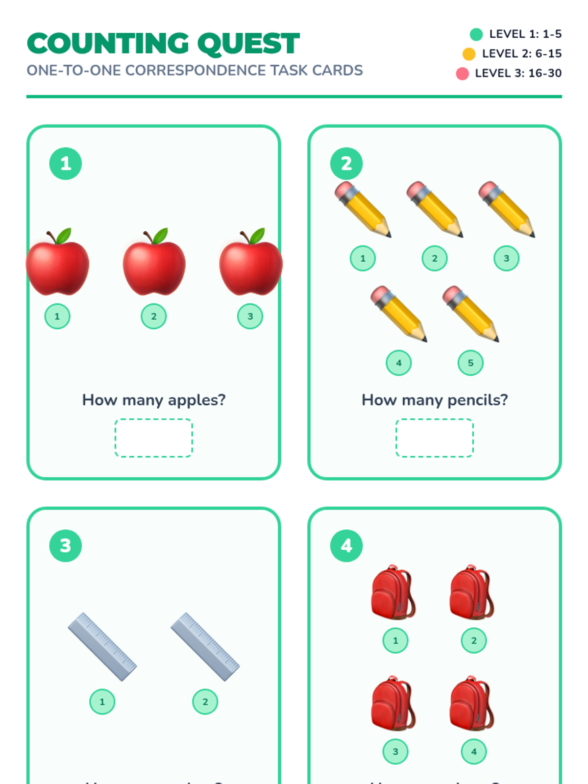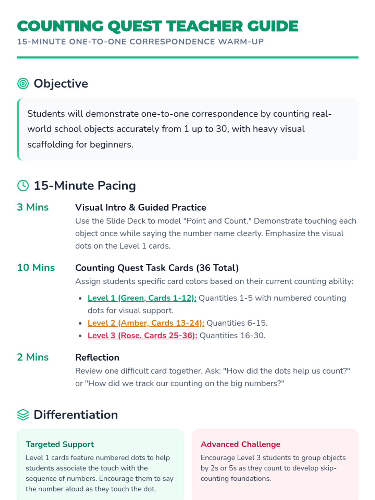 A quick 15-minute warm-up activity where students practice one-to-one correspondence by counting school-themed objects. The lesson is scaffolded with three levels of difficulty, ranging from numbers 1-5 to numbers up to 30.