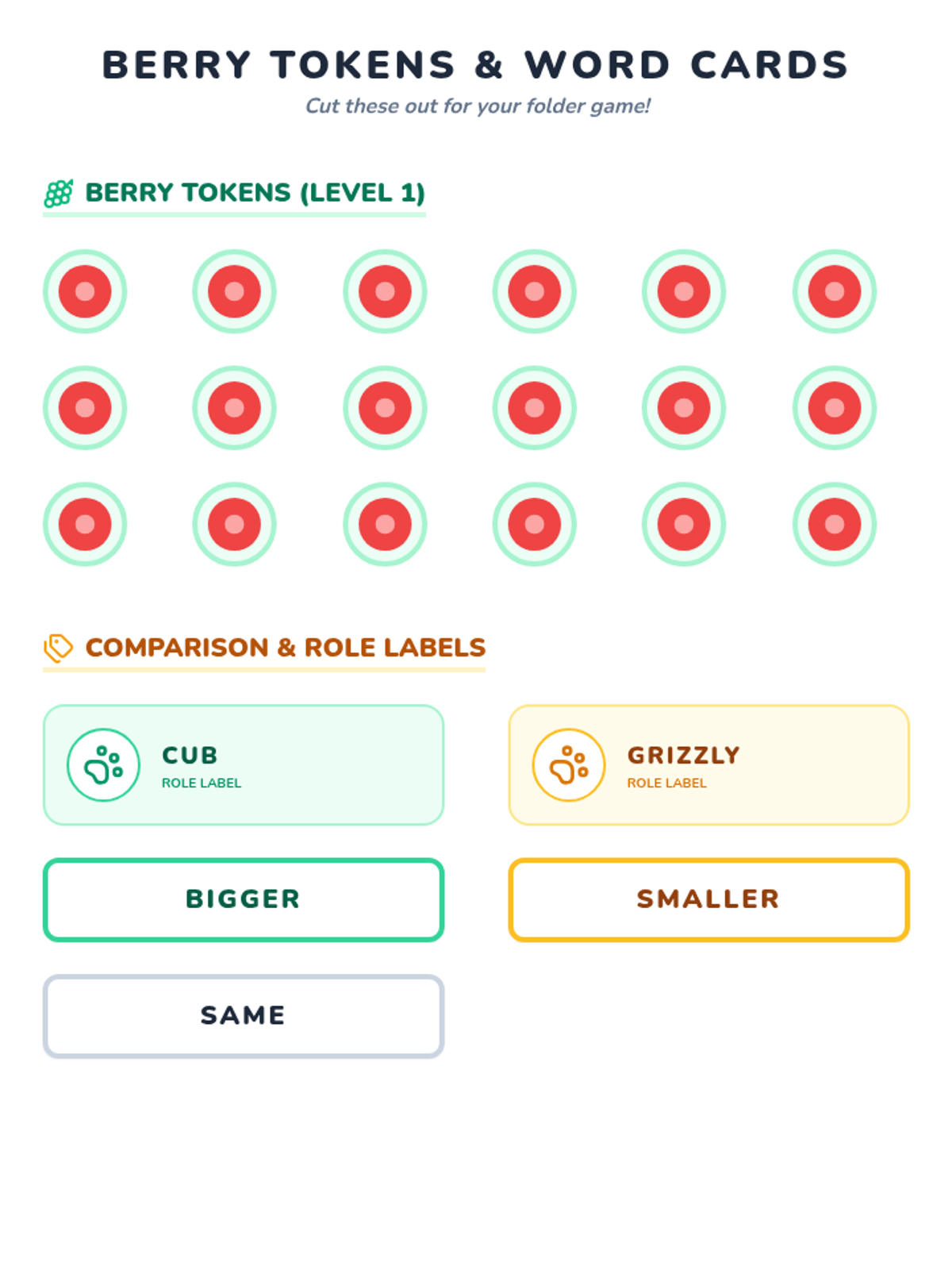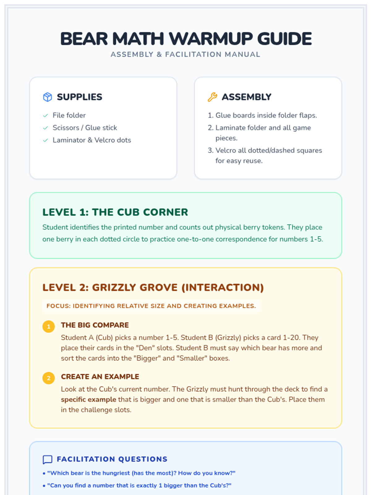 A bear-themed file folder game designed for differentiated morning warm-ups, focusing on one-to-one correspondence (1-5) and number comparison (up to 20).