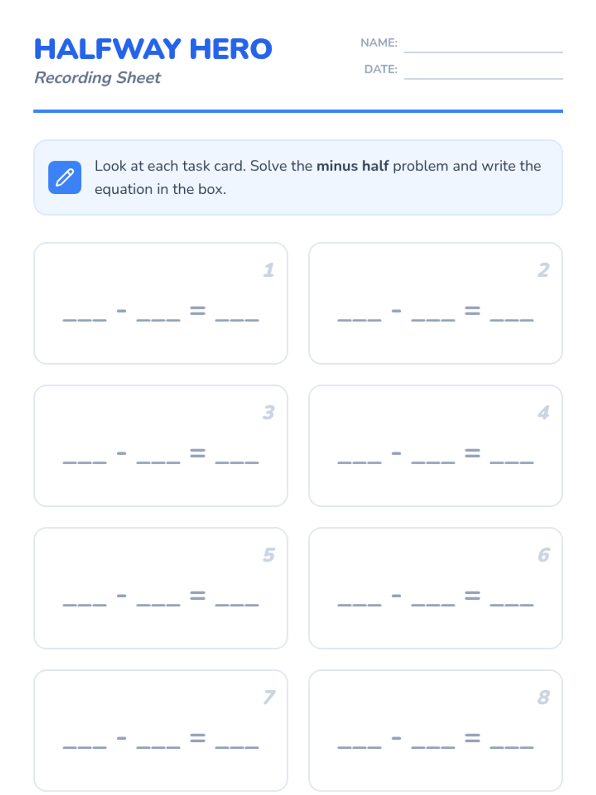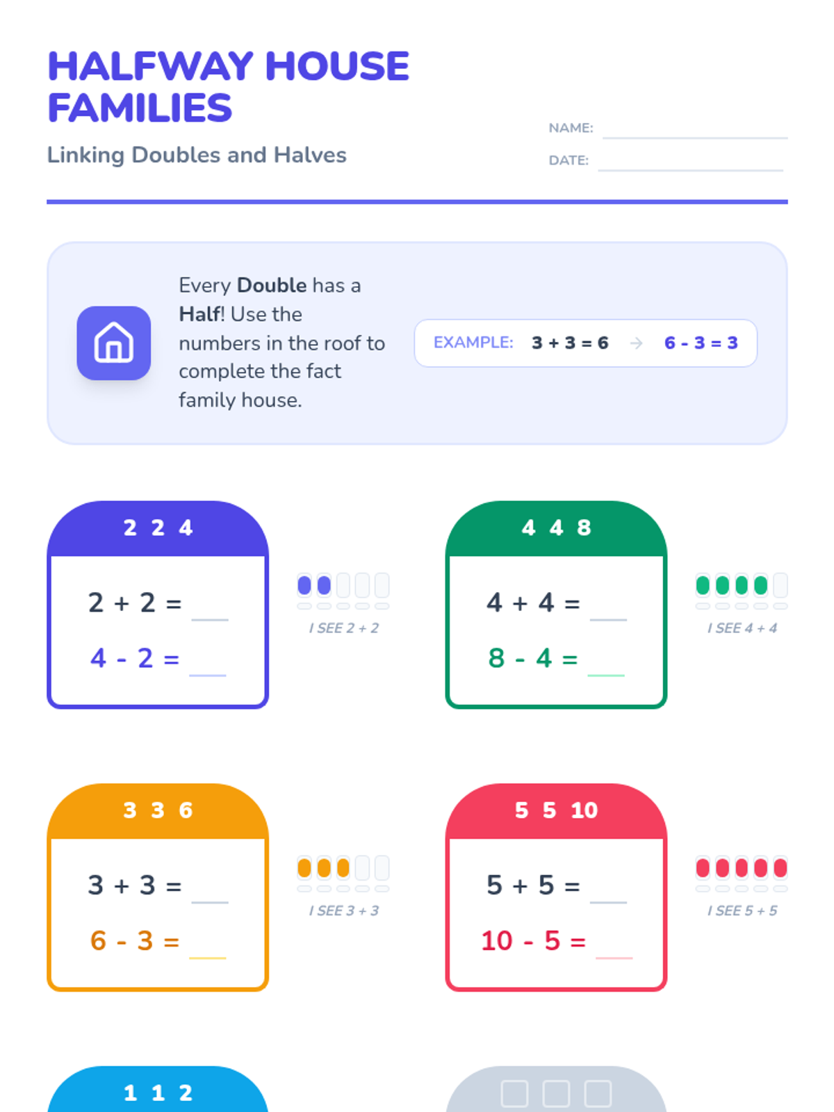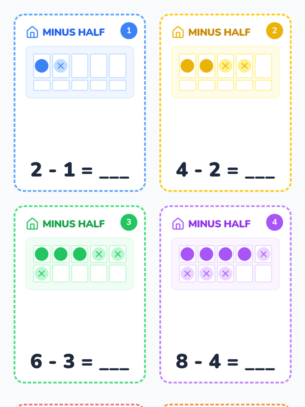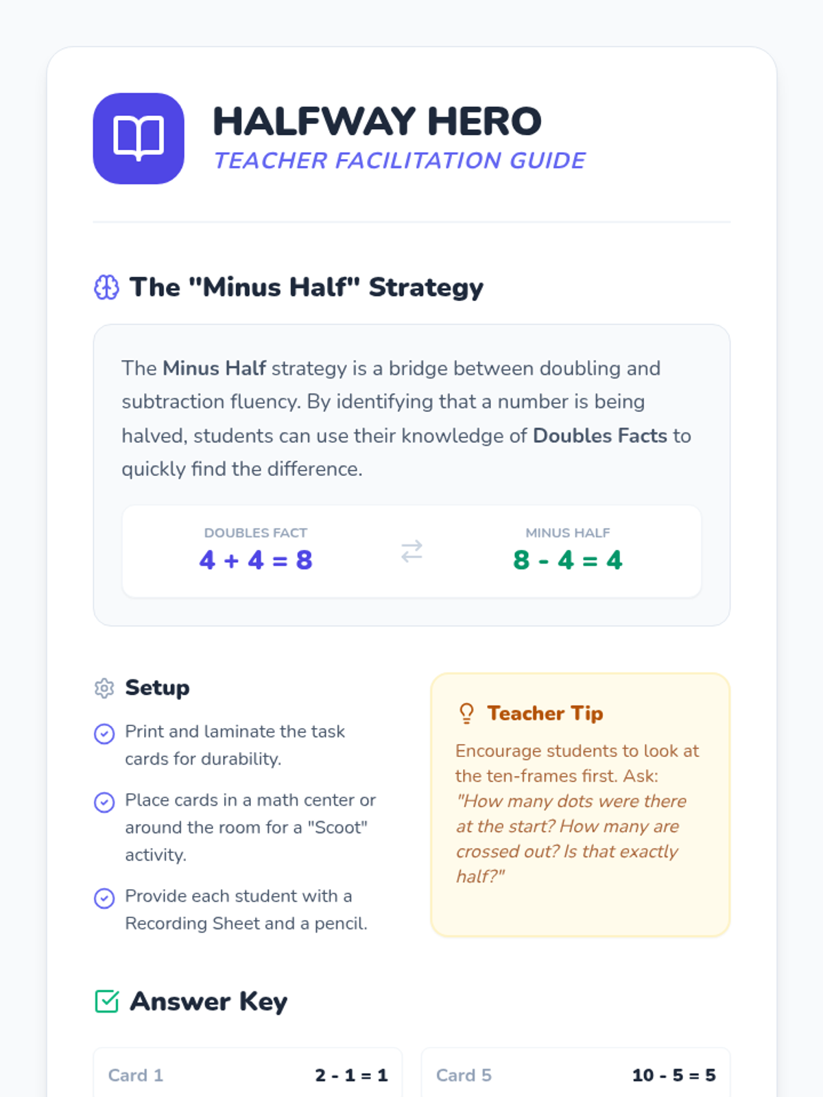 Students master the 'minus half' subtraction strategy for numbers up to 10 using ten-frame visuals. This lesson builds on doubling knowledge to strengthen subtraction fluency through hands-on task cards.